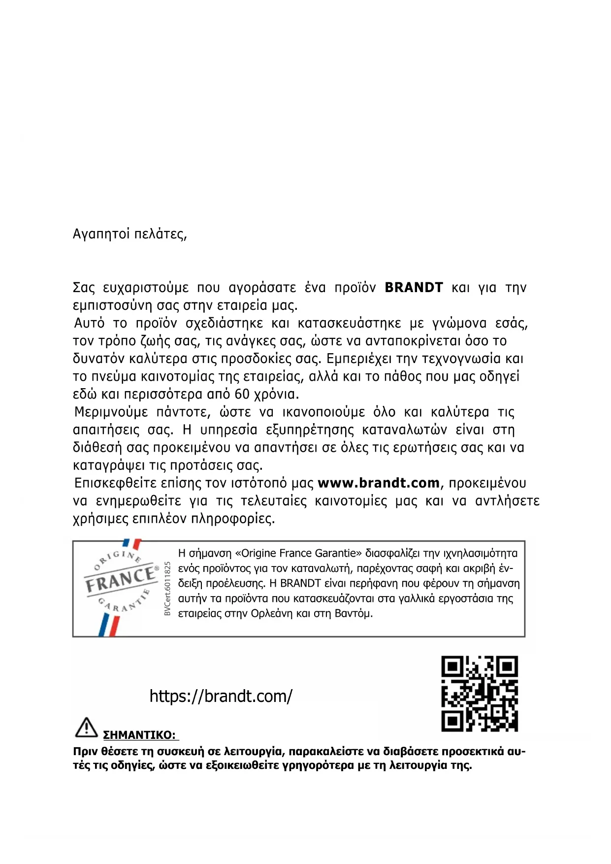 - Πριν θέσετε τη συσκευή σε λειτουργία, παρακαλείστε να διαβάσετε προσεκτικά αυ- τές τις οδηγίες, ώστε να εξοικειωθείτε γρηγορότερα με τη λειτουργία της. Η σήμανση «Origine France Garantie» διασφαλίζει την ιχνηλασιμότητα ενός προϊόντος για τον καταναλωτή, παρέχοντας σαφή και ακριβή έν- δειξη προέλευσης. Η BRANDT είναι περήφανη που φέρουν τη σήμανση αυτήν τα προϊόντα που κατασκευάζονται στα γαλλικά εργοστάσια της εταιρείας στην Ορλεάνη και στη Βαντόμ. Αγαπητοί πελάτες, Σας ευχαριστούμε που αγοράσατε ένα προϊόν BRANDT και για την εμπιστοσύνη σας στην εταιρεία μας. Αυτό το προϊόν σχεδιάστηκε και κατασκευάστηκε με γνώμονα εσάς, τον τρόπο ζωής σας, τις ανάγκες σας, ώστε να ανταποκρίνεται όσο το δυνατόν καλύτερα στις προσδοκίες σας. Εμπεριέχει την τεχνογνωσία και το πνεύμα καινοτομίας της εταιρείας, αλλά και το πάθος που μας οδηγεί εδώ και περισσότερα από 60 χρόνια. Μεριμνούμε πάντοτε, ώστε να ικανοποιούμε όλο και καλύτερα τις απαιτήσεις σας. Η υπηρεσία εξυπηρέτησης καταναλωτών είναι στη διάθεσή σας προκειμένου να απαντήσει σε όλες τις ερωτήσεις σας και να καταγράψει τις προτάσεις σας. Επισκεφθείτε επίσης τον ιστότοπό μας www.brandt.com, προκειμένου να ενημερωθείτε για τις τελευταίες καινοτομίες μας και να αντλήσετε χρήσιμες επιπλέον πληροφορίες.3 Πίνακας περιεχομένων Οδηγίες ασφαλείας p. 4
