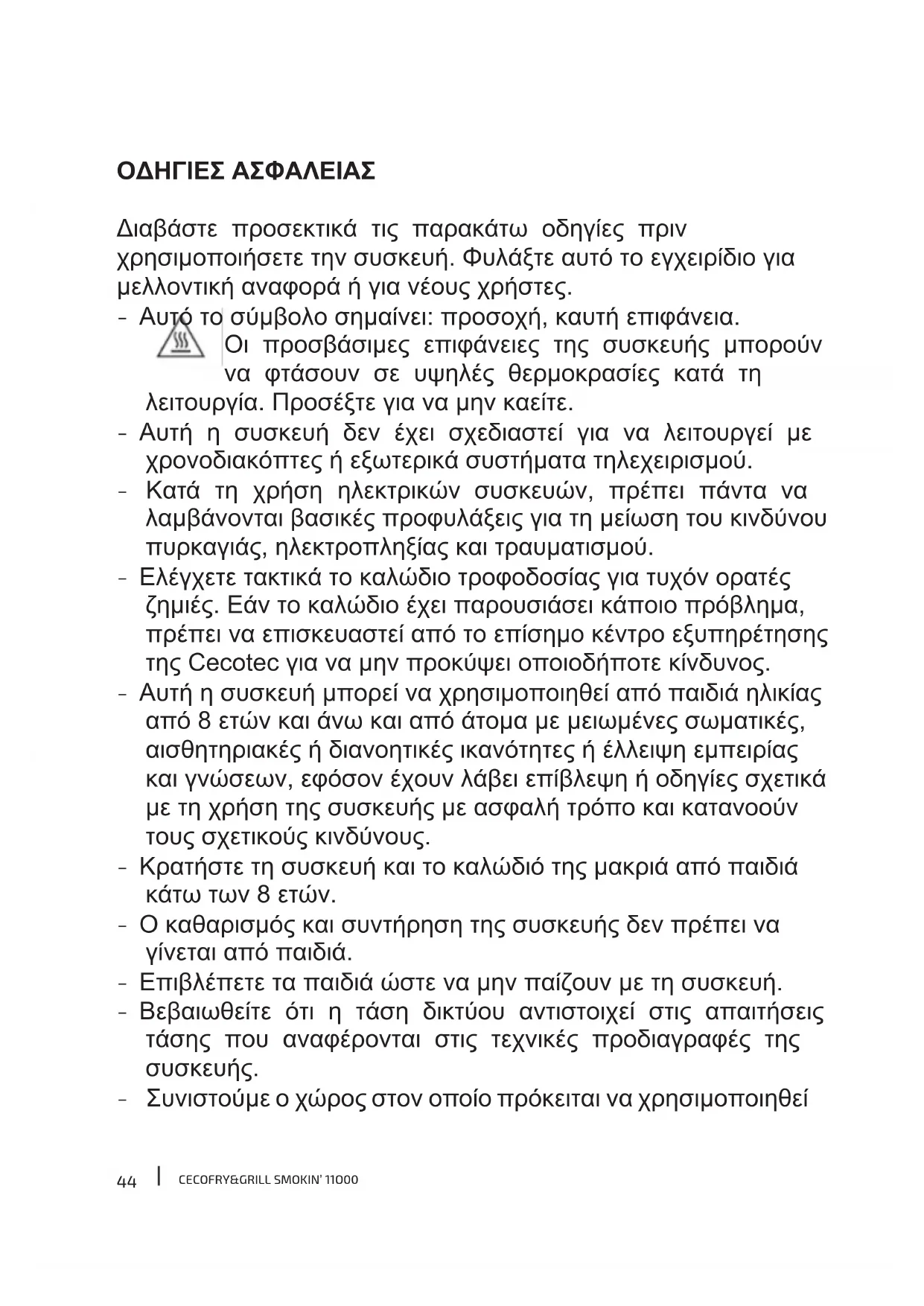ΟΔΗΓΊΕΣ ΑΣΦΑΛΕΊΑΣ Διαβάστε προσεκτικά τις παρακάτω οδηγίες πριν χρησιμοποιήσετε την συσκευή. Φυλάξτε αυτό το εγχειρίδιο για μελλοντική αναφορά ή για νέους χρήστες. - Αυτό το σύμβολο σημαίνει: προσοχή, καυτή επιφάνεια. Οι προσβάσιμες επιφάνειες της συσκευής μπορούν να φτάσουν σε υψηλές θερμοκρασίες κατά τη λειτουργία. Προσέξτε για να μην καείτε. - Αυτή η συσκευή δεν έχει σχεδιαστεί για να λειτουργεί με χρονοδιακόπτες ή εξωτερικά συστήματα τηλεχειρισμού. - Κατά τη χρήση ηλεκτρικών συσκευών, πρέπει πάντα να λαμβάνονται βασικές προφυλάξεις για τη μείωση του κινδύνου πυρκαγιάς, ηλεκτροπληξίας και τραυματισμού. - Ελέγχετε τακτικά το καλώδιο τροφοδοσίας για τυχόν ορατές ζημιές. Εάν το καλώδιο έχει παρουσιάσει κάποιο πρόβλημα, πρέπει να επισκευαστεί από το επίσημο κέντρο εξυπηρέτησης της Cecotec για να μην προκύψει οποιοδήποτε κίνδυνος. - Αυτή η συσκευή μπορεί να χρησιμοποιηθεί από παιδιά ηλικίας από 8 ετών και άνω και από άτομα με μειωμένες σωματικές, αισθητηριακές ή διανοητικές ικανότητες ή έλλειψη εμπειρίας και γνώσεων, εφόσον έχουν λάβει επίβλεψη ή οδηγίες σχετικά με τη χρήση της συσκευής με ασφαλή τρόπο και κατανοούν τους σχετικούς κινδύνους. - Κρατήστε τη συσκευή και το καλώδιό της μακριά από παιδιά κάτω των 8 ετών. - Ο καθαρισμός και συντήρηση της συσκευής δεν πρέπει να γίνεται από παιδιά. - Επιβλέπετε τα παιδιά ώστε να μην παίζουν με τη συσκευή. - Βεβαιωθείτε ότι η τάση δικτύου αντιστοιχεί στις απαιτήσεις τάσης που αναφέρονται στις τεχνικές προδιαγραφές της