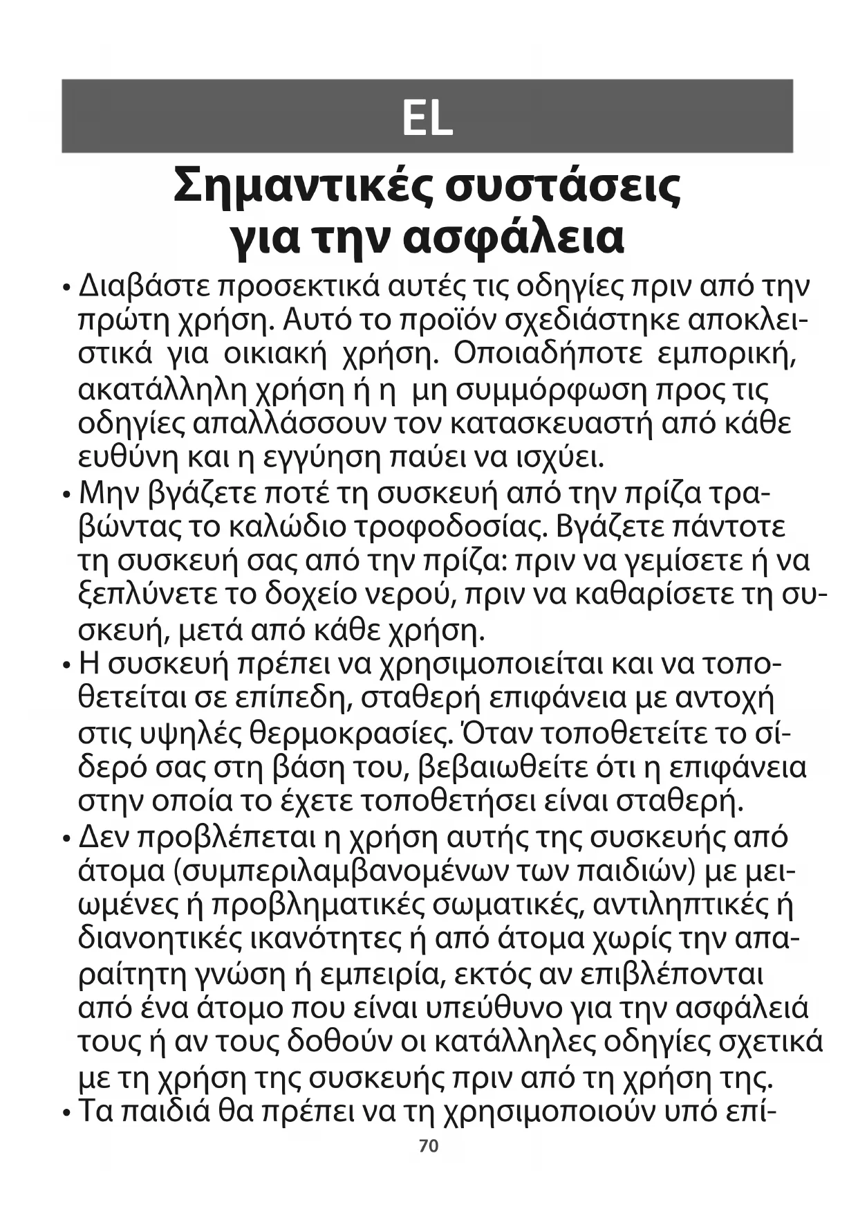 - Διαβάστε προσεκτικά αυτές τις οδηγίες πριν από την πρώτη χρήση. Αυτό το προϊόν σχεδιάστηκε αποκλει- στικά για οικιακή χρήση. Οποιαδήποτε εμπορική, ακατάλληλη χρήση ή η μη συμμόρφωση προς τις οδηγίες απαλλάσσουν τον κατασκευαστή από κάθε ευθύνη και η εγγύηση παύει να ισχύει.