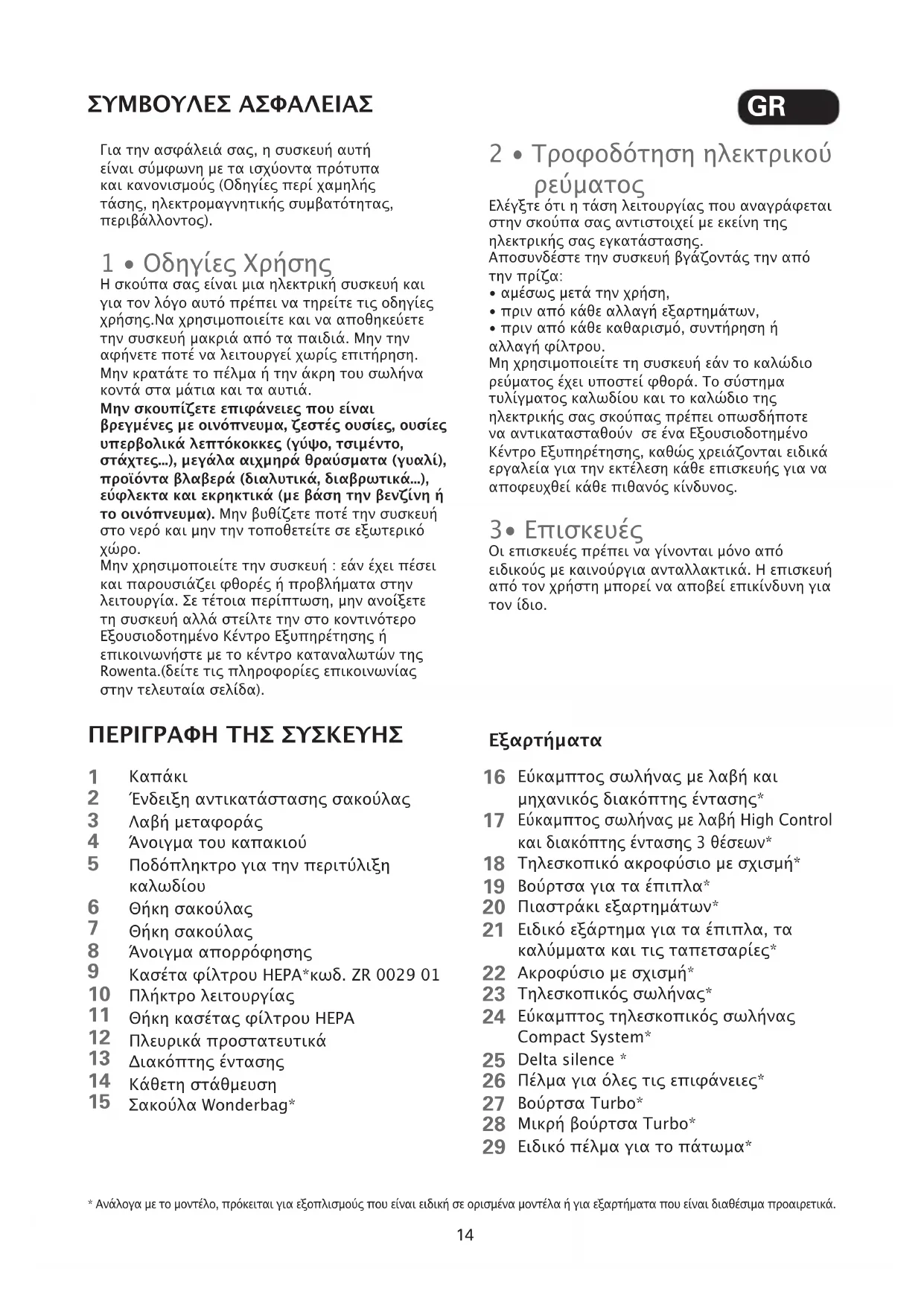 Ελέγξτε ότι η τάση λειτουργίας που αναγράφεται στην σκούπα σας αντιστοιχεί με εκείνη της ηλεκτρικής σας εγκατάστασης.Αποσυνδέστε την συσκευή βγάζοντάς την από την πρίζα:• αμέσως μετά την χρήση,• πριν από κάθε αλλαγή εξαρτημάτων,• πριν από κάθε καθαρισμό, συντήρηση ή αλλαγή φίλτρου.Μη χρησιμοποιείτε τη συσκευή εάν το καλώδιο ρεύματος έχει υποστεί φθορά. Το σύστημα τυλίγματος καλωδίου και το καλώδιο της ηλεκτρικής σας σκούπας πρέπει οπωσδήποτε να αντικατασταθούν σε ένα Εξουσιοδοτημένο Κέντρο Εξυπηρέτησης, καθώς χρειάζονται ειδικά εργαλεία για την εκτέλεση κάθε επισκευής για να αποφευχθεί κάθε πιθανός κίνδυνος. 3• Επισκευές Οι επισκευές πρέπει να γίνονται μόνο από ειδικούς με καινούργια ανταλλακτικά. Η επισκευή από τον χρήστη μπορεί να αποβεί επικίνδυνη για τον ίδιο. ΣΥΜΒΟΥΛΕΣ ΑΣΦΑΛΕΙΑΣ ΠΕΡΙΓΡΑΦΗ ΤΗΣ ΣΥΣΚΕΥΗΣ ΚαπάκιΈνδειξη αντικατάστασης σακούλαςΛαβή μεταφοράςΆνοιγμα του καπακιούΠοδόπληκτρο για την περιτύλιξη καλωδίουΘήκη σακούλαςΘήκη σακούλαςΆνοιγμα απορρόφησηςΚασέτα φίλτρου HEPA*κωδ. ZR 0029 01Πλήκτρο λειτουργίαςΘήκη κασέτας φίλτρου HEPAΠλευρικά προστατευτικάΔιακόπτης έντασηςΚάθετη στάθμευσηΣακούλα Wonderbag*Εύκαμπτος σωλήνας με λαβή και μηχανικός διακόπτης έντασης*Εύκαμπτος σωλήνας με λαβή High Control και διακόπτης έντασης 3 θέσεων*Τηλεσκοπικό ακροφύσιο με σχισμή*Βούρτσα για τα έπιπλα*Πιαστράκι εξαρτημάτων*Ειδικό εξάρτημα για τα έπιπλα, τα καλύμματα και τις ταπετσαρίες*Ακροφύσιο με σχισμή*Τηλεσκοπικός σωλήνας*Εύκαμπτος τηλεσκοπικός σωλήνας Compact System*Delta silence *Πέλμα για όλες τις επιφάνειες*Βούρτσα Turbo*Μικρή βούρτσα Turbo*Ειδικό πέλμα για το πάτωμα*