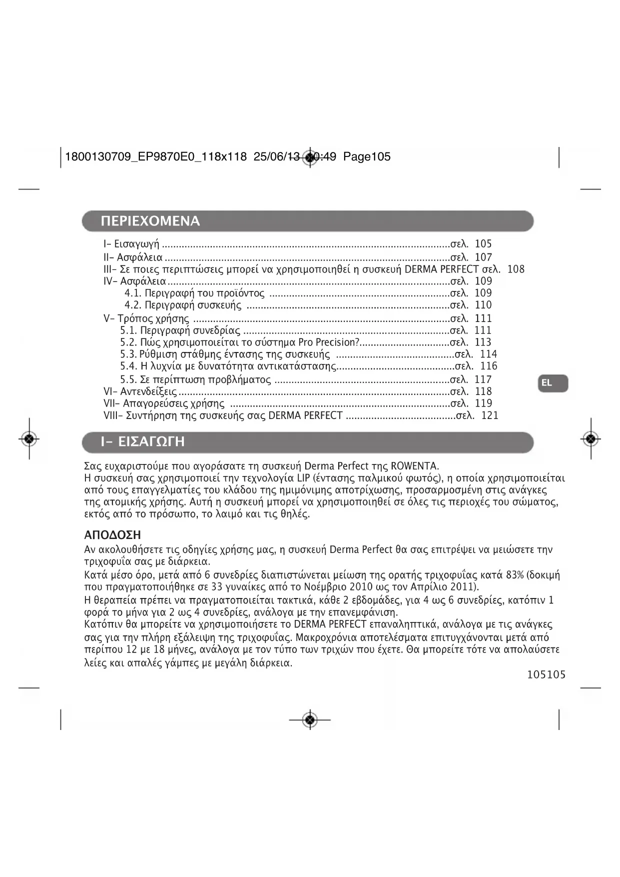 I- Εισαγωγή ......................................................................................................σελ. 105 II- Ασφάλεια .....................................................................................................σελ. 107 III- Σε ποιες περιπτώσεις μπορεί να χρησιμοποιηθεί η συσκευή DERMA PERFECT σελ. 108 IV- Ασφάλεια....................................................................................................σελ. 109 4.1. Περιγραφή του προϊόντος ................................................................σελ. 109 4.2. Περιγραφή συσκευής ........................................................................σελ. 110 V- Τρόπος χρήσης ...........................................................................................σελ. 111 5.1. Περιγραφή συνεδρίας .........................................................................σελ. 111 5.2. Πώς χρησιμοποιείται το σύστημα Pro Precision?................................σελ. 113