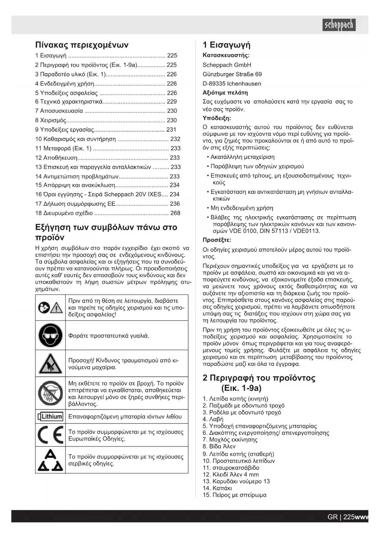 15 Όροι εγγύησης - Σειρά Scheppach 20V IXES Ημερομηνία αναθεώρησης 25/04/2024 Αγαπητή πελάτισσα, αγαπητέ πελάτη, τα προϊόντα μας υποβάλλονται σε αυστηρό έλεγχο ποιό- τητας. Αν ωστόσο, ένα προϊόν δεν λειτουργεί άψογα, λυ- πούμαστε πολύ γι' αυτό και σας ζητούμε να απευθυνθείτε στην Υπηρεσία Σέρβις της εταιρείας μας στη διεύθυνση που αναφέρεται παρακάτω. Με χαρά μας μπορούμε να σας εξυπηρετήσουμε και τηλεφωνικά μέσω του αριθμό τη- λεφώνου σέρβις. Οι υποδείξεις που ακολουθούν σκοπό έ- χουν να σας βοηθήσουν να ολοκληρωθεί χωρίς προβλή- ματα η επεξεργασία και η τελική ρύθμιση τυχόν αξίωσης σε περίπτωση ζημιάς. Για την προβολή αξιώσεων επί της εγγύησης ισχύ- ουν τα εξής: