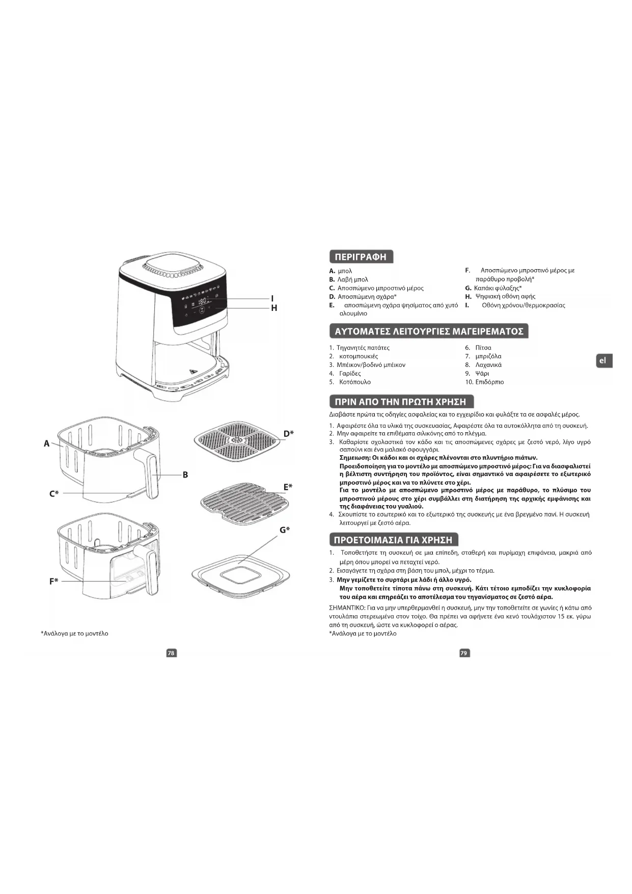 Μην τοποθετείτε τίποτα πάνω στη συσκευή. Κάτι τέτοιο εμποδίζει την κυκλοφορία του αέρα και επηρεάζει το αποτέλεσμα του τηγανίσματος σε ζεστό αέρα. ΣΗΜΑΝΤΙΚΟ: Για να μην υπερθερμανθεί η συσκευή, μην την τοποθετείτε σε γωνίες ή κάτω από ντουλάπια στερεωμένα στον τοίχο. Θα πρέπει να αφήνετε ένα κενό τουλάχιστον 15 εκ. γύρω από τη συσκευή, ώστε να κυκλοφορεί ο αέρας. *Ανάλογα με το μοντέλο8180