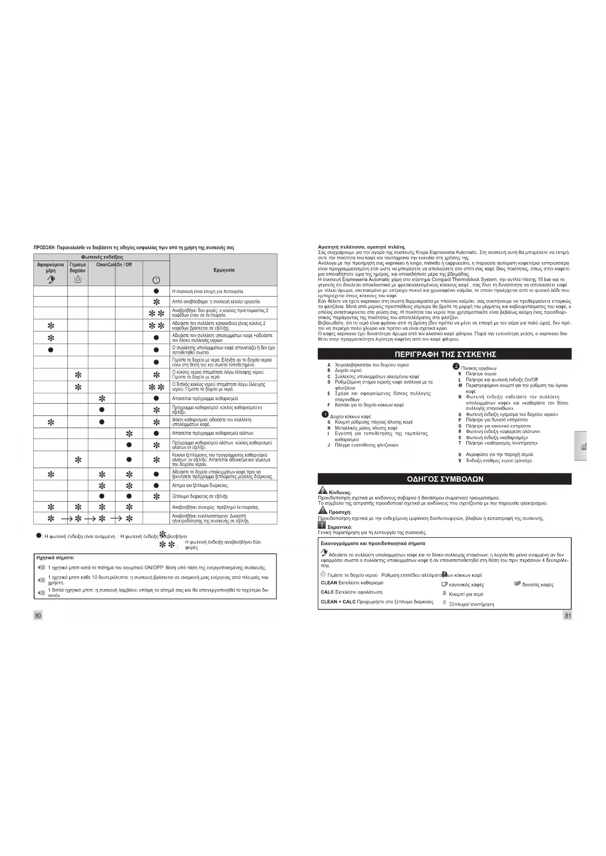 Δεν χρειάζεται να εκτελείτε το πρόγραμμα καθαρισμού αμέσως μόλις σας ειδοποιήσει η συσκευή, θα πρέπει όμως να το κάνετε σε εύλογο χρονικό διάστημα. Εάν αναβληθεί ο καθαρισμός, το μήνυμα ειδοποίησης θα εμφανίζεται για όσο διάστημα δεν εκτελείται η λειτουργία. Εάν αποσυνδέσετε ή απενεργοποιήσετε τη μηχανή κατά τη διάρκεια του καθαρισμού ή σε περίπτωση ηλεκτρικής βλάβης, το πρόγραμμα καθαρισμού θα συνεχιστεί από το τελευταίο βήμα πριν τη διακοπή. Η διαδικασία αυτή δεν θα μπορεί να αναβληθεί: η έκπλυση του κυκλώματος νερού είναι υποχρεωτική. Αν δεν υπάρχει αρκετό νερό στο δοχείο κατά την εκκίνηση του προγράμματος, θα ανάψει η φωτεινή ένδειξη . Προ- σθέστε επαρκή ποσότητα νερού στο δοχείο και ο καθαρισμός θα συνεχίσει αυτόματα. Εάν αποσυνδέσετε τη συσκευή σας κατά τον καθαρισμό, εάν πατήσετε το κουμπί ή σε περίπτωση δια- κοπής ηλεκτρικού ρεύματος, το πρόγραμμα ξαναρχίζει από την αρχή. Σε αυτή την περίπτωση, θα χρεια- στεί νέα παστίλια καθαρισμού. Πραγματοποιήστε τον πλήρη κύκλο καθαρισμού ώστε να εξασφαλίσετε την ορθή συντήρηση της μηχανής. Ο κύκλος καθαρισμού είναι διακοπτόμενος. Μην βάζετε τα χέρια σας κάτω από τις εξόδους νερού «Ε» και «W» κατά τη διάρκεια του κύκλου. Χρησιμοποιήστε αποκλειστικά τις παστίλιες καθαρισμού KRUPS (XS3000). Η εταιρεία δεν φέρει καμία ευθύνη για βλάβες που τυχόν προκύψουν από τη χρήση παστιλιών άλλης μάρκας. Η παστίλιες καθαρισμού KRUPS πωλούνται στα κέντρα εξυπηρέτησης πελατών KRUPS. Πρόγραμμα αφαίρεσης αλάτων - συνολική διάρκεια: 20 λεπτά περίπου Η ποσότητα αποθήκευσης της υδάτινης πέτρας εξαρτάται από την σκληρότητα του νερού που χρησιμοποιείται. Εάν χρειαστεί αφαλάτωση, η συσκευή θα σας προειδοποιήσει με την επαναλαμβανόμενη απεικόνιση της προειδοποίησης ‘CALC’. Το πρόγραμμα αυτό είναι διαθέσιμο μόνο όταν το απαιτεί η συσκευή. Για την τήρηση των όρων εγγύησης πρέπει η αφαλάτωση να εκτελεστεί αμέσως μόλις σας προειδοποιήσει η συσκευή. Να τηρείτε τη διαδικασία σχολαστικά βήμα - βήμα. Όταν η ένδειξη είναι φωτεινή, μπορείτε να συνεχί- σετε να χρησιμοποιείτε τη συσκευή, ωστόσο σας συστήνουμε να εκτελέσετε το πρόγραμμα το συντομότερο.87
