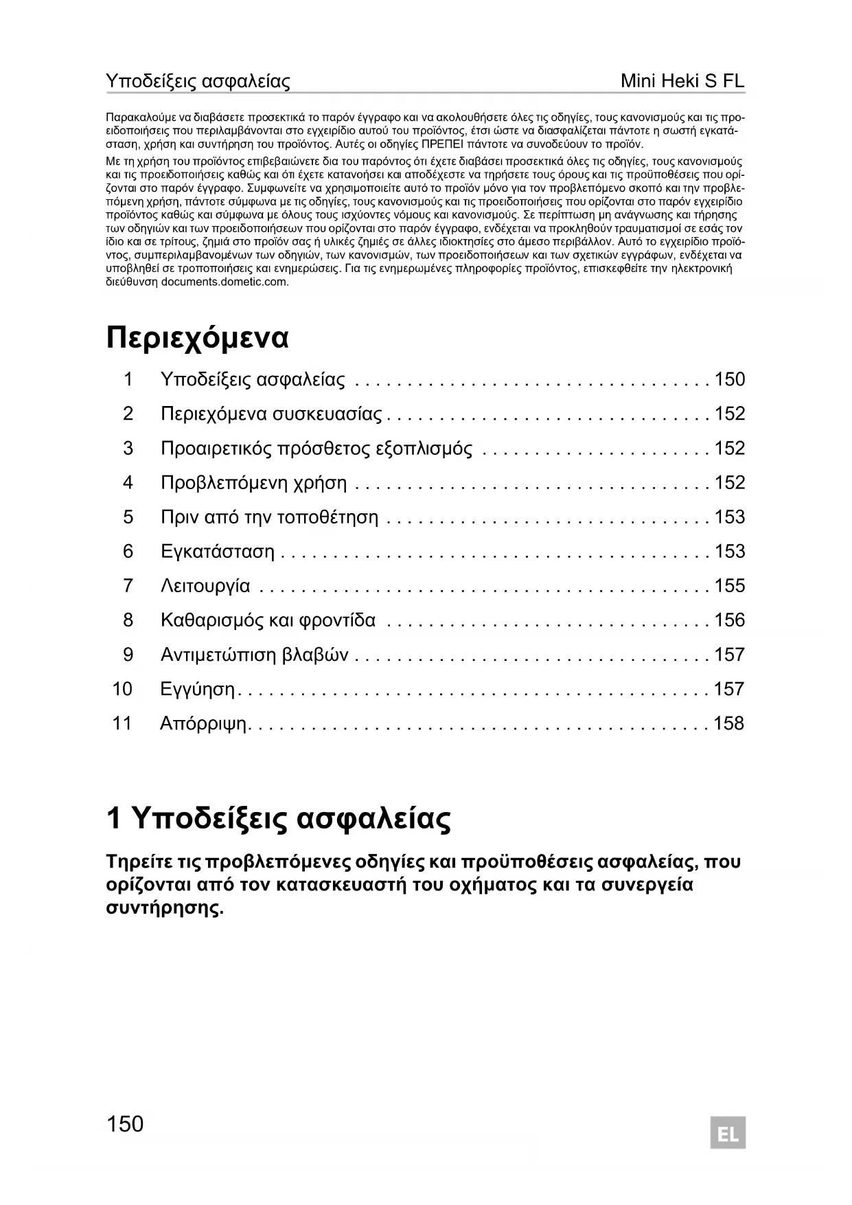 - Παρακαλούμε να διαβάσετε προσεκτικά το παρόν έγγραφο και να ακολουθήσετε όλες τις οδηγίες, τους κανονισμούς και τις προ- ειδοποιήσεις που περιλαμβάνονται στο εγχειρίδιο αυτού του προϊόντος, έτσι ώστε να διασφαλίζεται πάντοτε η σωστή εγκατά- σταση, χρήση και συντήρηση του προϊόντος. Αυτές οι οδηγίες ΠΡΕΠΕΙ πάντοτε να συνοδεύουν το προϊόν. Με τη χρήση του προϊόντος επιβεβαιώνετε δια του παρόντος ότι έχετε διαβάσει προσεκτικά όλες τις οδηγίες, τους κανονισμούς και τις προειδοποιήσεις καθώς και ότι έχετε κατανοήσει και αποδέχεστε να τηρήσετε τους όρους και τις προϋποθέσεις που ορί- ζονται στο παρόν έγγραφο. Συμφωνείτε να χρησιμοποιείτε αυτό το προϊόν μόνο για τον προβλεπόμενο σκοπό και την προβλε- πόμενη χρήση, πάντοτε σύμφωνα με τις οδηγίες, τους κανονισμούς και τις προειδοποιήσεις που ορίζονται στο παρόν εγχειρίδιο προϊόντος καθώς και σύμφωνα με όλους τους ισχύοντες νόμους και κανονισμούς. Σε περίπτωση μη ανάγνωσης και τήρησης των οδηγιών και των προειδοποιήσεων που ορίζονται στο παρόν έγγραφο, ενδέχεται να προκληθούν τραυματισμοί σε εσάς τον ίδιο και σε τρίτους, ζημιά στο προϊόν σας ή υλικές ζημιές σε άλλες ιδιοκτησίες στο άμεσο περιβάλλον. Αυτό το εγχειρίδιο προϊό- ντος, συμπεριλαμβανομένων των οδηγιών, των κανονισμών, των προειδοποιήσεων και των σχετικών εγγράφων, ενδέχεται να υποβληθεί σε τροποποιήσεις και ενημερώσεις. Για τις ενημερωμένες πληροφορίες προϊόντος, επισκεφθείτε την ηλεκτρονική διεύθυνση documents.dometic.com. Περιεχόμενα 1 Υποδείξεις ασφαλείας p. 150