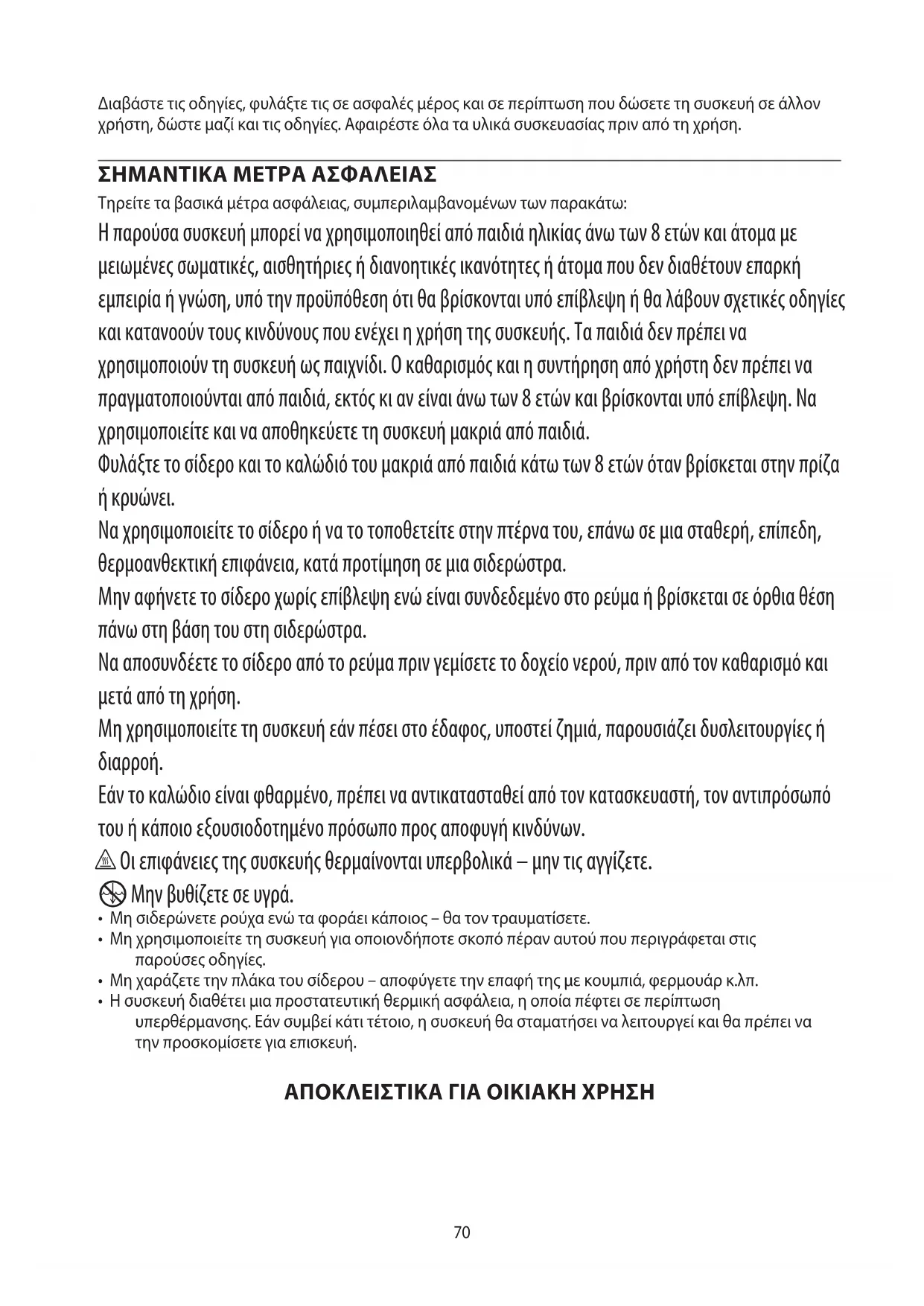 Τηρείτε τα βασικά μέτρα ασφάλειας, συμπεριλαμβανομένων των παρακάτω: Η παρούσα συσκευή μπορεί να χρησιμοποιηθεί από παιδιά ηλικίας άνω των 8 ετών και άτομα με μειωμένες σωματικές, αισθητήριες ή διανοητικές ικανότητες ή άτομα που δεν διαθέτουν επαρκή εμπειρία ή γνώση, υπό την προϋπόθεση ότι θα βρίσκονται υπό επίβλεψη ή θα λάβουν σχετικές οδηγίες και κατανοούν τους κινδύνους που ενέχει η χρήση της συσκευής. Τα παιδιά δεν πρέπει να χρησιμοποιούν τη συσκευή ως παιχνίδι. Ο καθαρισμός και η συντήρηση από χρήστη δεν πρέπει να πραγματοποιούνται από παιδιά, εκτός κι αν είναι άνω των 8 ετών και βρίσκονται υπό επίβλεψη. Να χρησιμοποιείτε και να αποθηκεύετε τη συσκευή μακριά από παιδιά. Φυλάξτε το σίδερο και το καλώδιό του μακριά από παιδιά κάτω των 8 ετών όταν βρίσκεται στην πρίζα