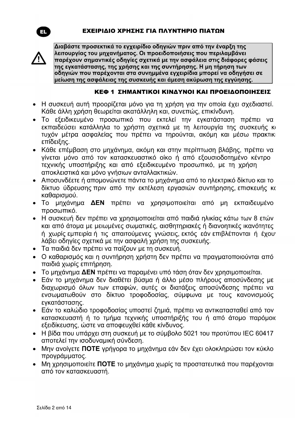 Η συσκευή δεν πρέπει να χρησιμοποιείται από παιδιά ηλικίας κάτω των 8 ετών και από άτομα με μειωμένες σωματικές, αισθητηριακές ή διανοητικές ικανότητες ή χωρίς εμπειρία ή τις απαιτούμενες γνώσεις, εκτός εάν επιβλέπονται ή έχουν λάβει οδηγίες σχετικά με την ασφαλή χρήση της συσκευής. Τα παιδιά δεν πρέπει να παίζουν με τη συσκευή. Ο καθαρισμός και η συντήρηση χρήστη δεν πρέπει να πραγματοποιούνται από παιδιά χωρίς επιτήρηση. Το μηχάνημα ΔΕΝ πρέπει να παραμένει υπό τάση όταν δεν χρησιμοποιείται. Εάν το μηχάνημα δεν διαθέτει βύσμα ή άλλο μέσο πλήρους αποσύνδεσης με διαχωρισμό όλων των επαφών, αυτές οι διατάξεις αποσύνδεσης πρέπει να ενσωματωθούν στο δίκτυο τροφοδοσίας, σύμφωνα με τους κανονισμούς εγκατάστασης. Εάν το καλώδιο τροφοδοσίας υποστεί ζημιά, πρέπει να αντικατασταθεί από τον κατασκευαστή ή το τμήμα τεχνικής υποστήριξής του ή από άτομο παρόμοιας εξειδίκευσης, ώστε να αποφευχθεί κάθε κίνδυνος. Η βίδα που υπάρχει στη συσκευή με το σύμβολο 5021 του προτύπου IEC 60417 αποτελεί την ισοδυναμική σύνδεση. Μην ανοίγετε ΠΟΤΕ γρήγορα το μηχάνημα εάν δεν έχει ολοκληρώσει τον κύκλο προγράμματος. Μη χρησιμοποιείτε ΠΟΤΕ το μηχάνημα χωρίς τα προστατευτικά που παρέχονται από τον κατασκευαστή.ΕΧΕΙΡΙΔΙΟ ΧΡΗΣΗΣ ΓΙΑ ΠΛΥΝΤΗΡΙΟ ΠΙΑΤΩΝ Σελίδα 3 από 14