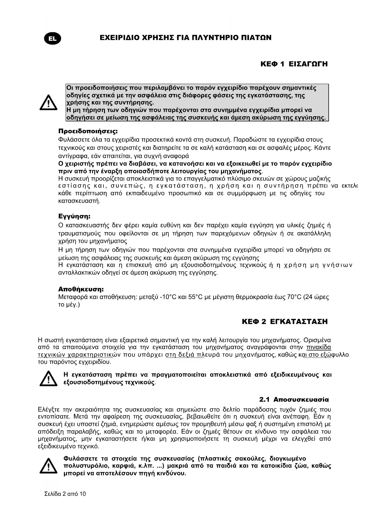 - ΚΕΦ 9 ΠΕΡΙΒΑΛΛΟΝ Κατά το νόμο, ο κατασκευαστικός οίκος διατηρεί την πνευματική ιδιοκτησία του παρόντος εντύπου με απαγόρευση αναπαραγωγής και διανομής με οποιονδήποτε τρόπο, χωρίς να προηγηθεί γραπτή έγκριση. Ο κατασκευαστικός οίκος διατηρεί το δικαίωμα να επιφέρει χωρίς καμία προειδοποίηση, τις τροποποιήσεις που θεωρεί απαραίτητες για τη βελτίωση του παρόντος. 442480 M OEM REV00 24-01-2017 U ELΕΧΕΙΡΙΔΙΟ ΧΡΗΣΗΣ ΓΙΑ ΠΛΥΝΤΗΡΙΟ ΠΙΑΤΩΝ Σελίδα 2 από 10 p. 10