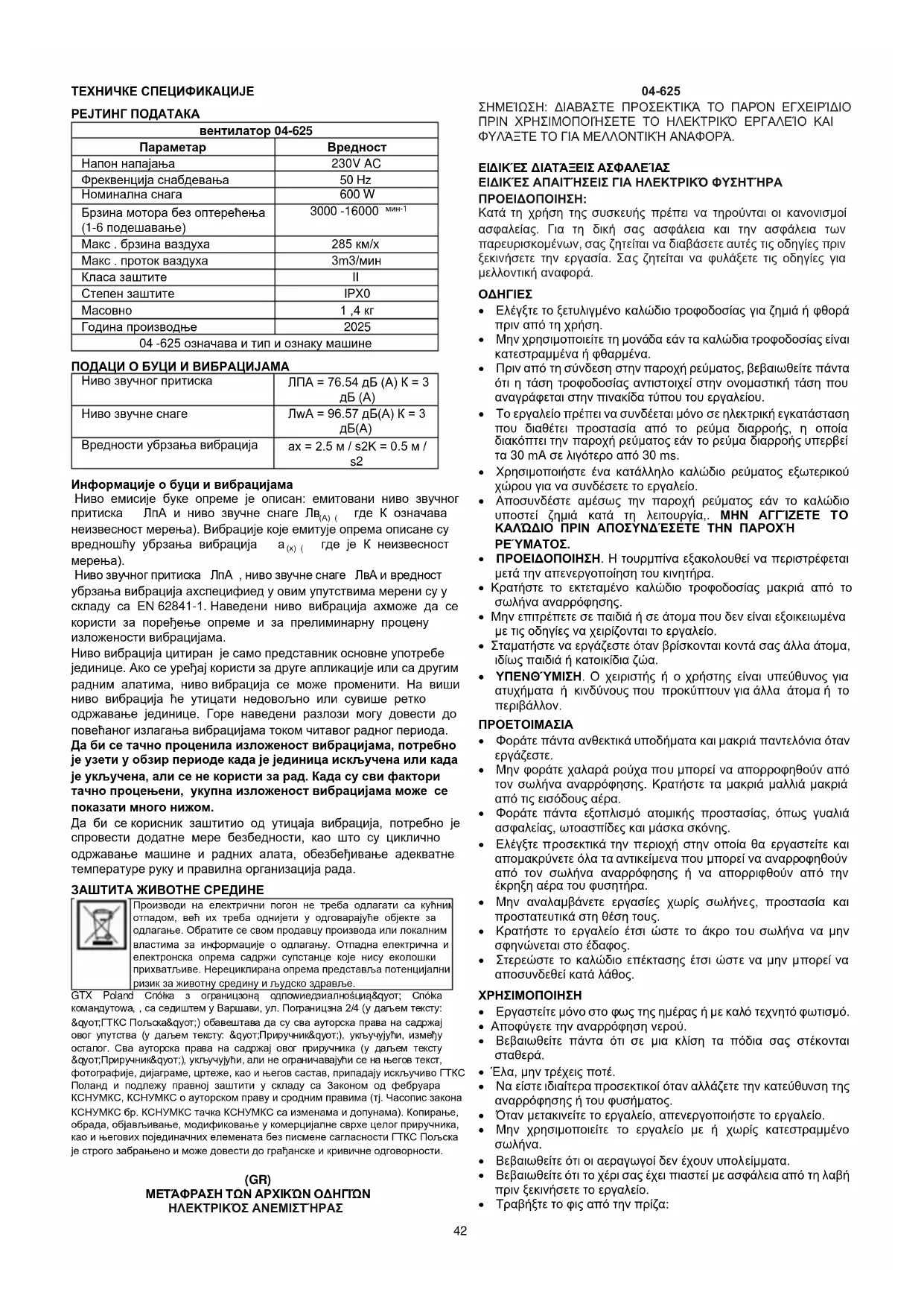 - Εάν το καλώδιο τροφοδοσίας έχει υποστεί ζημιά, πρέπει να αντικατασταθεί με ένα καλώδιο με τα ίδια χαρακτηριστικά. Η εργασία αυτή πρέπει να ανατεθεί σε εξειδικευμένο ειδικό ή να γίνει σέρβις της συσκευής. Τυχόν ελαττώματα θα πρέπει να αποκαθίστανται από το εξουσιοδοτημένο τμήμα σέρβις του κατασκευαστή. ΤΕΧΝΙΚΈΣ ΠΡΟΔΙΑΓΡΑΦΈΣ ΔΕΔΟΜΕΝΑ ΑΞΙΟΛΟΓΗΣΗΣ Φυσητήρας 04-625