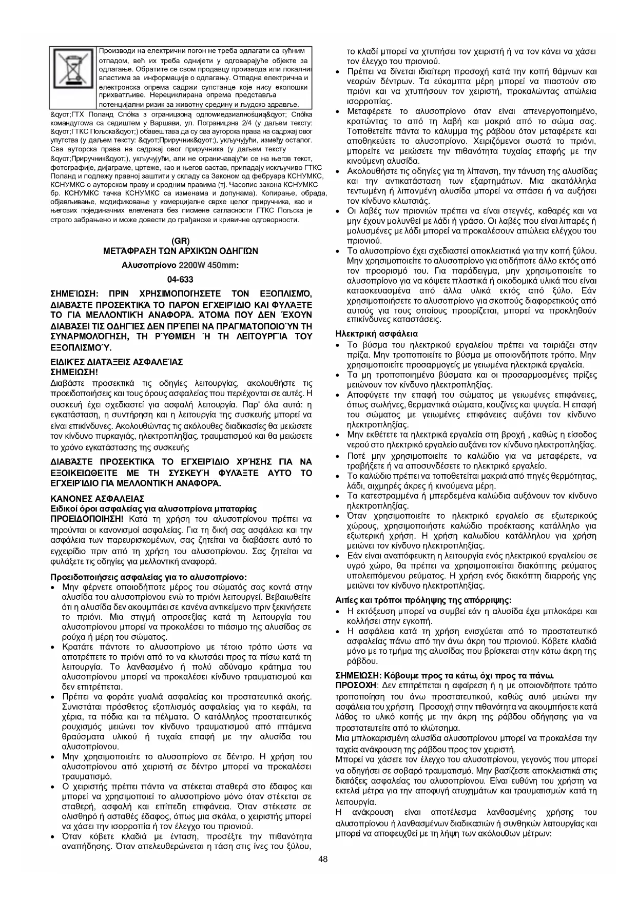 Διαβάστε προσεκτικά τις οδηγίες λειτουργίας, ακολουθήστε τις προειδοποιήσεις και τους όρους ασφαλείας που περιέχονται σε αυτές. Η συσκευή έχει σχεδιαστεί για ασφαλή λειτουργία. Παρ' όλα αυτά: η εγκατάσταση, η συντήρηση και η λειτουργία της συσκευής μπορεί να είναι επικίνδυνες. Ακολουθώντας τις ακόλουθες διαδικασίες θα μειώσετε τον κίνδυνο πυρκαγιάς, ηλεκτροπληξίας, τραυματισμού και θα μειώσετε το χρόνο εγκατάστασης της συσκευής ΔΙΑΒΆΣΤΕ ΠΡΟΣΕΚΤΙΚΆ ΤΟ ΕΓΧΕΙΡΊΔΙΟ ΧΡΉΣΗΣ ΓΙΑ ΝΑ ΕΞΟΙΚΕΙΩΘΕΊΤΕ ΜΕ ΤΗ ΣΥΣΚΕΥΉ ΦΥΛΆΞΤΕ ΑΥΤΌ ΤΟ ΕΓΧΕΙΡΊΔΙΟ ΓΙΑ ΜΕΛΛΟΝΤΙΚΉ ΑΝΑΦΟΡΆ. ΚΑΝΟΝΕΣ ΑΣΦΑΛΕΙΑΣ Ειδικοί όροι ασφαλείας για αλυσοπρίονα μπαταρίας ΠΡΟΕΙΔΟΠΟΙΗΣΗ! Κατά τη χρήση του αλυσοπρίονου πρέπει να τηρούνται οι κανονισμοί ασφαλείας. Για τη δική σας ασφάλεια και την ασφάλεια των παρευρισκομένων, σας ζητείται να διαβάσετε αυτό το εγχειρίδιο πριν από τη χρήση του αλυσοπρίονου. Σας ζητείται να φυλάξετε τις οδηγίες για μελλοντική αναφορά. Προειδοποιήσεις ασφαλείας για το αλυσοπρίονο: