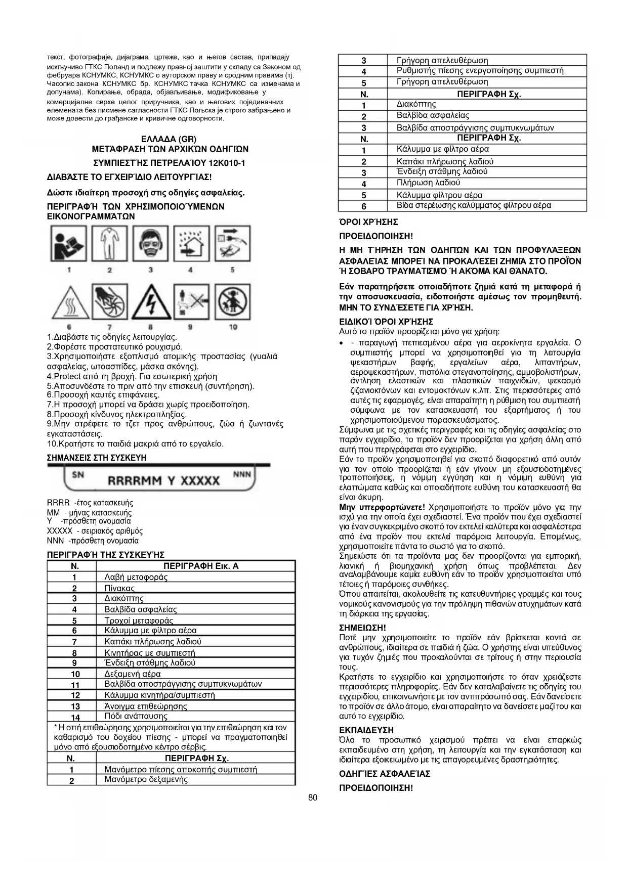 - Κίνδυνος πρόκλησης απώλειας ακοής (κώφωση) και άλλων φυσιολογικών διαταραχών (π.χ. απώλεια ισορροπίας, απώλεια συνείδησης). Κίνδυνος κραδασμών (που προκαλούν αγγειακές και νευρολογικές βλάβες στο σύστημα του χεριού-βραχίονα, για παράδειγμα η λεγόμενη "νόσος των λευκών δακτύλων") ΠΡΟΕΙΔΟΠΟΙΗΣΗ! Το προϊόν παράγει ηλεκτρομαγνητικό πεδίο πολύ χαμηλής έντασης. Το πεδίο αυτό μπορεί να επηρεάσει τη λειτουργία ορισμένων βηματοδοτών. Για να μειωθεί ο κίνδυνος σοβαρού ή θανατηφόρου τραυματισμού, τα άτομα με βηματοδότες θα πρέπει να συμβουλεύονται γιατρό. Ελλείψει προστασίας υπερέντασης, ο χρήστης πρέπει να διασφαλίσει ότι έχει εγκατασταθεί μια διάταξη προστασίας υπερέντασης για το κύκλωμα ισχύος. Πρέπει να πληροί τις απαιτήσεις του προτύπου EN60204-1. Ζητήστε τη συμβουλή του ηλεκτρολόγου σας. Μην χρησιμοποιείτε αυτόν τον συμπιεστή σε εκρηκτικές ατμόσφαιρες: υπάρχει κίνδυνος σοβαρών ατυχημάτων και