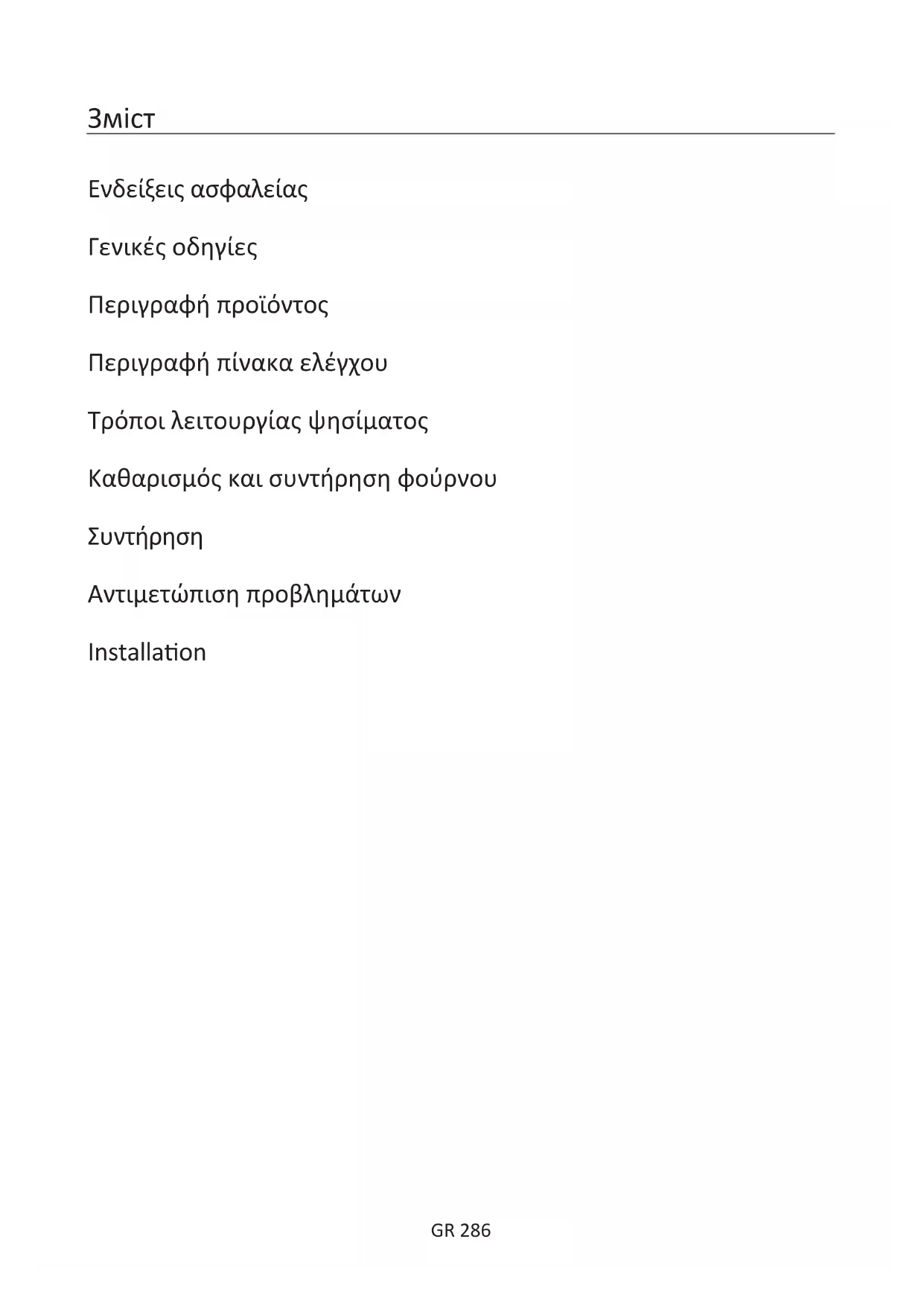 Εάν το έπιπλο είναι εφοδιασμένο με ένα τοίχωμα στο πίσω μέρος, κάντε ένα άνοιγμα για το καλώδιο τροφοδοσίας. GR Εάν ο φούρνος δεν διαθέτει ανεμιστήρα ψύξης, δημιουργήστε ένα άνοιγμα 460 mm x 15 mm. GR Οκατασκευαστής δεν είναι υπεύθυνος για οποιαδήποτε ανακρίβεια που μπορεί να προέκυψε από την εκτύπωση ή φραστικά σφάλματαπου περιέχονται σε αυτό το φυλλάδιο. Ο κατασκευαστής διατηρεί το δικαίωμα να προβεί σε τροποποιήσεις στα προϊόντα όταν αυτό απαιτείται, προς το συμφέρον των καταναλωτών εφόσον δεν θίγει τα χαρακτηριστικάπου αφορούν την ασφάλεια ή τη λειτουργίαPL 306 Instrukcje bezpieczeństwa Instrukcje ogólne Opis produktu Opis wyświetlacza Tryby pieczenia Czyszczenie i konserwacja piekarnika Konserwacja Rozwiązywanie problemów Installation Spis treściPL 307
