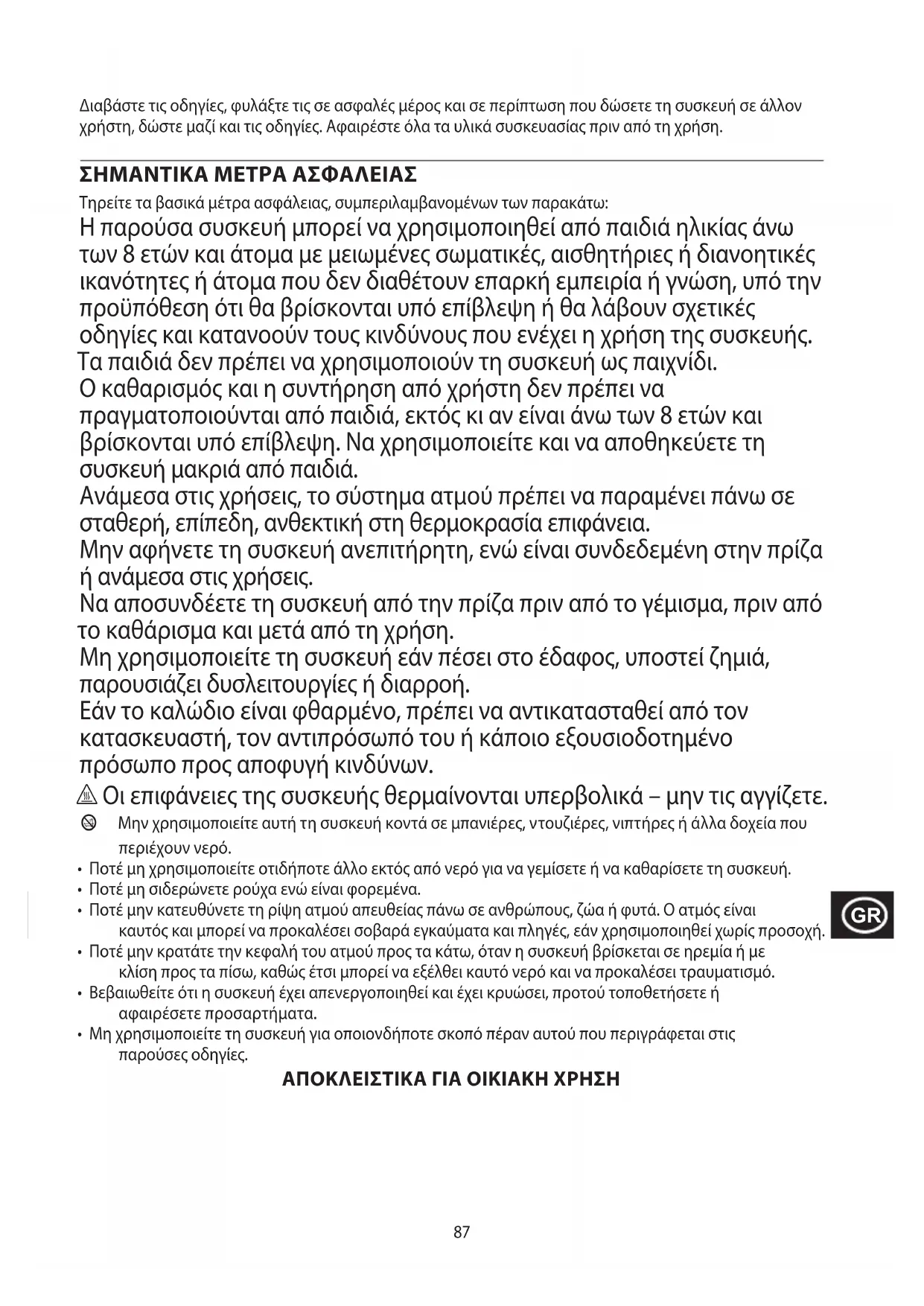 Τηρείτε τα βασικά μέτρα ασφάλειας, συμπεριλαμβανομένων των παρακάτω: Η παρούσα συσκευή μπορεί να χρησιμοποιηθεί από παιδιά ηλικίας άνω των 8 ετών και άτομα με μειωμένες σωματικές, αισθητήριες ή διανοητικές ικανότητες ή άτομα που δεν διαθέτουν επαρκή εμπειρία ή γνώση, υπό την προϋπόθεση ότι θα βρίσκονται υπό επίβλεψη ή θα λάβουν σχετικές οδηγίες και κατανοούν τους κινδύνους που ενέχει η χρήση της συσκευής. Τα παιδιά δεν πρέπει να χρησιμοποιούν τη συσκευή ως παιχνίδι. Ο καθαρισμός και η συντήρηση από χρήστη δεν πρέπει να πραγματοποιούνται από παιδιά, εκτός κι αν είναι άνω των 8 ετών και βρίσκονται υπό επίβλεψη. Να χρησιμοποιείτε και να αποθηκεύετε τη συσκευή μακριά από παιδιά. Ανάμεσα στις χρήσεις, το σύστημα ατμού πρέπει να παραμένει πάνω σε σταθερή, επίπεδη, ανθεκτική στη θερμοκρασία επιφάνεια. Μην αφήνετε τη συσκευή ανεπιτήρητη, ενώ είναι συνδεδεμένη στην πρίζα ή ανάμεσα στις χρήσεις. Να αποσυνδέετε τη συσκευή από την πρίζα πριν από το γέμισμα, πριν από το καθάρισμα και μετά από τη χρήση. Μη χρησιμοποιείτε τη συσκευή εάν πέσει στο έδαφος, υποστεί ζημιά, παρουσιάζει δυσλειτουργίες ή διαρροή. Εάν το καλώδιο είναι φθαρμένο, πρέπει να αντικατασταθεί από τον κατασκευαστή, τον αντιπρόσωπό του ή κάποιο εξουσιοδοτημένο πρόσωπο προς αποφυγή κινδύνων. h Οι επιφάνειες της συσκευής θερμαίνονται υπερβολικά – μην τις αγγίζετε. b Μην χρησιμοποιείτε αυτή τη συσκευή κοντά σε μπανιέρες, ντουζιέρες, νιπτήρες ή άλλα δοχεία που περιέχουν νερό.