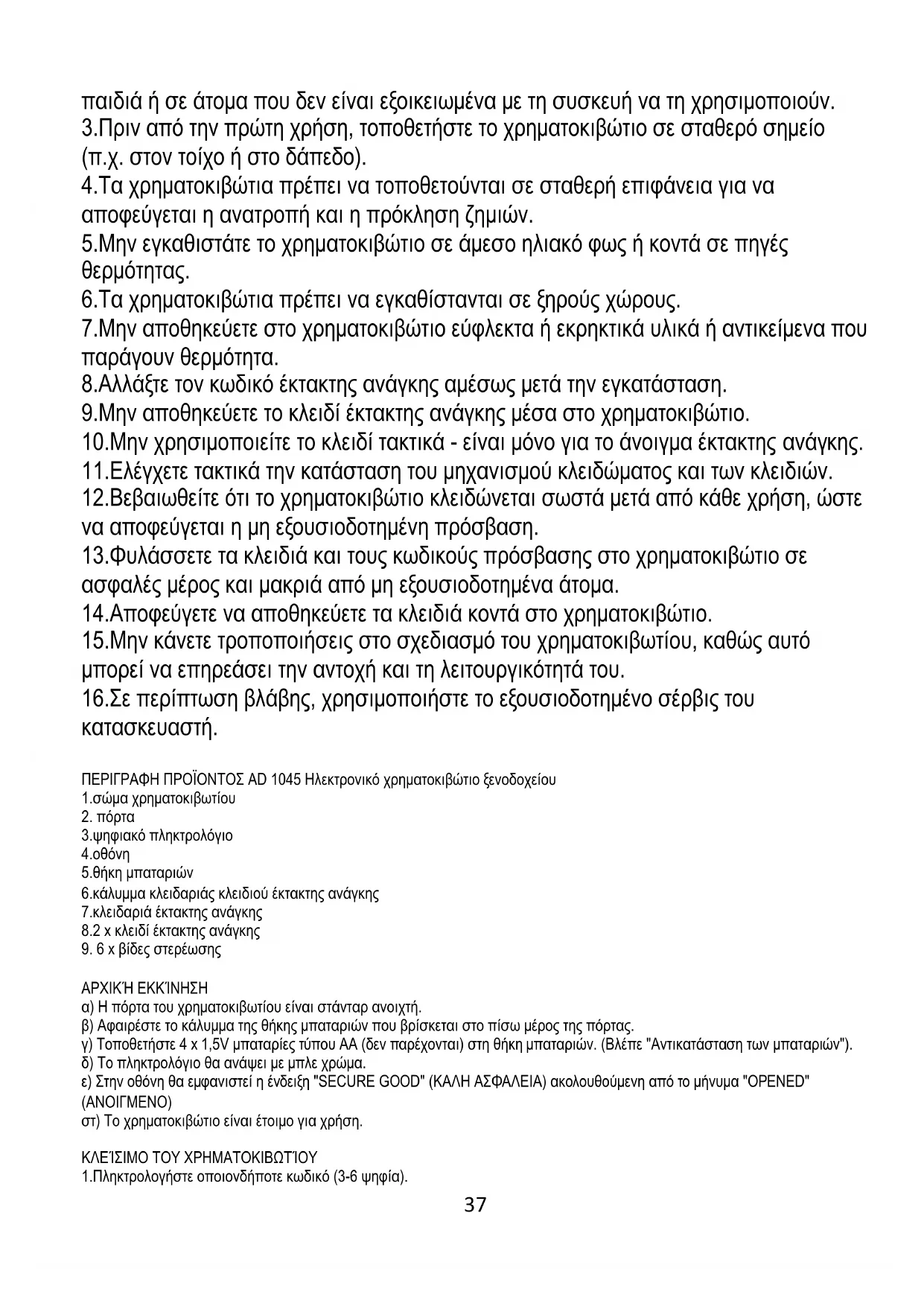 ΑΡΧΙΚΉ ΕΚΚΊΝΗΣΗ α) Η πόρτα του χρηματοκιβωτίου είναι στάνταρ ανοιχτή. β) Αφαιρέστε το κάλυμμα της θήκης μπαταριών που βρίσκεται στο πίσω μέρος της πόρτας. γ) Τοποθετήστε 4 x 1,5V μπαταρίες τύπου AA (δεν παρέχονται) στη θήκη μπαταριών. (Βλέπε "Αντικατάσταση των μπαταριών"). δ) Το πληκτρολόγιο θα ανάψει με μπλε χρώμα. ε) Στην οθόνη θα εμφανιστεί η ένδειξη "SECURE GOOD" (ΚΑΛΗ ΑΣΦΑΛΕΙΑ) ακολουθούμενη από το μήνυμα "OPENED" (ΑΝΟΙΓΜΕΝΟ) στ) Το χρηματοκιβώτιο είναι έτοιμο για χρήση. ΚΛΕΊΣΙΜΟ ΤΟΥ ΧΡΗΜΑΤΟΚΙΒΩΤΊΟΥ 1.Πληκτρολογήστε οποιονδήποτε κωδικό (3-6 ψηφία).38 2.Πατήστε το κουμπί LOCK (#). 3.Στην οθόνη θα εμφανιστεί το μήνυμα "ΚΛΕΙΣΤΟ" - το χρηματοκιβώτιο έχει κλειδωθεί. ΆΝΟΙΓΜΑ ΤΟΥ ΧΡΗΜΑΤΟΚΙΒΩΤΊΟΥ (α) Προσωπικός κωδικός 1.Πληκτρολογήστε έναν κωδικό 3-6 ψηφίων. 2.Μετά το μήνυμα "OPENED", το χρηματοκιβώτιο θα ανοίξει. β) Κωδικός έκτακτης ανάγκης 1.Πατήστε δύο φορές το πλήκτρο LOCK (#) - θα εμφανιστεί το μήνυμα "SUPER". 2.Πληκτρολογήστε τον κύριο κωδικό (προεπιλογή 000000) και, στη συνέχεια, πατήστε LOCK (#). 3.Θα εμφανιστεί το μήνυμα "OPENED" (ΑΝΟΙΓΜΕΝΟ) - το χρηματοκιβώτιο θα ανοίξει. γ) Κλειδί έκτακτης ανάγκης (σε περίπτωση έκτακτης ανάγκης) 1.Τοποθετήστε το κλειδί και περιστρέψτε το δεξιόστροφα. 2.Η πόρτα θα ανοίξει (στην οθόνη θα εμφανιστεί το μήνυμα "OPENED"). 3.Εισάγετε έναν νέο κωδικό 3-6 ψηφίων, πατήστε το κουμπί LOCK (#), η πόρτα θα κλείσει. 4.Αφαιρέστε το κλειδί. ΑΛΛΑΓΉ ΤΟΥ ΠΡΟΣΩΠΙΚΟΎ ΣΑΣ ΚΩΔΙΚΟΎ 5.Εισάγετε έναν νέο κωδικό (3-6 ψηφία). 6.Πατήστε το κουμπί LOCK (#) - ο νέος κωδικός έχει οριστεί. ΑΛΛΑΓΉ ΤΟΥ ΚΩΔΙΚΟΎ ΈΚΤΑΚΤΗΣ ΑΝΆΓΚΗΣ Συνιστάται να πραγματοποιείται με την πόρτα ανοιχτή! 1.Ανοίξτε το χρηματοκιβώτιο. 2.Πατήστε το κουμπί CLEAR (*) δύο φορές, στην οθόνη θα εμφανιστεί το μήνυμα "PROG". 3.Όταν το μήνυμα "PROG" εξαφανιστεί, πληκτρολογήστε τον τρέχοντα κωδικό έκτακτης ανάγκης και πατήστε το κουμπί LOCK (#) (αν ο κωδικός είναι λάθος - θα εμφανιστεί το μήνυμα "E-CODE"). 4.Στην οθόνη θα εμφανιστεί το μήνυμα "NEU" - πληκτρολογήστε τον νέο 6ψήφιο κωδικό έκτακτης ανάγκης και πατήστε το πλήκτρο LOCK (#). 5.Θα εμφανιστεί το μήνυμα "DONE" (ΟΛΟΚΛΗΡΩΣΗ) - η αλλαγή ολοκληρώθηκε. ΠΡΟΕΙΔΟΠΟΙΉΣΕΙΣ ΚΑΙ ΣΗΜΕΙΏΣΕΙΣ -Αλλάζετε πάντα τον προεπιλεγμένο κωδικό έκτακτης ανάγκης αμέσως μετά την εγκατάσταση. -Μην αποθηκεύετε το κλειδί μέσα στο χρηματοκιβώτιο. -Πιέστε το πλήκτρο CLEAR (*) για να διαγράψετε τον λανθασμένο κωδικό που εισήχθη. -Μετά από 4 λανθασμένες προσπάθειες εισαγωγής κωδικού - το χρηματοκιβώτιο κλειδώνει για 5 λεπτά. Θα εμφανιστεί ένα μήνυμα ("HOLD-5"). Μέθοδος αφαίρεσης, αντικατάστασης των μπαταριών: Ανοίξτε το δοχείο, αφαιρέστε τις χρησιμοποιημένες μπαταρίες. Για να τοποθετήσετε σωστά τις νέες μπαταρίες, δώστε ιδιαίτερη προσοχή στην πολικότητα (+) συν και (-) . Υπάρχει ένα γραφικό σύμβολο μέσα ή γύρω από το κουτί μπαταριών που απεικονίζει τον τρόπο σωστής τοποθέτησης των μπαταριών στο κουτί, στη συνέχεια κλείστε το κουτί μπαταριών. Σημαντικές πληροφορίες ασφαλείας Η εσφαλμένη χρήση των μπαταριών μπορεί να προκαλέσει διαρροή ηλεκτρολύτη, υπερθέρμανση ή έκρηξη. Ο ηλεκτρολύτης που απελευθερώνεται αποτελεί πηγή διάβρωσης και μπορεί να είναι τοξικός. Μπορεί να προκαλέσει εγκαύματα στο δέρμα και στα μάτια- είναι επίσης επιβλαβής σε περίπτωση κατάποσης. Για να μειώσετε τον κίνδυνο τραυματισμού: -Διατηρείτε τις μπαταρίες μακριά από παιδιά. -Οι μπαταρίες δεν πρέπει να θερμαίνονται, να ανοίγονται, να τρυπούν, να καταστρέφονται ή να ρίχνονται σε φωτιά και δεν πρέπ