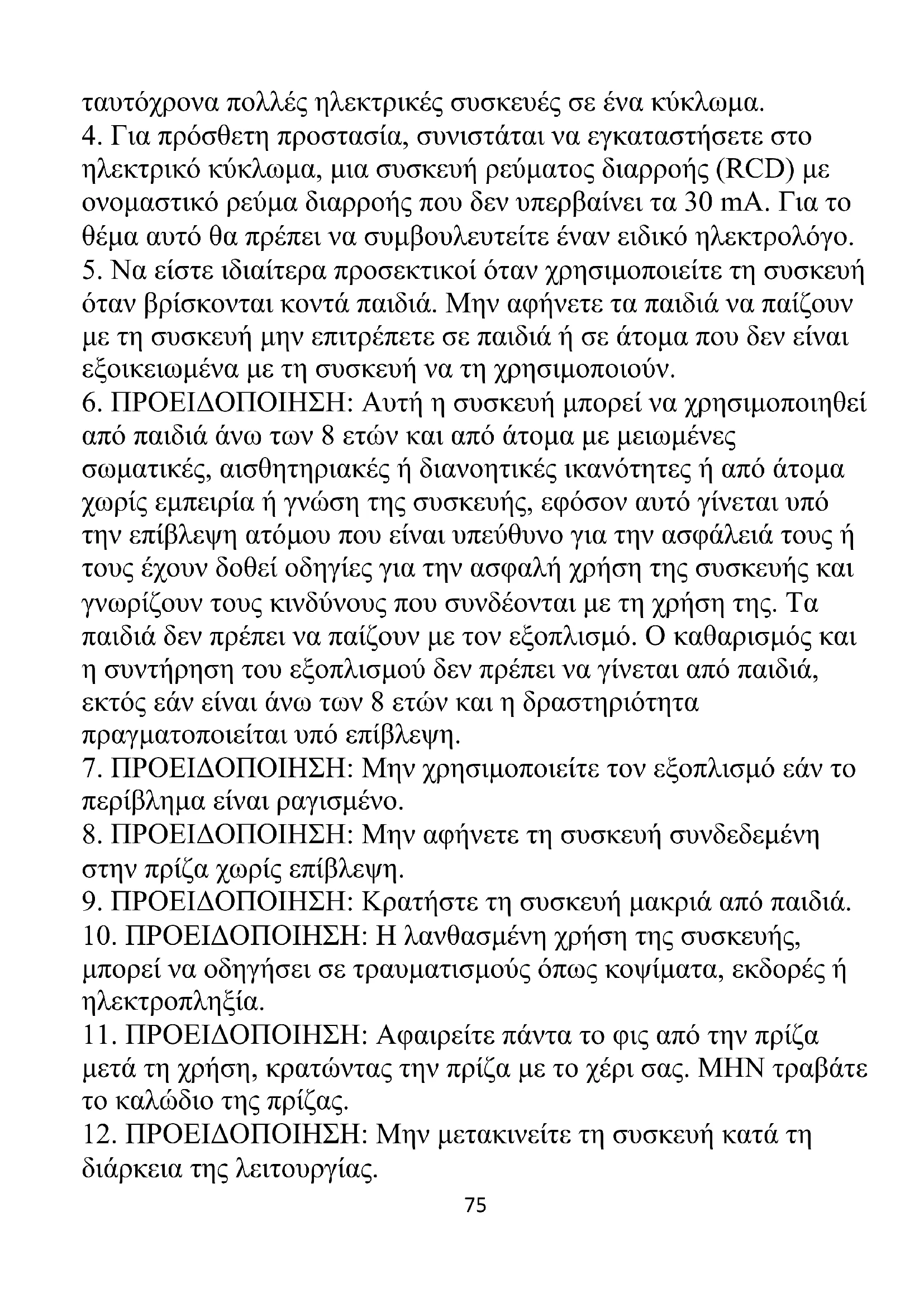 60Hz. Για να αυξήσετε την ασφάλεια της χρήσης, μην συνδέετε75 ταυτόχρονα πολλές ηλεκτρικές συσκευές σε ένα κύκλωμα.