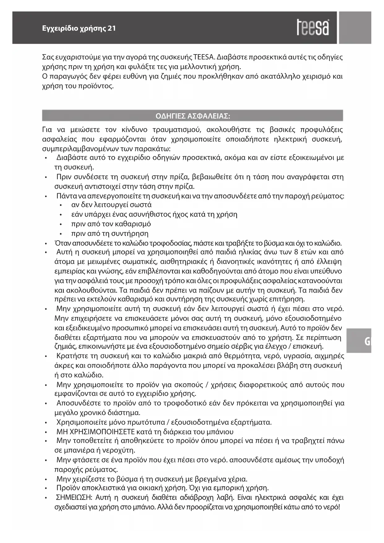 - Fournis: 2 têtes, l’étui de voyage, câble USB La présente traduction a été générée automatiquement et peut comporter des erreurs. Dans certains cas, des formulations imprécises peuvent apparaitre, p.ex. dans les traductions des touches ou des détails techniques. Si vous avez des doutes, nous vous recommandons de consulter la version anglaise du mode d’emploi.Εγχειρίδιο χρήσης 21 GRGR ΟΔΗΓΙΕΣ ΑΣΦΑΛΕΙΑΣ: Σας ευχαριστούμε για την αγορά της συσκευής TEESA. Διαβάστε προσεκτικά αυτές τις οδηγίες χρήσης πριν τη χρήση και φυλάξτε τες για μελλοντική χρήση. Ο παραγωγός δεν φέρει ευθύνη για ζημιές που προκλήθηκαν από ακατάλληλο χειρισμό και χρήση του προϊόντος. Για να μειώσετε τον κίνδυνο τραυματισμού, ακολουθήστε τις βασικές προφυλάξεις ασφαλείας που εφαρμόζονται όταν χρησιμοποιείτε οποιαδήποτε ηλεκτρική συσκευή, συμπεριλαμβανομένων των παρακάτω: