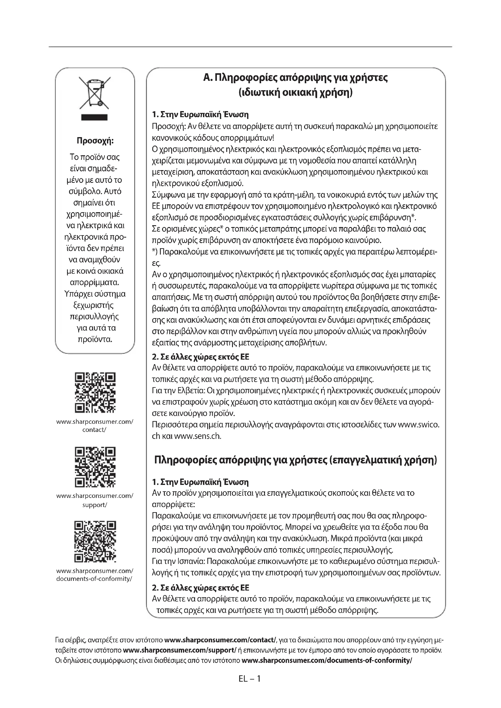 Αν θέλετε να απορρίψετε αυτό το προϊόν, παρακαλούμε να επικοινωνήσετε με τις τοπικές αρχές και να ρωτήσετε για τη σωστή μέθοδο απόρριψης. Για σέρβις, ανατρέξτε στον ιστότοπο www.sharpconsumer.com/contact/, για τα δικαιώματα που απορρέουν από την εγγύηση με- ταβείτε στον ιστότοπο www.sharpconsumer.com/support/ ή επικοινωνήστε με τον έμπορο από τον οποίο αγοράσατε το προϊόν. Οι δηλώσεις συμμόρφωσης είναι διαθέσιμες από τον ιστότοπο www.sharpconsumer.com/documents-of-conformity/ www.sharpconsumer.com/ support/ www.sharpconsumer.com/ documents-of-conformity/ www.sharpconsumer.com/ contact/EL EL – 1EL – 1
