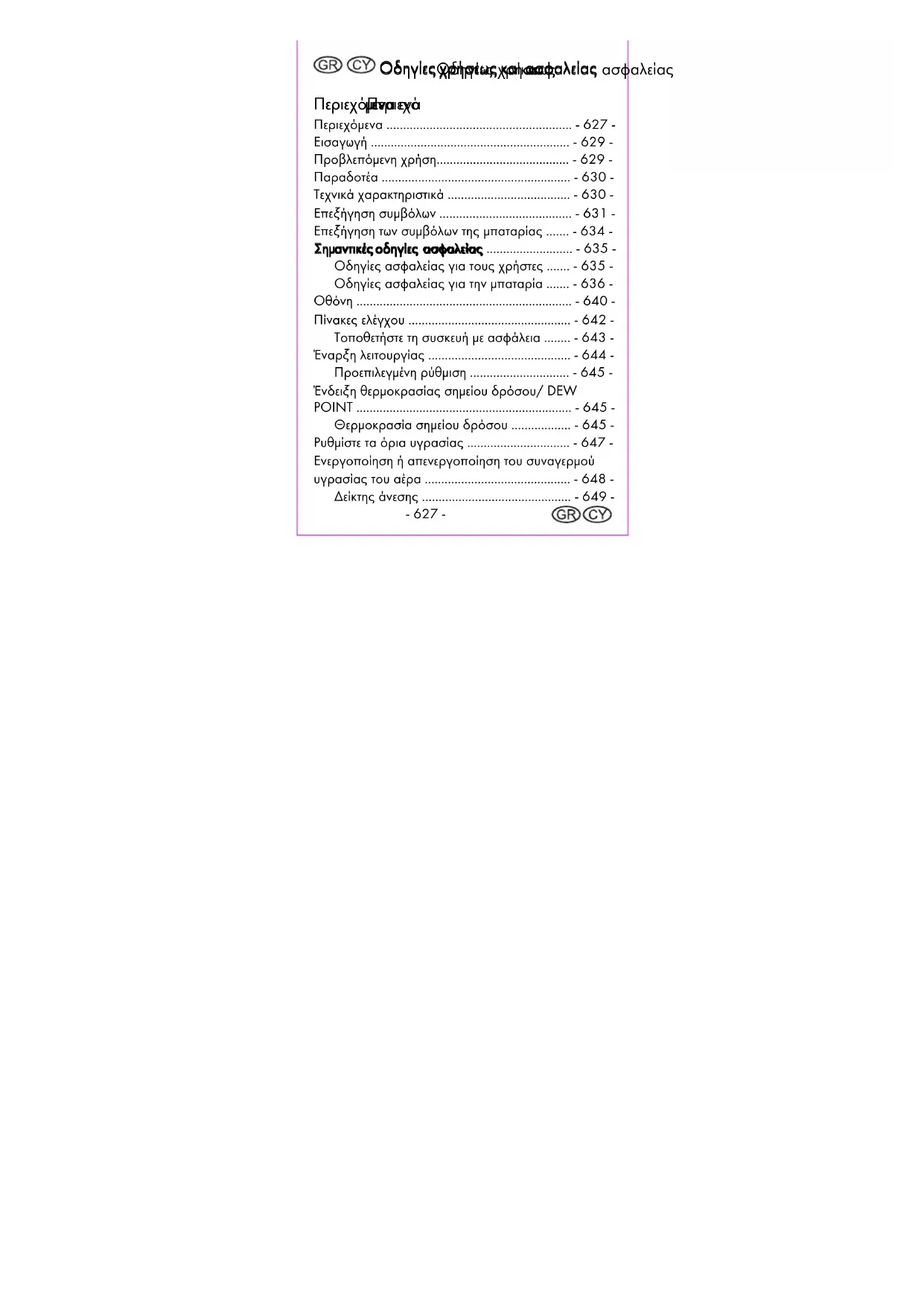 ασφαλείαςασφαλείας ασφαλείας .......................... - 635 - Οδηγίες ασφαλείας για τους χρήστες ....... - 635 - Οδηγίες ασφαλείας για την µπαταρία ....... - 636 - Oθόνη ................................................................. - 640 - Πίνακες ελέγχου ................................................. - 642 - Τοποθετήστε τη συσκευή µε ασφάλεια ........ - 643 - Έναρξη λειτουργίας ........................................... - 644 - Προεπιλεγµένη ρύθµιση .............................. - 645 - Ένδειξη θερµοκρασίας σηµείου δρόσου/ DEW POINT ................................................................. - 645 - Θερµοκρασία σηµείου δρόσου .................. - 645 - Ρυθµίστε τα όρια υγρασίας ............................... - 647 - Ενεργοποίηση ή απενεργοποίηση του συναγερµού υγρασίας του αέρα ............................................ - 648 - ∆είκτης άνεσης ............................................. - 649 -- 628 - Ένδειξη θερµοκρασίας δωµατίου ..................... - 650 - Ρύθµιση προειδοποίησης µούχλας .................. - 650 - ∆είκτης γρίπης και καύσωνα ............................. - 652 - Ένδειξη προειδοποίησης γρίπης ...................... - 652 - Ένδειξη προειδοποίησης καύσωνα .................. - 653 - Εµφάνιση ένδειξης MAX.MIN .......................... - 653 - MAX.MIN - ∆ιαγραφή εγγραφής ..................... - 654 - Ένδειξη στάθµης µπαταρίας ............................. - 654 - Οδηγίες καθαρισµού ......................................... - 654 - Αποθήκευση ....................................................... - 655 - Απλοποιηµένη δήλωση συµµόρφωσης ΕΕ ....... - 655 - Απόρριψη ........................................................... - 656 - Απόρριψη της ηλεκτρικής συσκευής .......... - 656 - Απόρριψη των µπαταριών ........................... - 660 - Ανακύκλωση ................................................. - 664 - Αποκοµιδή απορριµµάτων .......................... - 664 - Εγγύηση της digi-tech gmbh ............................. - 664 - Όροι εγγύησης ............................................ - 664 - Περίοδος εγγύησης και νοµικές αξιώσεις για ελαττώµατα ................................................ - 665 - Πεδίο της εγγύησης ..................................... - 666 - ∆ιαδικασία σε περίπτωση αξίωσης εγγύησης . -