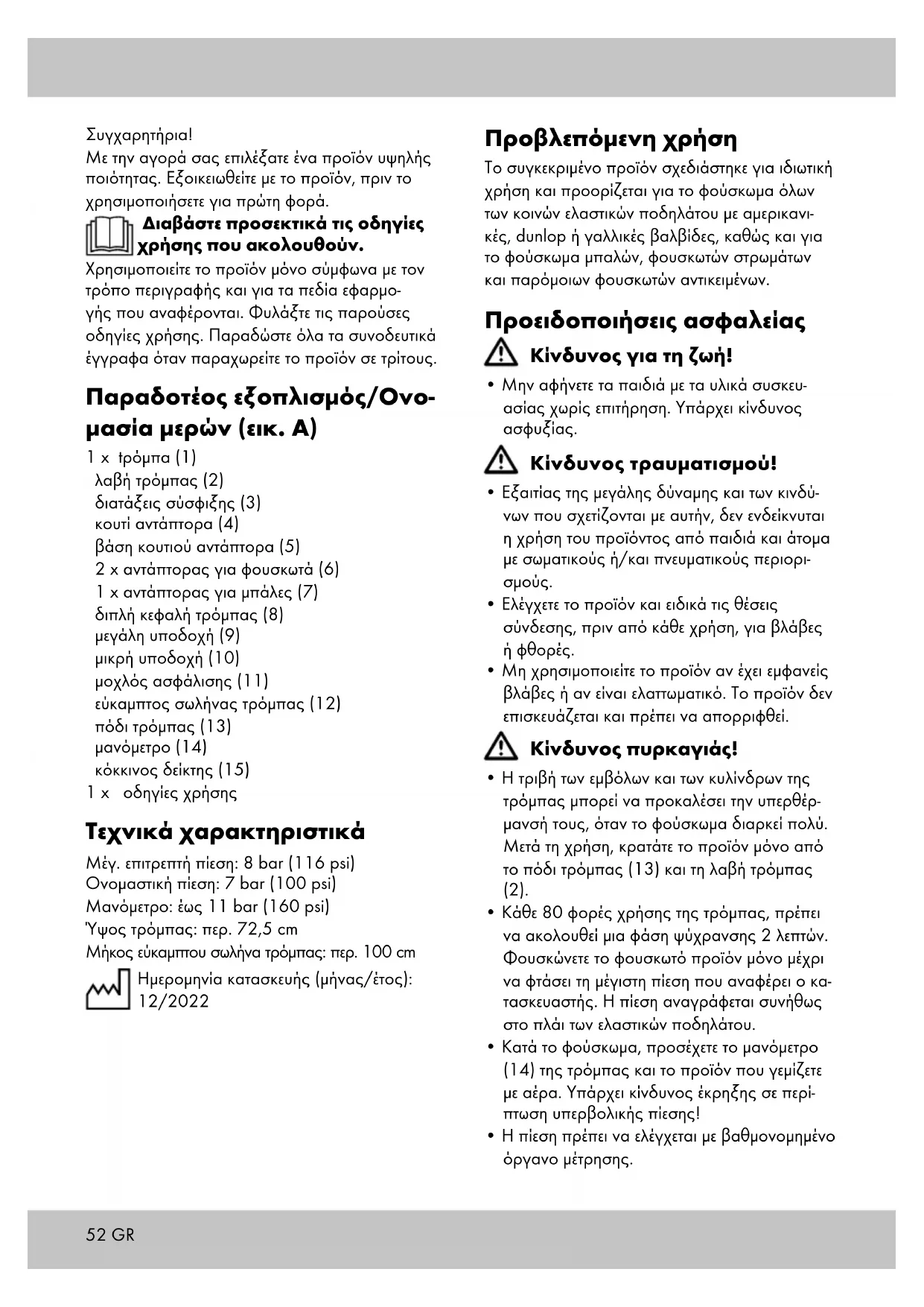 - Като физическо лице – потребител, незави- симо от настоящата търговска гаранция, Вие се ползвате от правата на законовата гаран- ция, предоставена от Закона за предоставяне на цифрово съдържание и цифрови услуги и за продажбата на стоки /ЗПЦСЦУПС/. По-специално Вие имате право при несъот- ветствие на стоката да бъде извършен ремонт или замяна по Ваш избор, освен ако това е невъзможно или е свързано с непропорцио- нално големи разходи за продавача. Вие имате право на пропорционално намаляване на цената или на разваляне на договора при наличие на условията на чл. 33, ал. 3 от ЗПЦСЦУПС. Условията и сроковете на законовата гаранция са регламентирани в глава трета, раздел II и III и в глава четвърта на ЗПЦСЦУПС. IAN: 409048_2207 Сервизно обслужване България Тел.: 00800 111 4920 Е-мейл: deltasport@lidl.bg52 GR Συγχαρητήρια! Με την αγορά σας επιλέξατε ένα προϊόν υψηλής ποιότητας. Εξοικειωθείτε με το προϊόν, πριν το χρησιμοποιήσετε για πρώτη φορά. Διαβάστε προσεκτικά τις οδηγίες χρήσης που ακολουθούν. Χρησιμοποιείτε το προϊόν μόνο σύμφωνα με τον τρόπο περιγραφής και για τα πεδία εφαρμο- γής που αναφέρονται. Φυλάξτε τις παρούσες οδηγίες χρήσης. Παραδώστε όλα τα συνοδευτικά έγγραφα όταν παραχωρείτε το προϊόν σε τρίτους. Παραδοτέος εξοπλισμός/Όνο- μασία μερών (εικ. A) 1 x tρόμπα (1) λαβή τρόμπας (2) διατάξεις σύσφιξης (3) κουτί αντάπτορα (4) βάση κουτιού αντάπτορα (5) 2 x αντάπτορας για φουσκωτά (6) 1 x αντάπτορας για μπάλες (7) διπλή κεφαλή τρόμπας (8) μεγάλη υποδοχή (9) μικρή υποδοχή (10) μοχλός ασφάλισης (11) εύκαμπτος σωλήνας τρόμπας (12) πόδι τρόμπας (13) μανόμετρο (14) κόκκινος δείκτης (15) 1 x οδηγίες χρήσης Τεχνικά χαρακτηριστικά Μέγ. επιτρεπτή πίεση: 8 bar (116 psi) Ονομαστική πίεση: 7 bar (100 psi) Μανόμετρο: έως 11 bar (160 psi) Ύψος τρόμπας: περ. 72,5 cm Μήκος εύκαμπτου σωλήνα τρόμπας: περ. 100 cm Ημερομηνία κατασκευής (μήνας/έτος): 12/2022 Προβλεπόμενη χρήση Το συγκεκριμένο προϊόν σχεδιάστηκε για ιδιωτική χρήση και προορίζεται για το φούσκωμα όλων των κοινών ελαστικών ποδηλάτου με αμερικανι- κές, dunlop ή γαλλικές βαλβίδες, καθώς και για το φούσκωμα μπαλών, φουσκωτών στρωμάτων και παρόμοιων φουσκωτών αντικειμένων. Προειδοποιήσεις ασφαλείας Κίνδυνος για τη ζωή!