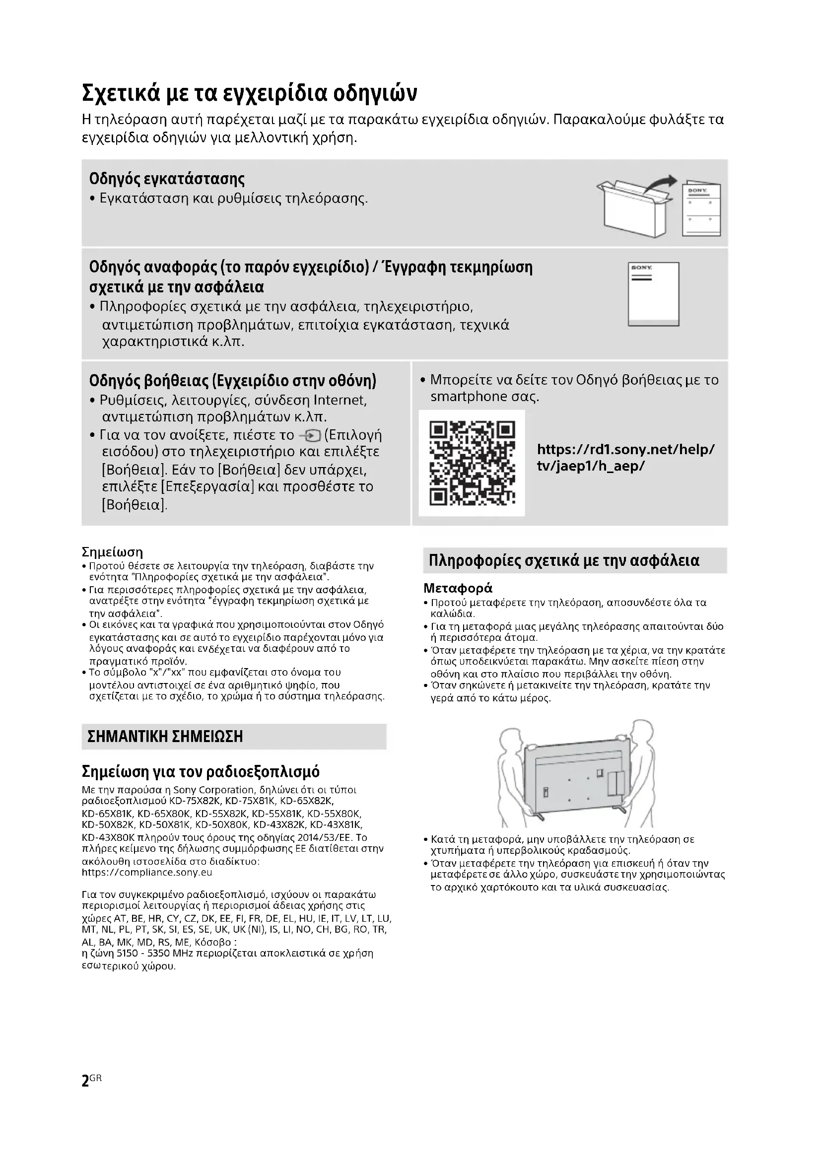 - Μπορείτε να δείτε τον Οδηγό βοήθειας με το smartphone σας. https://rd1.sony.net/help/ tv/jaep1/h_aep/ ΣΗΜΑΝΤΙΚΗ ΣΗΜΕΙΩΣΗ Πληροφορίες σχετικά με την ασφάλεια3