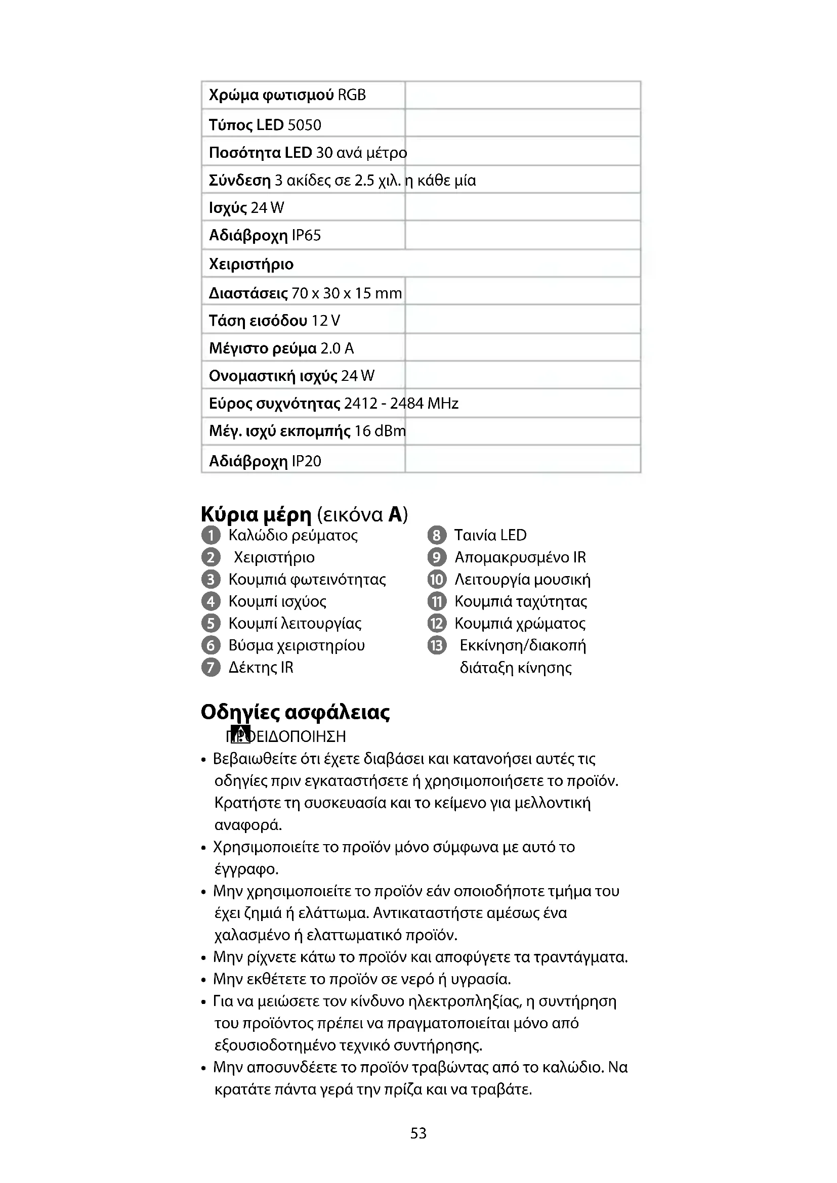 Το προϊόν προορίζεται για εσωτερική και εξωτερική χρήση. Οποιαδήποτε τροποποίηση του προϊόντος μπορεί να έχει επιπτώσεις στην ασφάλεια, την εγγύηση και τη σωστή λειτουργία. Χαρακτηριστικά Προϊόν Έξυπνη ταινία LED με Wi-Fi Αριθμός είδους WIFILS51CRGB Ταινία LED Μήκος ταινίας LED 5 m Πλάτος ταινίας LED 10 mm Φωτεινότητα 900 lm53 Χρώμα φωτισμού RGB Τύπος LED 5050 Ποσότητα LED 30 ανά μέτρο Σύνδεση 3 ακίδες σε 2.5 χιλ. η κάθε μία Ισχύς 24 W Αδιάβροχη IP65 Χειριστήριο Διαστάσεις 70 x 30 x 15 mm Τάση εισόδου 12 V Μέγιστο ρεύμα 2.0 A Ονομαστική ισχύς 24 W Εύρος συχνότητας 2412 - 2484 MHz Μέγ. ισχύ εκπομπής 16 dBm Αδιάβροχη IP20 Κύρια μέρη (εικόνα A) 1 Καλώδιο ρεύματος 2 Χειριστήριο 3 Κουμπιά φωτεινότητας 4 Κουμπί ισχύος 5 Κουμπί λειτουργίας 6 Βύσμα χειριστηρίου 7 Δέκτης IR 8 Ταινία LED 9 Απομακρυσμένο IR q Λειτουργία μουσική w Κουμπιά ταχύτητας e Κουμπιά χρώματος r Εκκίνηση/διακοπή διάταξη κίνησης Οδηγίες ασφάλειας