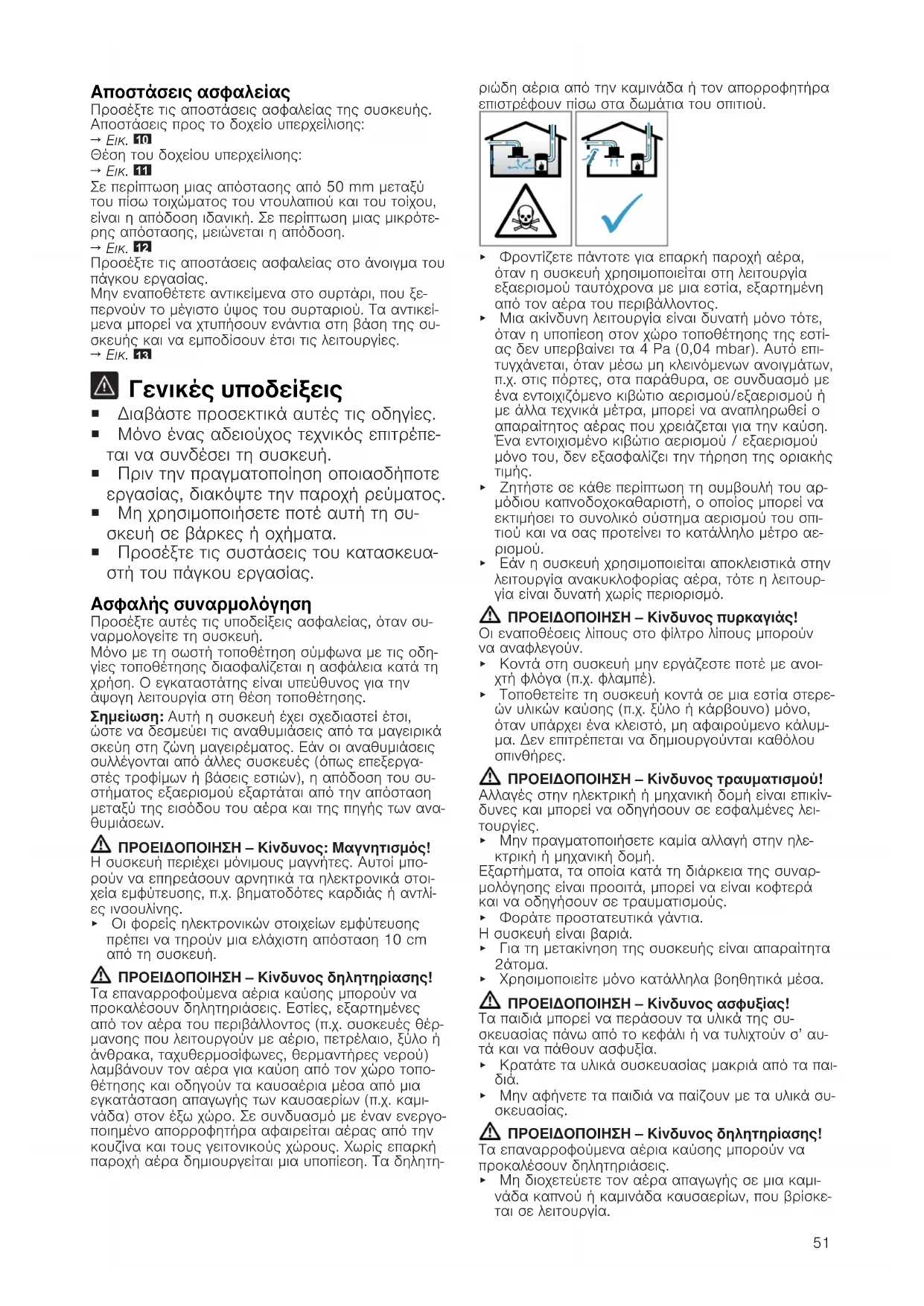 ΠΡΟΕΙΔΟΠΟΙΗΣΗ‒Κίνδυνος: Μαγνητισμός! Η συσκευή περιέχει μόνιμους μαγνήτες. Αυτοί μπο- ρούν να επηρεάσουν αρνητικά τα ηλεκτρονικά στοι- χεία εμφύτευσης, π.χ. βηματοδότες καρδιάς ή αντλί- ες ινσουλίνης. ▶ Οι φορείς ηλεκτρονικών στοιχείων εμφύτευσης πρέπει να τηρούν μια ελάχιστη απόσταση 10 cm από τη συσκευή. ΠΡΟΕΙΔΟΠΟΙΗΣΗ‒Κίνδυνος δηλητηρίασης! Τα επαναρροφούμενα αέρια καύσης μπορούν να προκαλέσουν δηλητηριάσεις. Εστίες, εξαρτημένες από τον αέρα του περιβάλλοντος (π.χ. συσκευές θέρ- μανσης που λειτουργούν με αέριο, πετρέλαιο, ξύλο ή άνθρακα, ταχυθερμοσίφωνες, θερμαντήρες νερού) λαμβάνουν τον αέρα για καύση από τον χώρο τοπο- θέτησης και οδηγούν τα καυσαέρια μέσα από μια εγκατάσταση απαγωγής των καυσαερίων (π.χ. καμι- νάδα) στον έξω χώρο. Σε συνδυασμό με έναν ενεργο- ποιημένο απορροφητήρα αφαιρείται αέρας από την κουζίνα και τους γειτονικούς χώρους. Χωρίς επαρκή παροχή αέρα δημιουργείται μια υποπίεση. Τα δηλητη- ριώδη αέρια από την καμινάδα ή τον απορροφητήρα επιστρέφουν πίσω στα δωμάτια του σπιτιού. ▶ Φροντίζετε πάντοτε για επαρκή παροχή αέρα, όταν η συσκευή χρησιμοποιείται στη λειτουργία εξαερισμού ταυτόχρονα με μια εστία, εξαρτημένη από τον αέρα του περιβάλλοντος. ▶ Μια ακίνδυνη λειτουργία είναι δυνατή μόνο τότε, όταν η υποπίεση στον χώρο τοποθέτησης της εστί- ας δεν υπερβαίνει τα 4 Pa (0,04 mbar). Αυτό επι- τυγχάνεται, όταν μέσω μη κλεινόμενων ανοιγμάτων, π.χ. στις πόρτες, στα παράθυρα, σε συνδυασμό με ένα εντοιχιζόμενο κιβώτιο αερισμού/εξαερισμού ή με άλλα τεχνικά μέτρα, μπορεί να αναπληρωθεί ο απαραίτητος αέρας που χρειάζεται για την καύση. Ένα εντοιχισμένο κιβώτιο αερισμού / εξαερισμού μόνο του, δεν εξασφαλίζει την τήρηση της οριακής