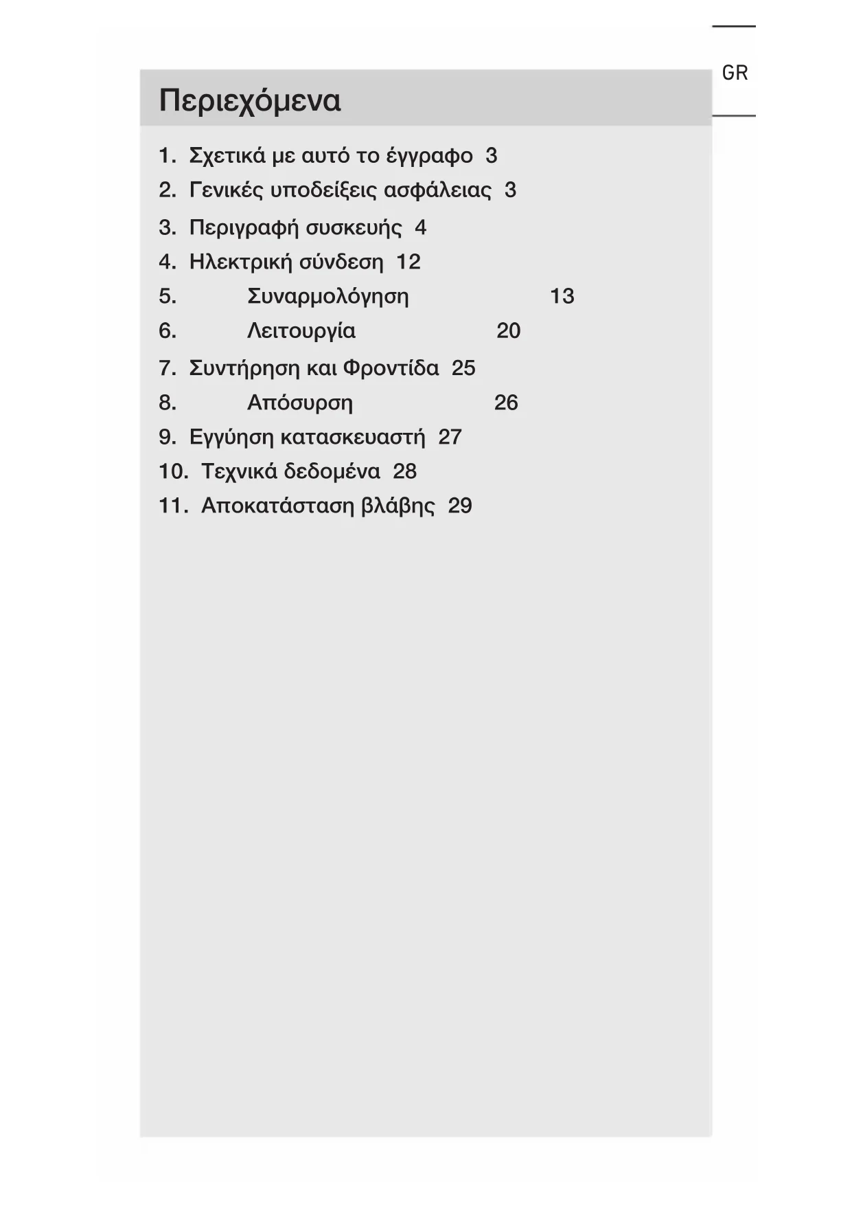 Οι ηλεκτρικές συσκευές, τα εξαρτήματα και οι συσκευα- σίες πρέπει να ανακυκλώνονται με τρόπο φιλικό προς το περιβάλλον. Δεν επιτρέπεται να πετάτε ηλεκτρικές συσκευές στα οικιακά απορρίμματα! Μόνο για χώρες ΕΕ: Σύμφωνα με την ισχύουσα Ευρωπαϊκή Οδηγία σχετικά με άχρηστες ηλεκτρικές και ηλεκτρονικές συσκευές και την εφαρμογή της σε εθνικό δίκαιο πρέπει οι άχρηστες πλέον ηλεκτρικές συσκευές να αποσύρονται ξεχωριστά και να οδηγούνται σε ανακύκλωση φιλική προς το περιβάλλον.– 27 – Περιεχόμενα GRGR