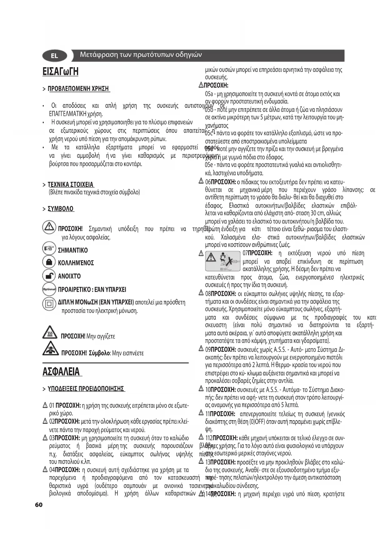 03ΠΡΟΣΟΧΗ:μηχρησιμοποιείτετησυσκευήόταντοκαλώδιο ρεύματος ή βασικά μέρητης συσκευής παρουσιάζουν βλάβη, π.χ. διατάξεις ασφαλείας, εύκαμπτος σωλήνας υψηλής πίεσης τουπιστολιούκ.λπ.