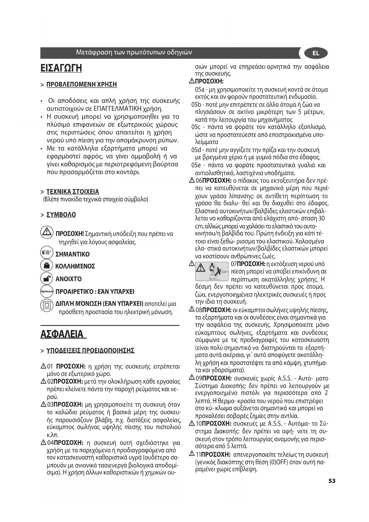- Το ξανατοποθετείτε στη θέση. > ΕΠΙΣΚΕΥΕΣ - ΑΝΤΑΛΛΑΚΤΙΚΑ Για ενδεχόμενα προβλήματα που δεν αναφέρονται στο παρόν εγχειρίδιο ή σπασίματα της μηχανής παρακαλείσθε να επικοινωνήσετε με ένα Εξουσιοδοτημένο Κέντρο Τεχνικής Υποστήριξης για τη σχετική επισκευή ή για την ενδεχόμενη αντικατάσταση αυθεντικών ανταλλακτικών. Χρησιμοποιείτε αποκλειστικά αυθεντικά ανταλλακτικά. > ΟΡΟΙ ΕΓΓΥΗΣΗΣ Όλες οι συσκευές μας έχουν υποστεί αυστηρές δοκιμές και καλύπτονται από εγγύηση για κατασκευαστικά ελαττώματα σύμφωνα με την ισχύουσα νομοθεσία (τουλάχιστον 12 μήνες). Η εγγύηση ισχύει από την ημερομηνία αγοράς. Σε περίπτωση που στείλετε μία συσκευή καθαρισμού υψηλής πίεσης ή εξαρτήματά της για επισκευή τότε πρέπει να συμπεριλάβετε στην αποστολή και ένα αντίγραφο της