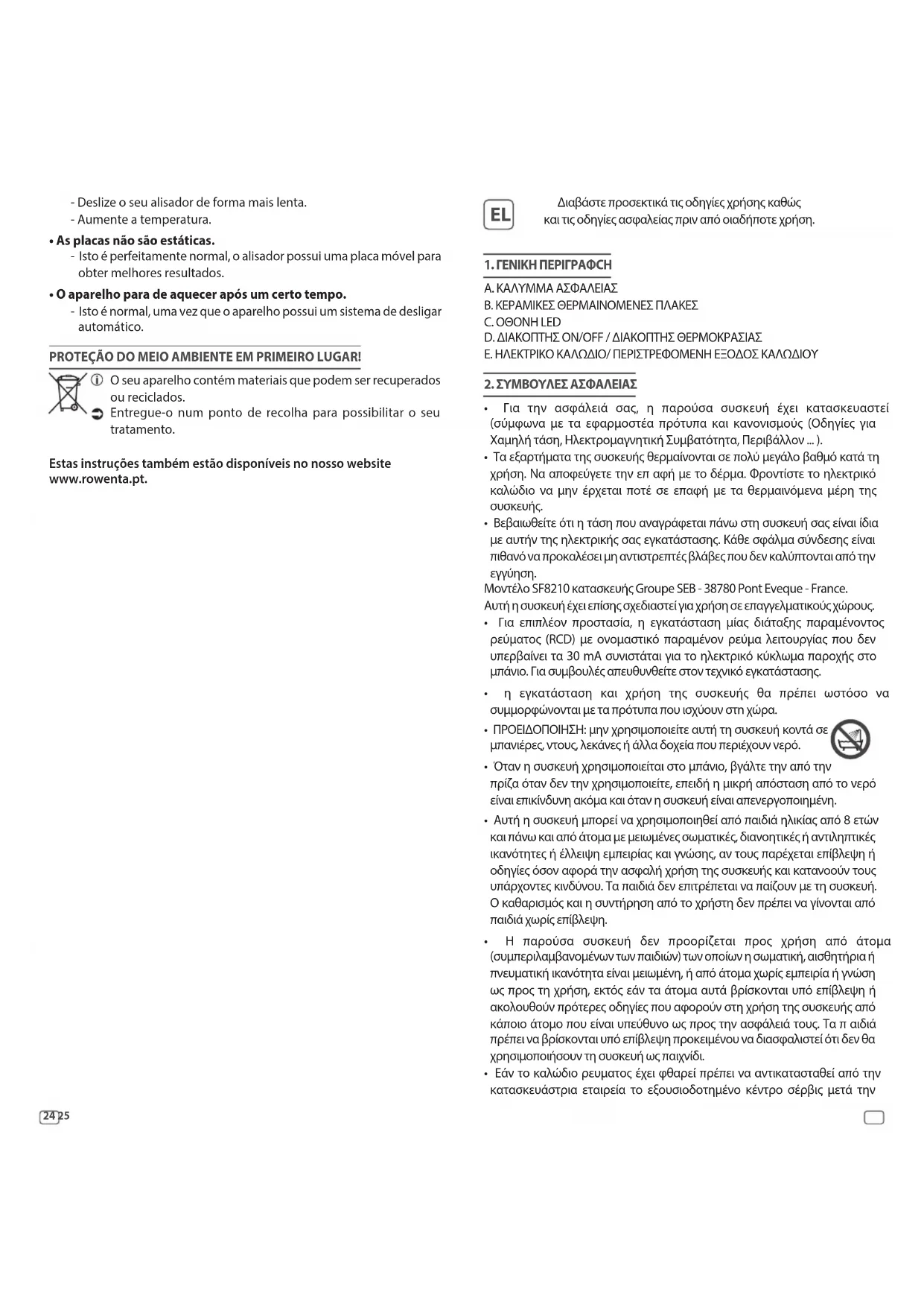 - Η συσκευή σταματά να θερμαίνεται μετά από ορισμένο χρόνο: - Αυτό είναι φυσιολογικό, η συσκευή διαθέτει αυτόματο σύστημα απενεργοποίησης. ΑΣ ΣΥΜΒΑΛΛΟΥΜΕ ΚΙ ΕΜΕΙΣ ΣΤΗΝ ΠΡΟΣΤΑΣΙΑ ΤΟΥ ΠΕΡΙΒΑΛΛΟΝΤΟΣ! συσκευή σας περιέχει πολλά αξιοποιήσιμα ή ανακυκλώσιμα υλικά. Παραδώστε την παλιά συσκευή σας σε κέντρο διαλογής ή ελλείψει τέτοιου κέντρου σε εξουσιοδοτημένο κέντρο σέρβις το οποίο θα αναλάβει την επεξεργασία της. Αυτές οι οδηγίες διατίθενται επίσης και από το διαδικτυακό μας τόπο www.rowenta.com.28 29 Her türlü kullanım öncesi kullanım kılavuzunu ve güvenlik talimatlarını dikkatle okuyunuz.