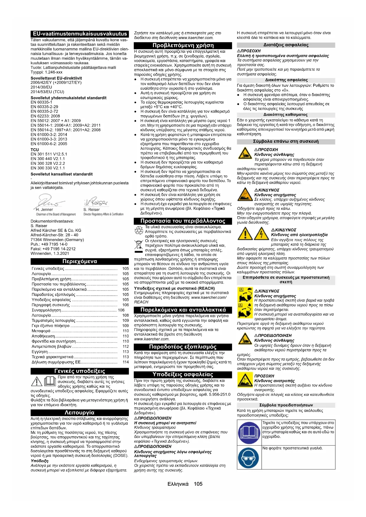 Allekirjoittaneet toimivat yrityksen johtokunnan puolesta ja sen valtakirjalla. Dokumentointivastaava: S. Reiser Alfred Kärcher SE & Co. KG Alfred-Kärcher-Str. 28 - 40 71364 Winnenden (Germany) Puh.: +49 7195 14-0 Faksi: +49 7195 14-2212 Winnenden, 1.3.2021 Περιεχόμενα Γενικές υποδείξεις Πριν από την πρώτη χρήση της συσκευής, διαβάστε αυτές τις γνήσιες οδηγίες χρήσης καθώς και τις συνοδευτικές υποδείξεις ασφαλείας. Εφαρμόζετε αυτές τις οδηγίες. Φυλάξτε τα δύο βιβλιαράκια για μεταγενέστερη χρήση ή για τον επόμενο ιδιοκτήτη.