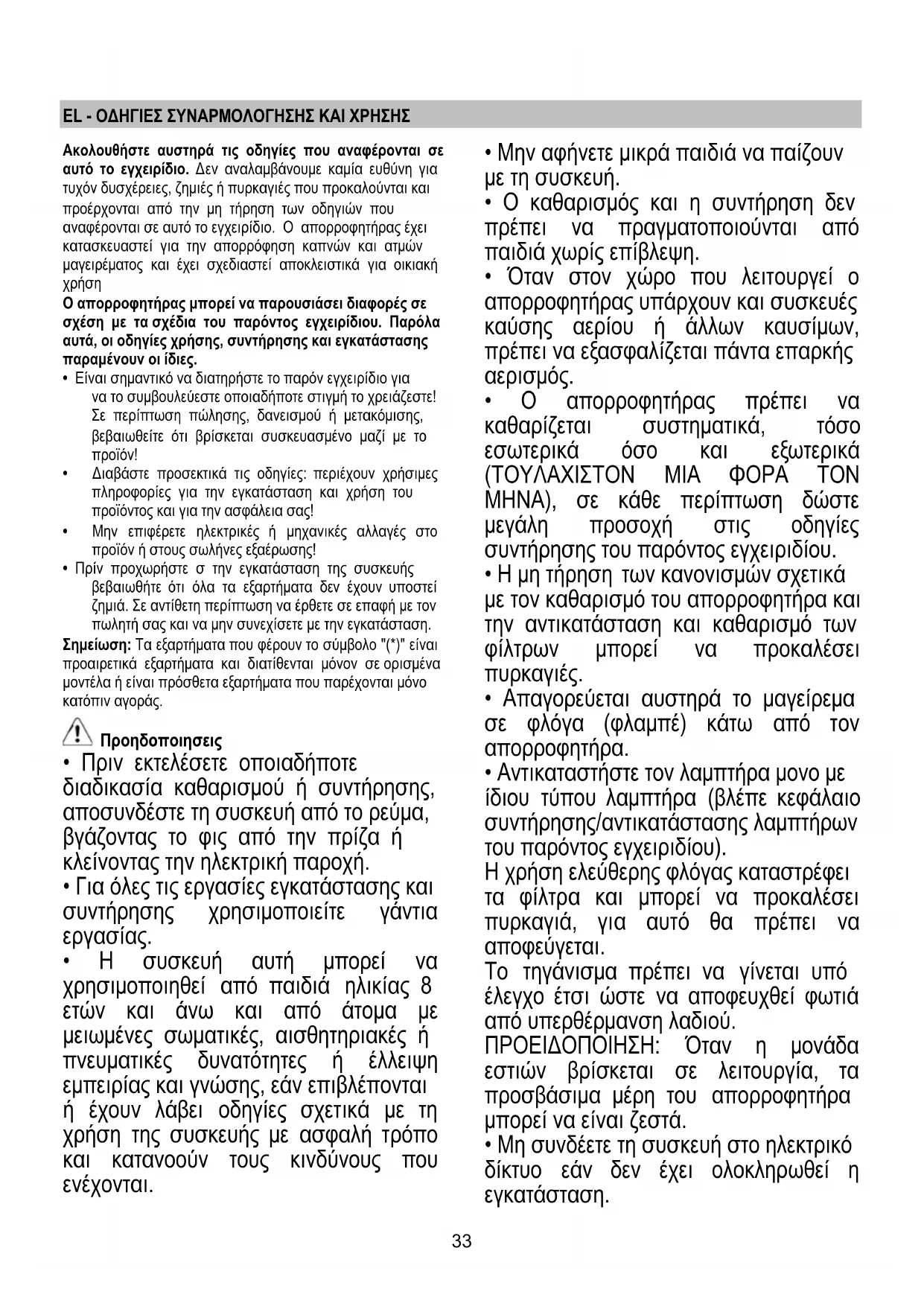- Όταν στον χώρο που λειτουργεί ο απορροφητήρας υπάρχουν και συσκευές καύσης αερίου ή άλλων καυσίμων, πρέπει να εξασφαλίζεται πάντα επαρκής