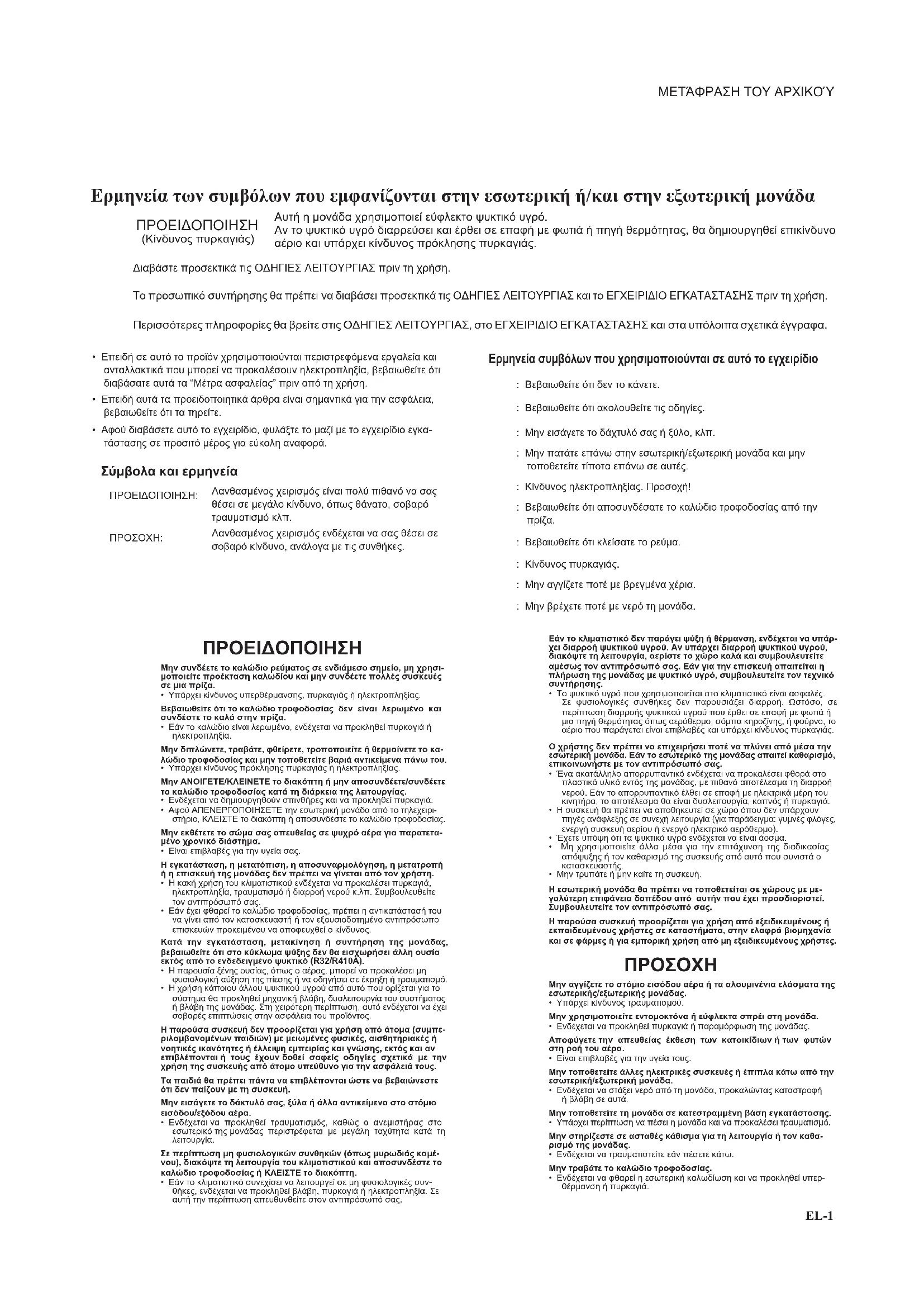 - Επειδή σε αυτό το προϊόν χρησιμοποιούνται περιστρεφόμενα εργαλεία και ανταλλακτικά που μπορεί να προκαλέσουν ηλεκτροπληξία, βεβαιωθείτε ότι διαβάσατε αυτά τα “Μέτρα ασφαλείας” πριν από τη χρήση.• Επειδή αυτά τα προειδοποιητικά άρθρα είναι σημαντικά για την ασφάλεια, βεβαιωθείτε ότι τα τηρείτε.• Αφού διαβάσετε αυτό το εγχειρίδιο, φυλάξτε το μαζί με το εγχειρίδιο εγκα-τάστασης σε προσιτό μέρος για εύκολη αναφορά. Σύμβολα και ερμηνεία ΠΡΟΕΙΔΟΠΟΙΗΣΗ:Λανθασμένος χειρισμός είναι πολύ πιθανό να σας θέσει σε μεγάλο κίνδυνο, όπως θάνατο, σοβαρό τραυματισμό κλπ. ΠΡΟΣΟΧΗ:Λανθασμένος χειρισμός ενδέχεται να σας θέσει σε σοβαρό κίνδυνο, ανάλογα με τις συνθήκες. Ερμηνεία συμβόλων που χρησιμοποιούνται σε αυτό το εγχειρίδιο : Βεβαιωθείτε ότι δεν το κάνετε. : Βεβαιωθείτε ότι ακολουθείτε τις οδηγίες. : Μην εισάγετε το δάχτυλό σας ή ξύλο, κλπ. : Μην πατάτε επάνω στην εσωτερική/εξωτερική μονάδα και μην τοποθετείτε τίποτα επάνω σε αυτές. : Κίνδυνος ηλεκτροπληξίας. Προσοχή! : Βεβαιωθείτε ότι αποσυνδέσατε το καλώδιο τροφοδοσίας από την πρίζα. : Βεβαιωθείτε ότι κλείσατε το ρεύμα. : Κίνδυνος πυρκαγιάς. : Μην αγγίζετε ποτέ με βρεγμένα χέρια. : Μην βρέχετε ποτέ με νερό τη μονάδα. ΜΕΤΡΑ ΑΣΦΑΛΕΙΑΣ Ερμηνεία των συμβόλων που εμφανίζονται στην εσωτερική ή/και στην εξωτερική μονάδα ΠΡΟΕΙΔΟΠΟΙΗΣΗ (Κίνδυνος πυρκαγιάς)Αυτή η μονάδα χρησιμοποιεί εύφλεκτο ψυκτικό υγρό.Αν το ψυκτικό υγρό διαρρεύσει και έρθει σε επαφή με φωτιά ή πηγή θερμότητας, θα δημιουργηθεί επικίνδυνο αέριο και υπάρχει κίνδυνος πρόκλησης πυρκαγιάς.Διαβάστε προσεκτικά τις ΟΔΗΓΙΕΣ ΛΕΙΤΟΥΡΓΙΑΣ πριν τη χρήση. Το προσωπικό συντήρησης θα πρέπει να διαβάσει προσεκτικά τις ΟΔΗΓΙΕΣ ΛΕΙΤΟΥΡΓΙΑΣ και το ΕΓΧΕΙΡΙΔΙΟ ΕΓΚΑΤΑΣΤΑΣΗΣ πριν τη χρήση. Περισσότερες πληροφορίες θα βρείτε στις ΟΔΗΓΙΕΣ ΛΕΙΤΟΥΡΓΙΑΣ, στο ΕΓΧΕΙΡΙΔΙΟ ΕΓΚΑΤΑΣΤΑΣΗΣ και στα υπόλοιπα σχετικά έγγραφα. ΠΡΟΕΙΔΟΠΟΙΗΣΗ Μην συνδέετε το καλώδιο ρεύματος σε ενδιάμεσο σημείο, μη χρησι-μοποιείτε προέκταση καλωδίου και μην συνδέετε πολλές συσκευές σε μια πρίζα.• Υπάρχει κίνδυνος υπερθέρμανσης, πυρκαγιάς ή ηλεκτροπληξίας.Βεβαιωθείτε ότι το καλώδιο τροφοδοσίας δεν είναι λερωμένο και συνδέστε το καλά στην πρίζα.• Εάν το καλώδιο είναι λερωμένο, ενδέχεται να προκληθεί πυρκαγιά ή ηλεκτροπληξία.Μην διπλώνετε, τραβάτε, φθείρετε, τροποποιείτε ή θερμαίνετε το κα-λώδιο τροφοδοσίας και μην τοποθετείτε βαριά αντικείμενα πάνω του.• Υπάρχει κίνδυνος πρόκλησης πυρκαγιάς ή ηλεκτροπληξίας.Μην ΑΝΟΙΓΕΤΕ/ΚΛΕΙΝΕΤΕ το διακόπτη ή μην αποσυνδέετε/συνδέετε το καλώδιο τροφοδοσίας κατά τη διάρκεια της λειτουργίας.• Ενδέχεται να δημιουργηθούν σπινθήρες και να προκληθεί πυρκαγιά.• Αφού ΑΠΕΝΕΡΓΟΠΟΙΗΣΕΤΕ την εσωτερική μονάδα από το τηλεχειρι-στήριο, ΚΛΕΙΣΤΕ το διακόπτη ή αποσυνδέστε το καλώδιο τροφοδοσίας. Μην εκθέτετε το σώμα σας απευθείας σε ψυχρό αέρα για παρατετα-μένο χρονικό διάστημα.• Είναι επιβλαβές για την υγεία σας.Η εγκατάσταση, η μετατόπιση, η αποσυναρμολόγηση, η μετατροπή ή η επισκευή της μονάδας δεν πρέπει να γίνεται από τον χρήστη.• Η κακή χρήση του κλιματιστικού ενδέχεται να προκαλέσει πυρκαγιά, ηλεκτροπληξία, τραυματισμό ή διαρροή νερού κ.λπ. Συμβουλευθείτε τον αντιπρόσωπό σας.• Εάν έχει φθαρεί το καλώδιο τροφοδοσίας, πρέπει η αντικατάστασή του να γίνει από τον κατασκευαστή ή τον εξουσιοδοτημένο αντιπρόσωπο επισκευών προκειμένου να αποφευχθεί 