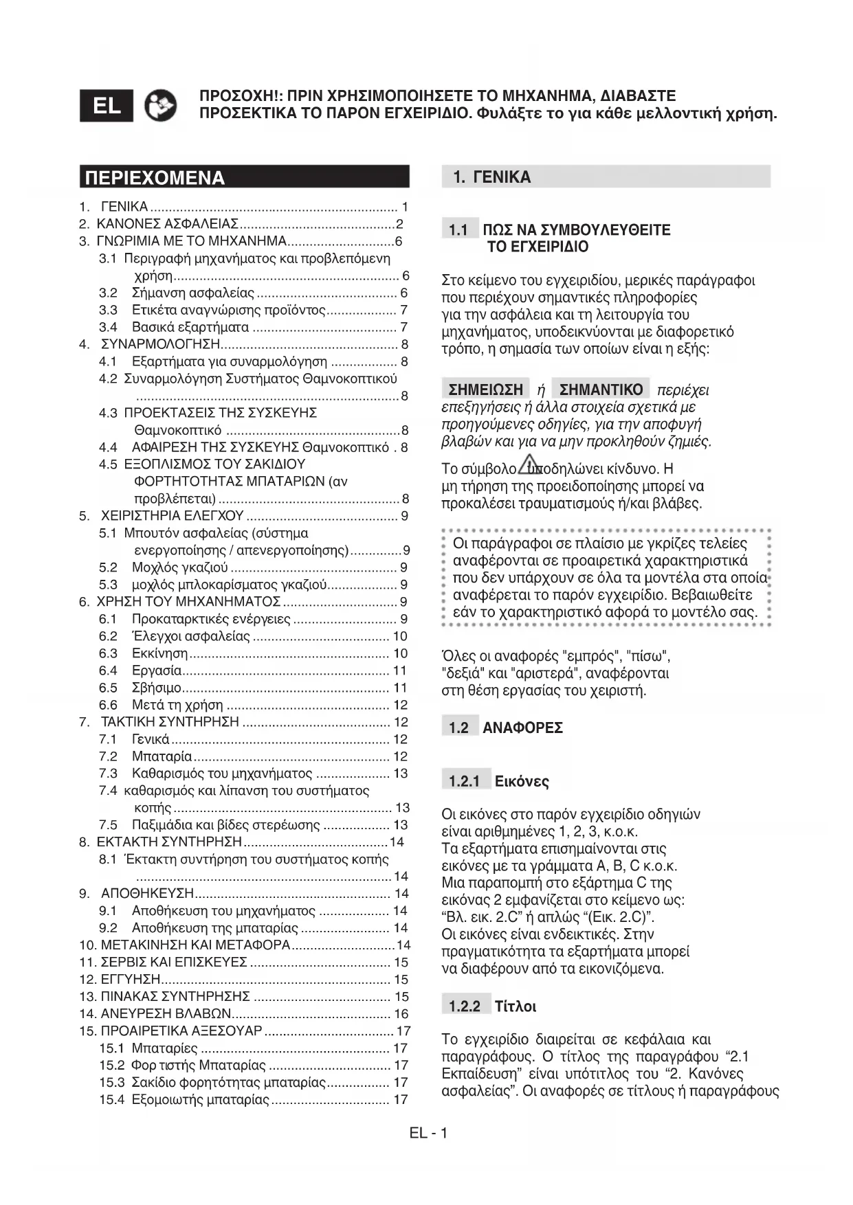 Οι παρακάτω κανονισμοί ασφαλείας συ- μπληρώνουν τις προδιαγραφές ασφαλεί- ας που υπάρχουν στις οδηγίες χρήσης της μπαταρίας και του φορτιστή μπαταρίας που επισυνάπτονται στο μηχάνημα.
