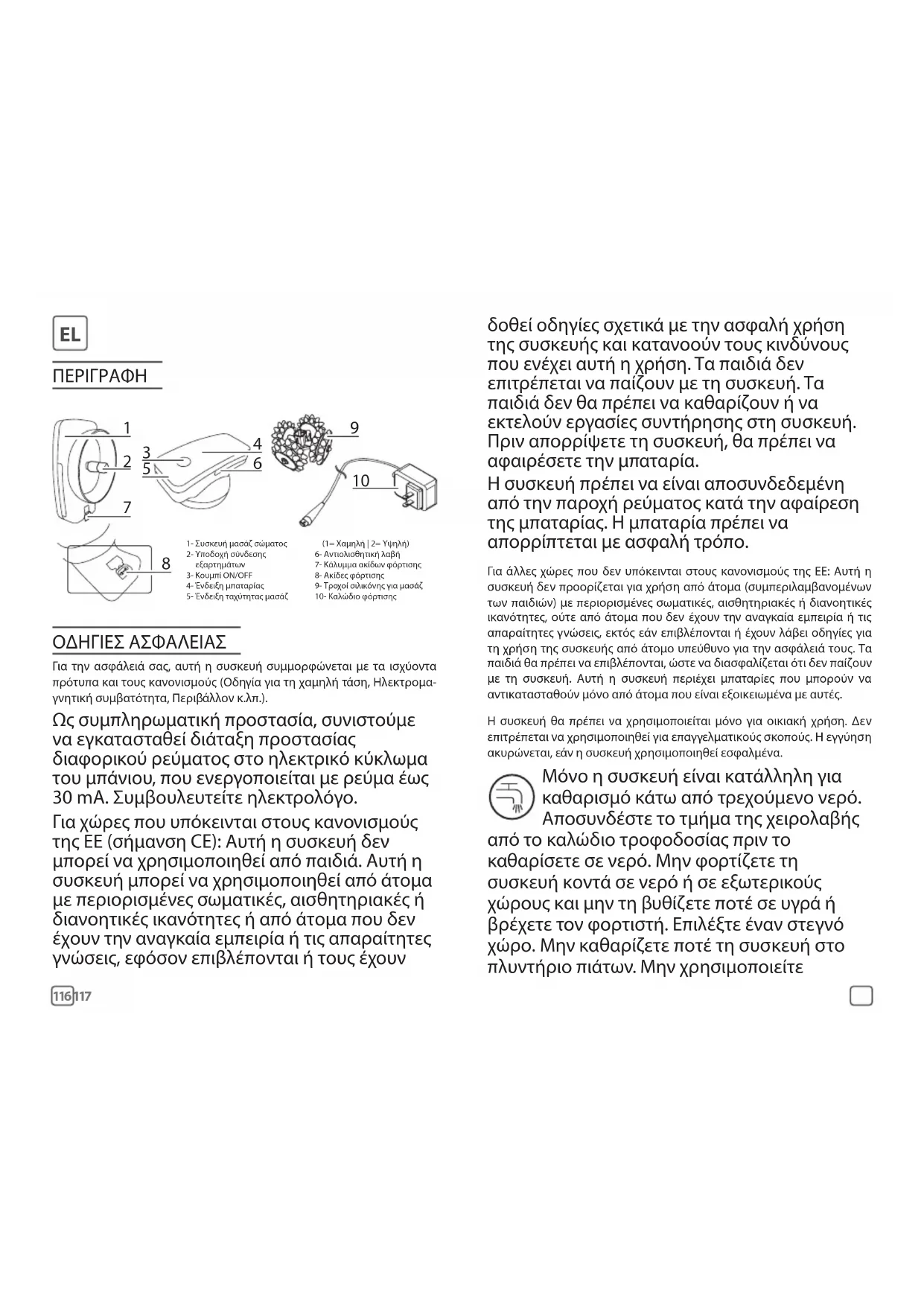 δοθεί οδηγίες σχετικά με την ασφαλή χρήση της συσκευής και κατανοούν τους κινδύνους που ενέχει αυτή η χρήση. Τα παιδιά δεν επιτρέπεται να παίζουν με τη συσκευή. Τα παιδιά δεν θα πρέπει να καθαρίζουν ή να εκτελούν εργασίες συντήρησης στη συσκευή. Πριν απορρίψετε τη συσκευή, θα πρέπει να αφαιρέσετε την μπαταρία. Η συσκευή πρέπει να είναι αποσυνδεδεμένη από την παροχή ρεύματος κατά την αφαίρεση της μπαταρίας. Η μπαταρία πρέπει να απορρίπτεται με ασφαλή τρόπο. Για άλλες χώρες που δεν υπόκεινται στους κανονισμούς της ΕΕ: Αυτή η συσκευή δεν προορίζεται για χρήση από άτομα (συμπεριλαμβανομένων των παιδιών) με περιορισμένες σωματικές, αισθητηριακές ή διανοητικές ικανότητες, ούτε από άτομα που δεν έχουν την αναγκαία εμπειρία ή τις απαραίτητες γνώσεις, εκτός εάν επιβλέπονται ή έχουν λάβει οδηγίες για τη χρήση της συσκευής από άτομο υπεύθυνο για την ασφάλειά τους. Τα παιδιά θα πρέπει να επιβλέπονται, ώστε να διασφαλίζεται ότι δεν παίζουν με τη συσκευή. Αυτή η συσκευή περιέχει μπαταρίες που μπορούν να αντικατασταθούν μόνο από άτομα που είναι εξοικειωμένα με αυτές. Η συσκευή θα πρέπει να χρησιμοποιείται μόνο για οικιακή χρήση. Δεν επιτρέπεται να χρησιμοποιηθεί για επαγγελματικούς σκοπούς. Η εγγύηση ακυρώνεται, εάν η συσκευή χρησιμοποιηθεί εσφαλμένα. Μόνο η συσκευή είναι κατάλληλη για καθαρισμό κάτω από τρεχούμενο νερό. Αποσυνδέστε το τμήμα της χειρολαβής από το καλώδιο τροφοδοσίας πριν το καθαρίσετε σε νερό. Μην φορτίζετε τη συσκευή κοντά σε νερό ή σε εξωτερικούς χώρους και μην τη βυθί ζετε ποτέ σε υγρ ά ή βρέχετε τον φορτιστή. Επιλέξτε έναν στεγνό χώρο. Μην καθαρίζετε ποτέ τη συσκευή στο πλυντήριο πιάτων. Μην χρησιμοποιείτε118 119 διαβρωτικά προϊόντα καθαρισμού (οινόπνευμα, ξύδι...) Η συσκευή μασάζ με την κεφαλή μασάζ μπορεί να χρησιμοποιηθεί κατά το μπάνιο ή το ντους. Πριν από οποιαδήποτε χρήση, βεβαιωθείτε ότι το προϊόν και τα αξεσουάρ δεν έχουν κάποιο ελάττωμα. Εάν η συσκευή σας είναι κατεστραμμένη ή εμφανίζει κάποιο ελάττωμα, μην τη χρησιμοποιείτε πλέον. Εάν η συσκευή σας πέσει και κατόπιν δεν λειτουργεί κανονικά, μην τη χρησιμοποιήσετε και επικοινωνήστε με το τμήμα εξυπηρέτησης πελατών. Αν υποστεί ζημιά το ηλεκτρικό καλώδιο, θα πρέπει να αντικατασταθεί από τον κατασκευαστή, τον αντιπρόσωπο σέρβις του κατασκευαστή ή από άτομο με παρόμοια εξουσιοδότηση, για να αποφευχθεί τυχόν κίνδυνος. Αποσπώμενο τροφοδοτικό ΠΡΟΕΙΔΟΠΟΙΗΣΗ: Για να επαναφορτίσετε την μπαταρία, χρησιμοποιείτε μόνο το τροφοδοτικό και τη βάση 1002 που παρέχονται με αυτήν τη συσκευή. Για βέλτιστη φόρτιση, η συσκευή θα πρέπει να τοποθετείται σωστά στη βάση. Βεβαιωθείτε ότι η συσκευή συμμορφώνεται με το δίκτυο τροφοδοσίας της χώρας σας. Μην αποσυνδέετε το καλώδιο τραβώντας το ίδιο το καλώδιο, αλλά τραβώντας το φις. Μην χρησιμοποιείτε προέκταση ηλεκτρικού καλωδίου. Όταν είναι ενεργοποιημένη η συσκευή, δεν θα πρέπει να έρχεται σε επαφή με βλεφαρίδες, μαλλιά, ρούχα ή οποιοδήποτε άλλο αντικείμενο, για να αποφεύγεται ο κίνδυνος τραυματισμού ή μπλοκαρίσματος της