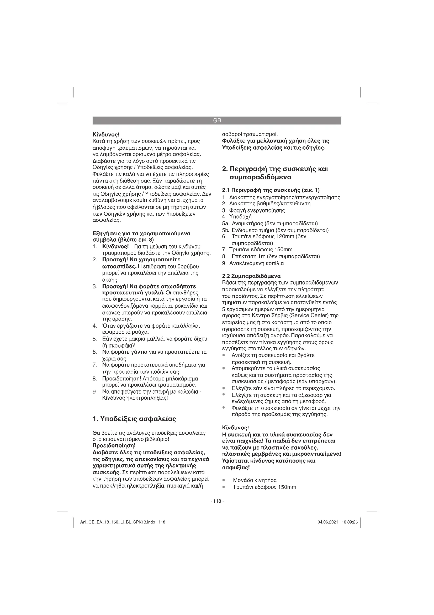 Ενεργοποίηση: Πιέστε τη φραγή ενεργοποίησης (3) και τον διακόπτη ενεργοποίησης/απενεργοποίησης (1). Anl_GE_EA_18_150_Li_BL_SPK13.indb 120Anl_GE_EA_18_150_Li_BL_SPK13.indb 120 04.06.2021 10:39:2604.06.2021 10:39:26GR