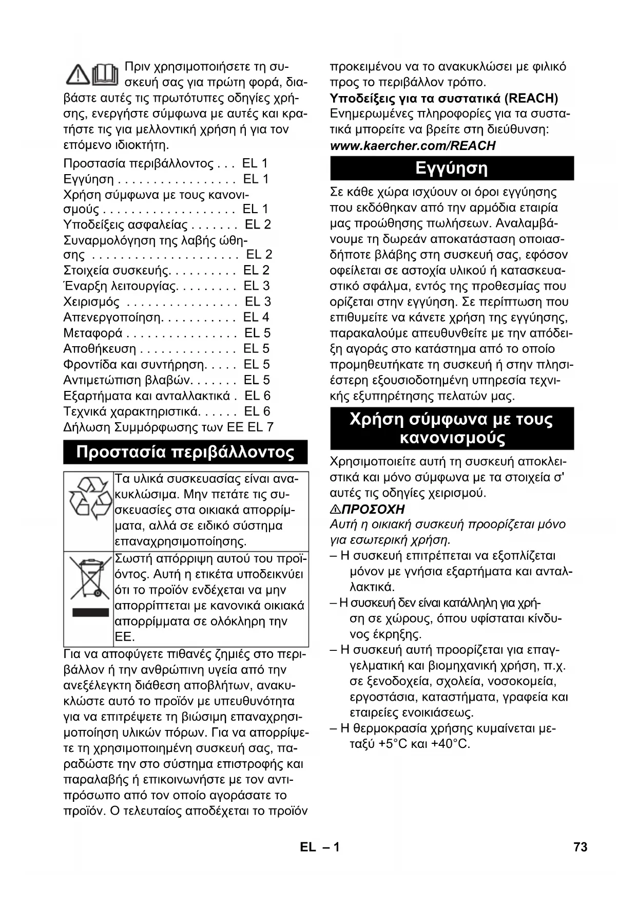 Chairman of the Board of Management Director Regulatory Affairs & Certification 72 FI– 1 Πριν χρησιμοποιήσετε τη συ- σκευή σας για πρώτη φορά, δια- βάστε αυτές τις πρωτότυπες οδηγίες χρή- σης, ενεργήστε σύμφωνα με αυτές και κρα- τήστε τις για μελλοντική χρήση ή για τον επόμενο ιδιοκτήτη. Για να αποφύγετε πιθανές ζημιές στο περι- βάλλον ή την ανθρώπινη υγεία από την ανεξέλεγκτη διάθεση αποβλήτων, ανακυ- κλώστε αυτό το προϊόν με υπευθυνότητα για να επιτρέψετε τη βιώσιμη επαναχρησι- μοποίηση υλικών πόρων. Για να απορρίψε- τε τη χρησιμοποιημένη συσκευή σας, πα- ραδώστε την στο σύστημα επιστροφής και παραλαβής ή επικοινωνήστε με τον αντι- πρόσωπο από τον οποίο αγοράσατε το προϊόν. Ο τελευταίος αποδέχεται το προϊόν προκειμένου να το ανακυκλώσει με φιλικό προς το περιβάλλον τρόπο. Υποδείξεις για τα συστατικά (REACH) Ενημερωμένες πληροφορίες για τα συστα- τικά μπορείτε να βρείτε στη διεύθυνση: www.kaercher.com/REACH Σε κάθε χώρα ισχύουν οι όροι εγγύησης που εκδόθηκαν από την αρμόδια εταιρία μας προώθησης πωλήσεων. Αναλαμβά- νουμε τη δωρεάν αποκατάσταση οποιασ- δήποτε βλάβης στη συσκευή σας, εφόσον οφείλεται σε αστοχία υλικού ή κατασκευα- στικό σφάλμα, εντός της προθεσμίας που ορίζεται στην εγγύηση. Σε περίπτωση που επιθυμείτε να κάνετε χρήση της εγγύησης, παρακαλούμε απευθυνθείτε με την απόδει- ξη αγοράς στο κατάστημα από το οποίο προμηθευτήκατε τη συσκευή ή στην πλησι- έστερη εξουσιοδοτημένη υπηρεσία τεχνι- κής εξυπηρέτησης πελατών μας. Χρησιμοποιείτε αυτή τη συσκευή αποκλει- στικά και μόνο σύμφωνα με τα στοιχεία σ' αυτές τις οδηγίες χειρισμού.