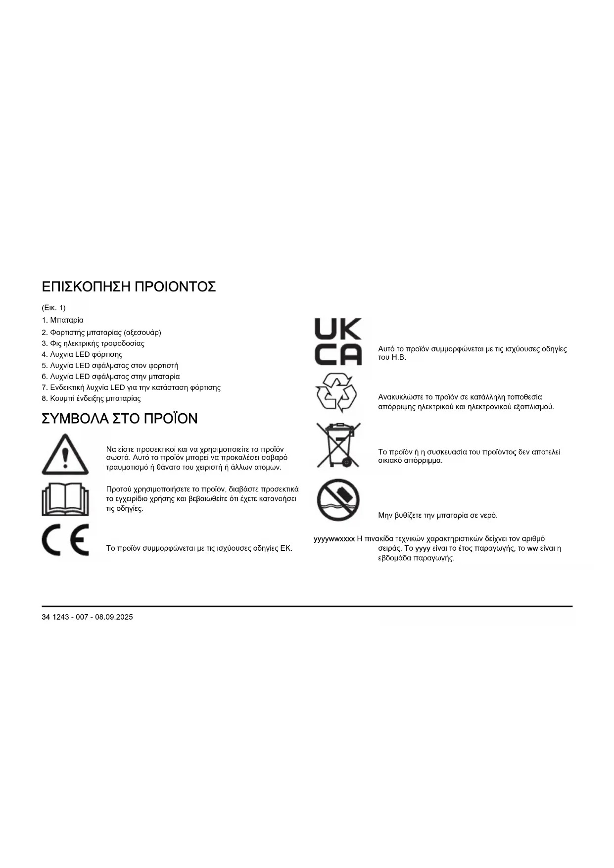 - Μην προκαλείτε μηχανική κρούση στην μπαταρία. 1243 - 007 - 08.09.2025 35• Μην αφαιρείτε την μπαταρία από τη συσκευασία της μέχρι να τη χρησιμοποιήσετε.