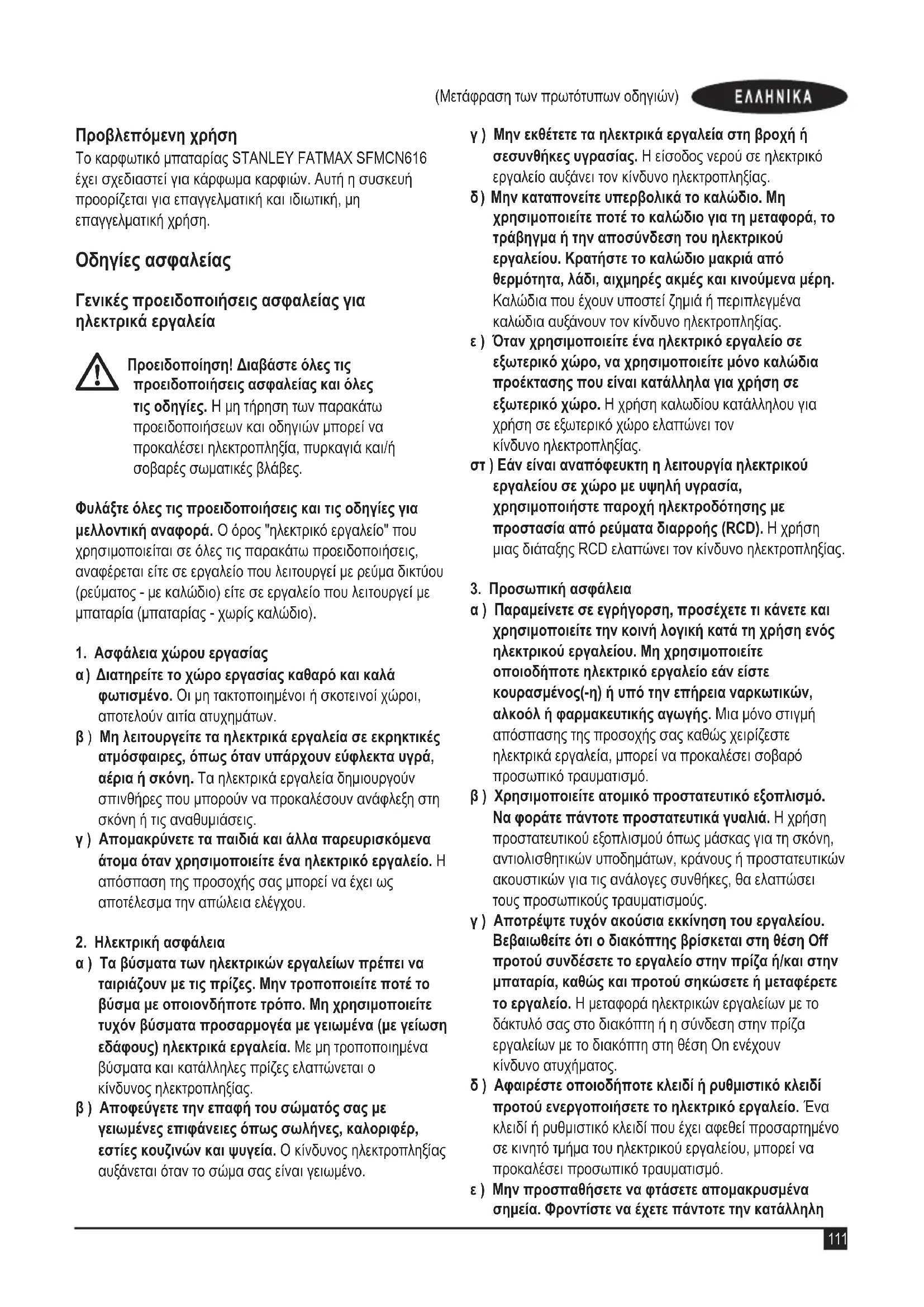 Προειδοποίηση! Διαβάστε όλες τις προειδοποιήσεις ασφαλείας και όλες τις οδηγίες. Η μη τήρηση των παρακάτω προειδοποιήσεων και οδηγιών μπορεί να προκαλέσει ηλεκτροπληξία, πυρκαγιά και/ή σοβαρές σωματικές βλάβες. Φυλάξτε όλες τις προειδοποιήσεις και τις οδηγίες για μελλοντική αναφορά. Ο όρος "ηλεκτρικό εργαλείο" που χρησιμοποιείται σε όλες τις παρακάτω προειδοποιήσεις, αναφέρεται είτε σε εργαλείο που λειτουργεί με ρεύμα δικτύου (ρεύματος - με καλώδιο) είτε σε εργαλείο που λειτουργεί με μπαταρία (μπαταρίας - χωρίς καλώδιο).