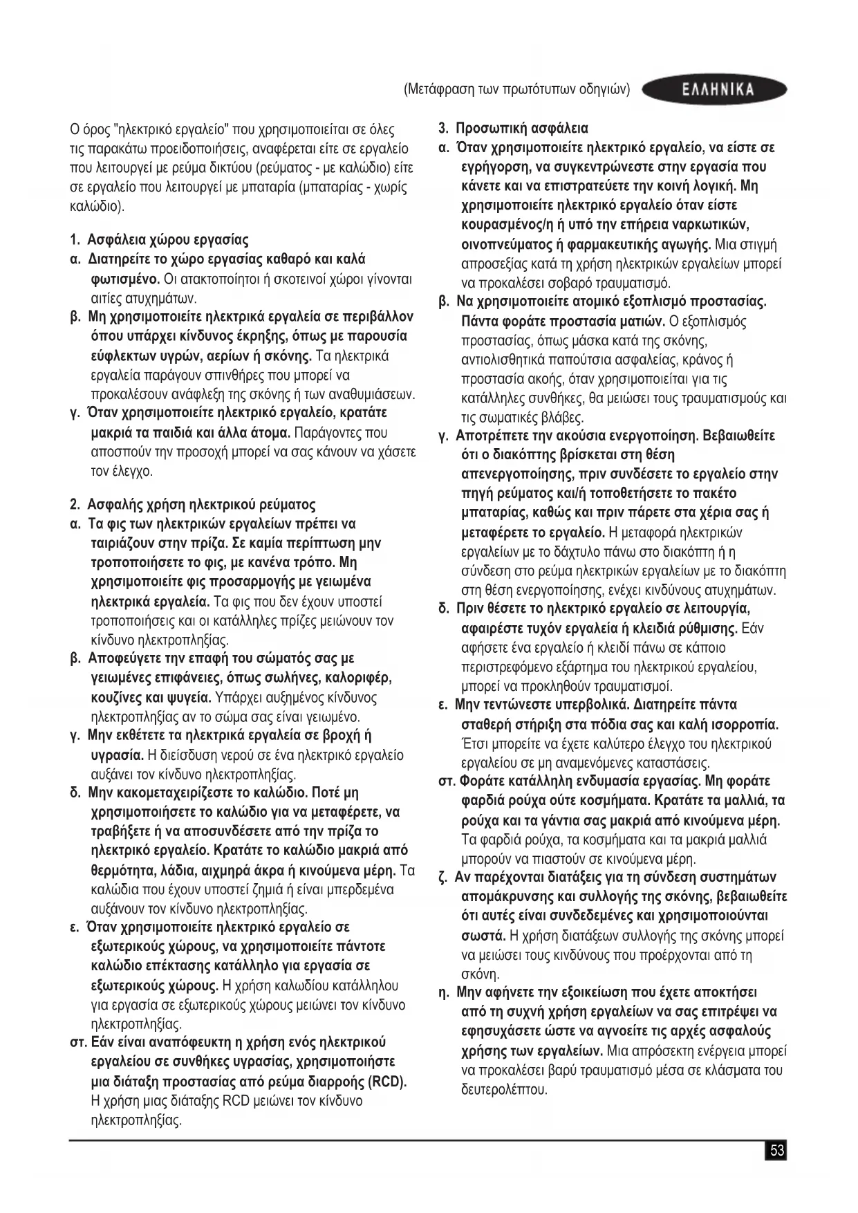 Φυλάξτε όλες τις προειδοποιήσεις και τις οδηγίες για μελλοντική αναφορά.53 (Μετάφραση των πρωτότυπων οδηγιών) Ο όρος "ηλεκτρικό εργαλείο" που χρησιμοποιείται σε όλες τις παρακάτω προειδοποιήσεις, αναφέρεται είτε σε εργαλείο που λειτουργεί με ρεύμα δικτύου (ρεύματος - με καλώδιο) είτε σε εργαλείο που λειτουργεί με μπαταρία (μπαταρίας - χωρίς