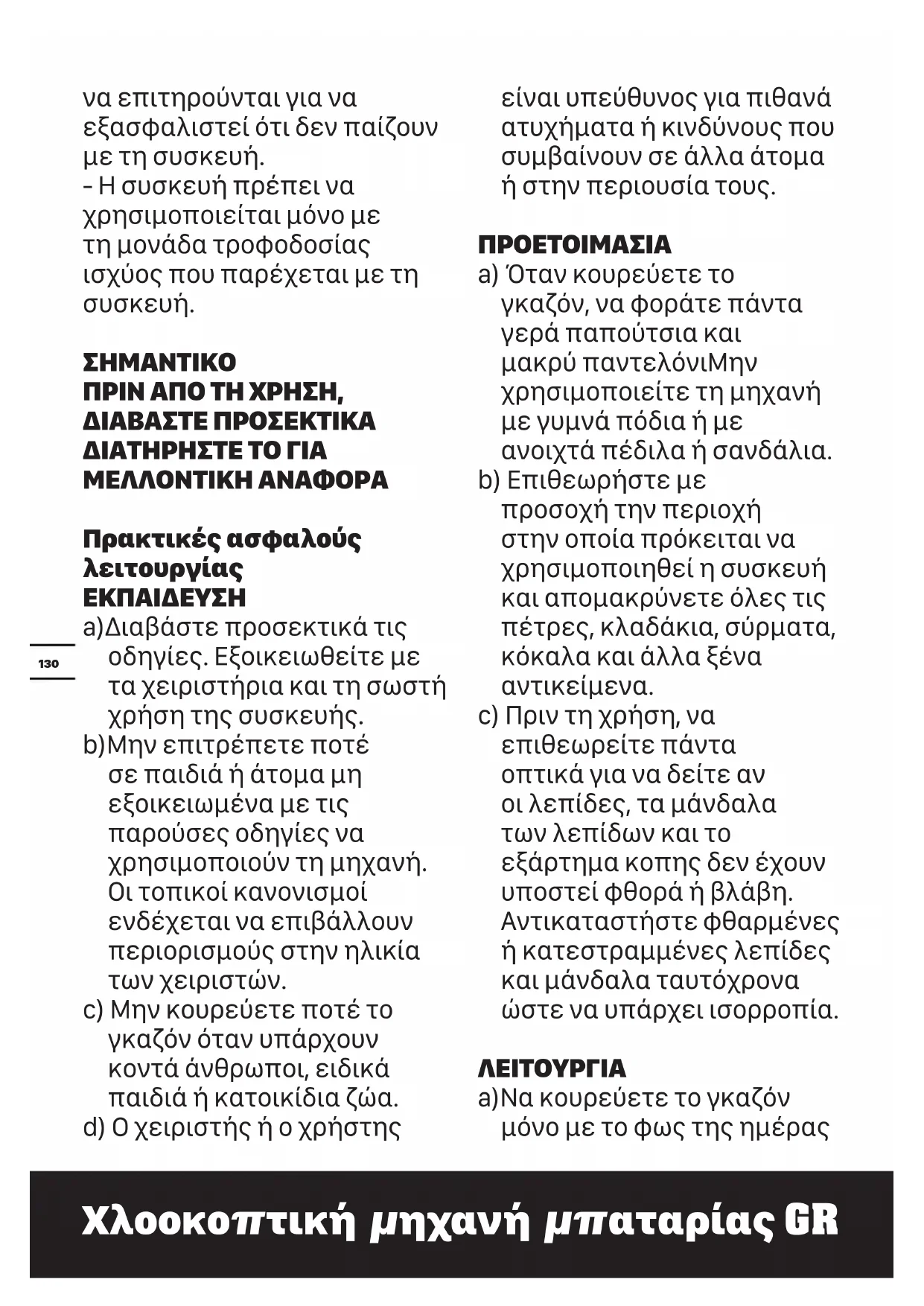 a)Διαβάστε προσεκτικά τις οδηγίες. Εξοικειωθείτε με τα χειριστήρια και τη σωστή χρήση της συσκευής. b)Μην επιτρέπετε ποτέ σε παιδιά ή άτομα μη εξοικειωμένα με τις παρούσες οδηγίες να χρησιμοποιούν τη μηχανή. Οι τοπικοί κανονισμοί ενδέχεται να επιβάλλουν περιορισμούς στην ηλικία των χειριστών. c) Μην κουρεύετε ποτέ το γκαζόν όταν υπάρχουν κοντά άνθρωποι, ειδικά παιδιά ή κατοικίδια ζώα. d) Ο χειριστής ή ο χρήστης είναι υπεύθυνος για πιθανά ατυχήματα ή κινδύνους που συμβαίνουν σε άλλα άτομα ή στην περιουσία τους. ΠΡΟΕΤΟΙΜΑΣΙΑ a) Όταν κουρεύετε το γκαζόν, να φοράτε πάντα γερά παπούτσια και μακρύ παντελόνιΜην χρησιμοποιείτε τη μηχανή με γυμνά πόδια ή με ανοιχτά πέδιλα ή σανδάλια. b) Επιθεωρήστε με προσοχή την περιοχή στην οποία πρόκειται να χρησιμοποιηθεί η συσκευή και απομακρύνετε όλες τις πέτρες, κλαδάκια, σύρματα, κόκαλα και άλλα ξένα αντικείμενα. c) Πριν τη χρήση, να επιθεωρείτε πάντα οπτικά για να δείτε αν οι λεπίδες, τα μάνδαλα των λεπίδων και το εξάρτημα κοπης δεν έχουν υποστεί φθορά ή βλάβη. Αντικαταστήστε φθαρμένες ή κατεστραμμένες λεπίδες και μάνδαλα ταυτόχρονα ώστε να υπάρχει ισορροπία.