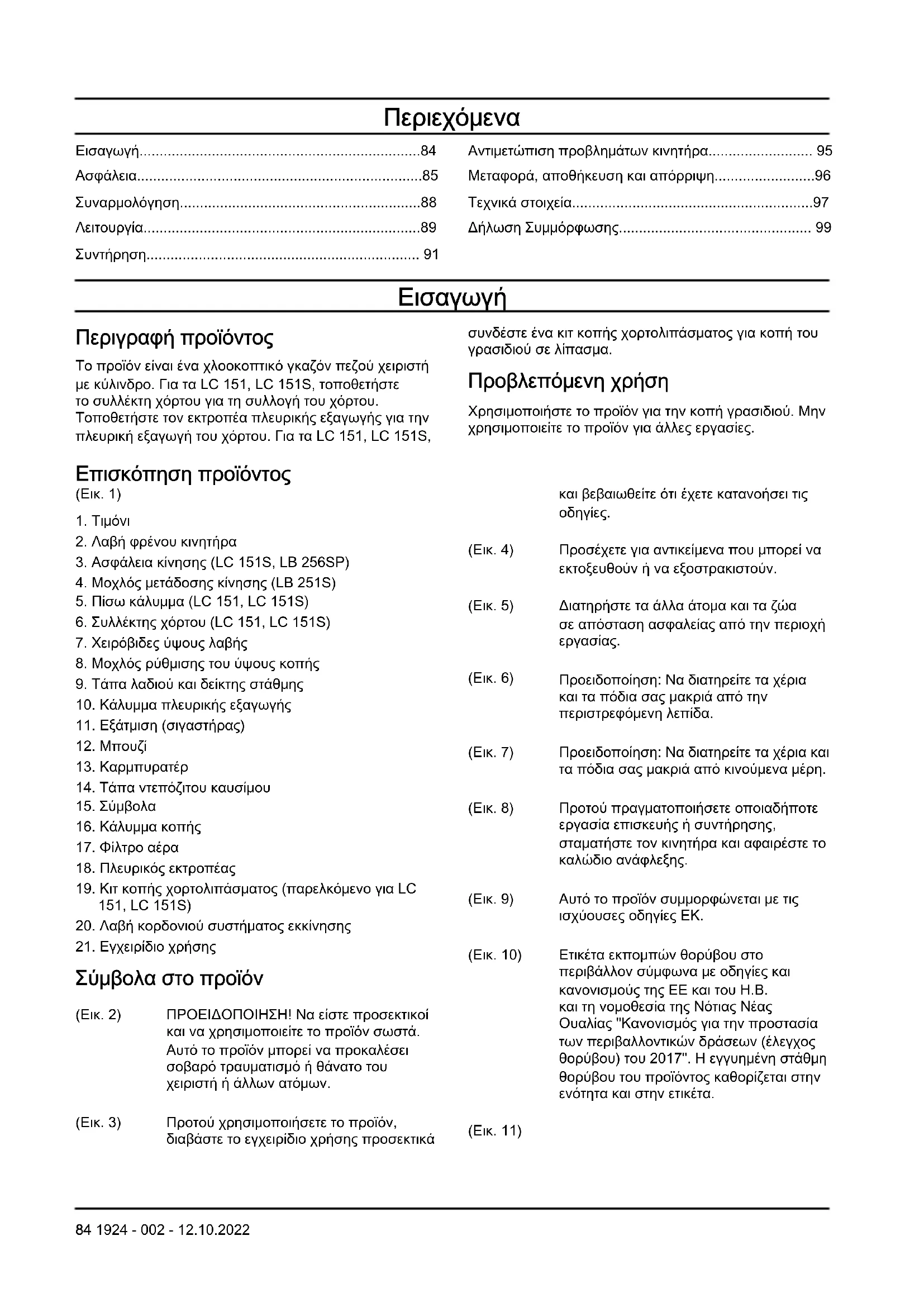 (Εικ. 6) Προειδοποίηση: Να διατηρείτε τα χέρια και τα πόδια σας μακριά από την περιστρεφόμενη λεπίδα. (Εικ. 7) Προειδοποίηση: Να διατηρείτε τα χέρια και τα πόδια σας μακριά από κινούμενα μέρη. (Εικ. 8) Προτού πραγματοποιήσετε οποιαδήποτε εργασία επισκευής ή συντήρησης, σταματήστε τον κινητήρα και αφαιρέστε το καλώδιο ανάφλεξης. (Εικ. 9) Αυτό το προϊόν συμμορφώνεται με τις ισχύουσες οδηγίες ΕΚ. (Εικ. 10) Ετικέτα εκπομπών θορύβου στο περιβάλλον σύμφωνα με οδηγίες και κανονισμούς της ΕΕ και του Η.Β. και τη νομοθεσία της Νότιας Νέας Ουαλίας "Κανονισμός για την προστασία των περιβαλλοντικών δράσεων (έλεγχος θορύβου) του 2017". Η εγγυημένη στάθμη θορύβου του προϊόντος καθορίζεται στην ενότητα και στην ετικέτα. (Εικ. 11) 84 1924 - 002 - 12.10.2022Αυτό το προϊόν συμμορφώνεται με τις ισχύουσες οδηγίες