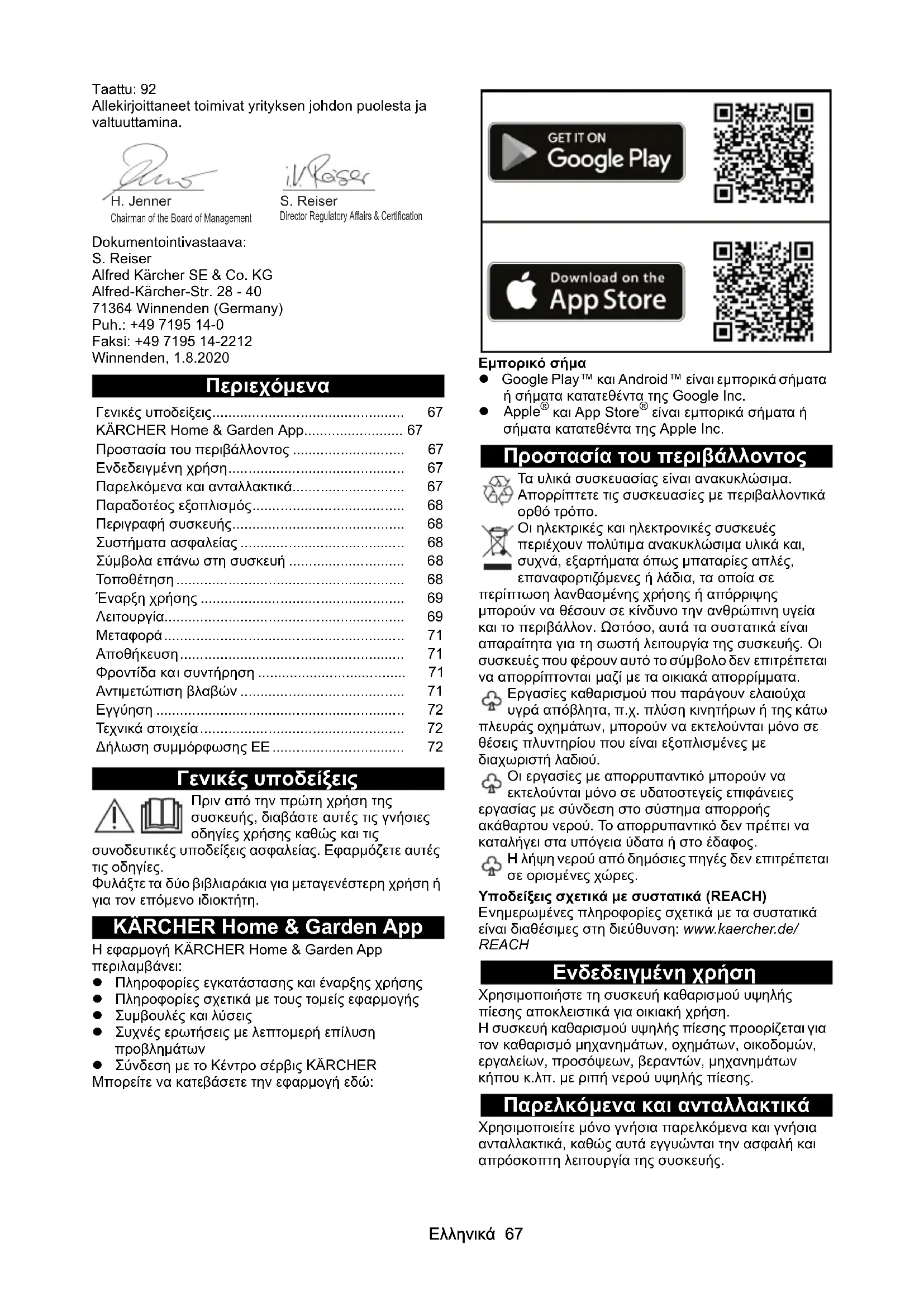 dB(A) 92 92 K 5 Premium Power Control Power ControlΕλληνικά 67 Taattu: 92 Allekirjoittaneet toimivat yrityksen johdon puolesta ja valtuuttamina. Dokumentointivastaava: S. Reiser Alfred Kärcher SE & Co. KG Alfred-Kärcher-Str. 28 - 40 71364 Winnenden (Germany) Puh.: +49 7195 14-0 Faksi: +49 7195 14-2212 Winnenden, 1.8.2020 Περιεχόμενα Γενικές υποδείξεις Πριν από την πρώτη χρήση της συσκευής, διαβάστε αυτές τις γνήσιες οδηγίες χρήσης καθώς και τις συνοδευτικές υποδείξεις ασφαλείας. Εφαρμόζετε αυτές τις οδηγίες. Φυλάξτε τα δύο βιβλιαράκια για μεταγενέστερη χρήση ή για τον επόμενο ιδιοκτήτη. KÄRCHER Home & Garden App Η εφαρμογή KÄRCHER Home & Garden App περιλαμβάνει: Πληροφορίες εγκατάστασης και έναρξης χρήσης Πληροφορίες σχετικά με τους τομείς εφαρμογής Συμβουλές και λύσεις Συχνές ερωτήσεις με λεπτομερή επίλυση προβλημάτων Σύνδεση με το Κέντρο σέρβις KÄRCHER Μπορείτε να κατεβάσετε την εφαρμογή εδώ: Εμπορικό σήμα Google Play™ και Android™ είναι εμπορικά σήματα ή σήματα κατατεθέντα της Google Inc. Apple