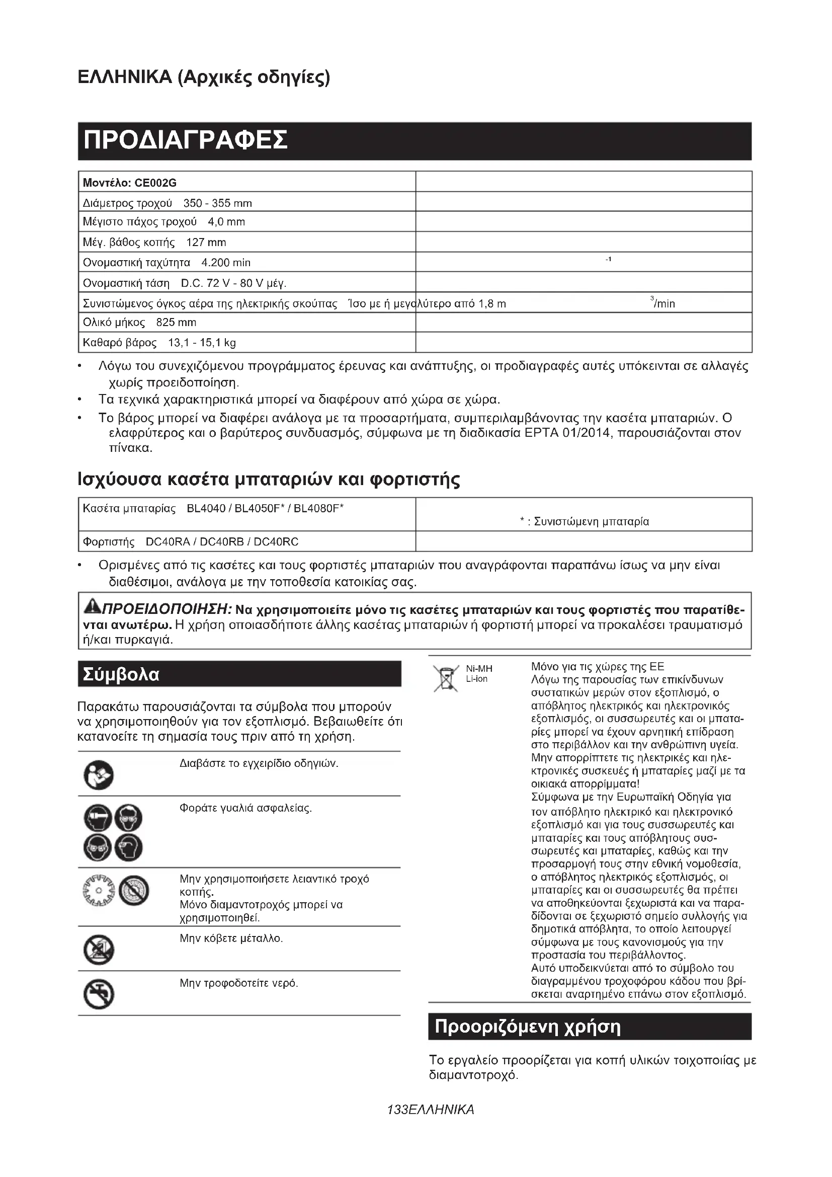 Μόνοδιαμαντοτροχόςμπορείνα χρησιμοποιηθεί. Μηνκόβετεμέταλλο. Μηντροφοδοτείτενερό. Ni-MH Li-ion ΜόνογιατιςχώρεςτηςΕΕ Λόγωτηςπαρουσίαςτωνεπικίνδυνων συστατικώνμερώνστονεξοπλισμό,ο απόβλητοςηλεκτρικόςκαιηλεκτρονικός εξοπλισμός,οισυσσωρευτέςκαιοιμπατα- ρίεςμπορείναέχουναρνητικήεπίδραση στοπεριβάλλονκαιτηνανθρώπινηυγεία. Μηναπορρίπτετετιςηλεκτρικέςκαιηλε- κτρονικέςσυσκευέςήμπαταρίεςμαζίμετα οικιακάαπορρίμματα! ΣύμφωναμετηνΕυρωπαϊκήΟδηγίαγια τοναπόβλητοηλεκτρικόκαιηλεκτρονικό εξοπλισμόκαιγιατουςσυσσωρευτέςκαι μπαταρίεςκαιτουςαπόβλητουςσυσ- σωρευτέςκαιμπαταρίες,καθώςκαιτην προσαρμογήτουςστηνεθνικήνομοθεσία, οαπόβλητοςηλεκτρικόςεξοπλισμός,οι μπαταρίεςκαιοισυσσωρευτέςθαπρέπει νααποθηκεύονταιξεχωριστάκαιναπαρα- δίδονταισεξεχωριστόσημείοσυλλογήςγια δημοτικάαπόβλητα,τοοποίολειτουργεί σύμφωναμετουςκανονισμούςγιατην προστασίατουπεριβάλλοντος. Αυτόυποδεικνύεταιαπότοσύμβολοτου διαγραμμένουτροχοφόρουκάδουπουβρί- σκεταιαναρτημένοεπάνωστονεξοπλισμό. Προοριζόμενη χρήση Τοεργαλείοπροορίζεταιγιακοπήυλικώντοιχοποιίαςμε διαμαντοτροχό.134 ΕΛΛΗΝΙΚΑ