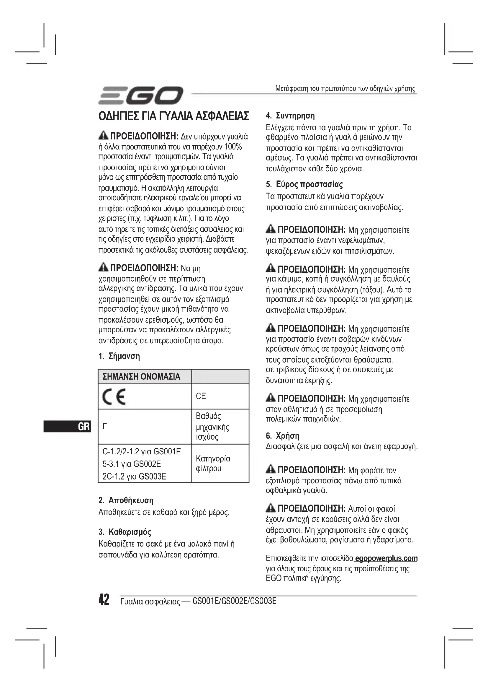 Διασφαλίζετε μια ασφαλή και άνετη εφαρμογή. ΠΡΟΕΊΔΟΠΟΊΗΣΗ: Μη φοράτε τον εξοπλισμό προστασίας πάνω από τυπικά οφθαλμικά γυαλιά. ΠΡΟΕΊΔΟΠΟΊΗΣΗ: Αυτοί οι φακοί έχουν αντοχή σε κρούσεις αλλά δεν είναι άθραυστοι. Μη χρησιμοποιείτε εάν ο φακός έχει βαθουλώματα, ραγίσματα ή γδαρσίματα. Επισκεφθείτε την ιστοσελίδα egopowerplus.com για όλους τους όρους και τις προϋποθέσεις της EGO πολιτική εγγύησης. Μετάφραση του πρωτοτύπου των οδηγιών χρήσηςGR Γυαλια ασφαλειας — GS001E/GS002E/GS003E