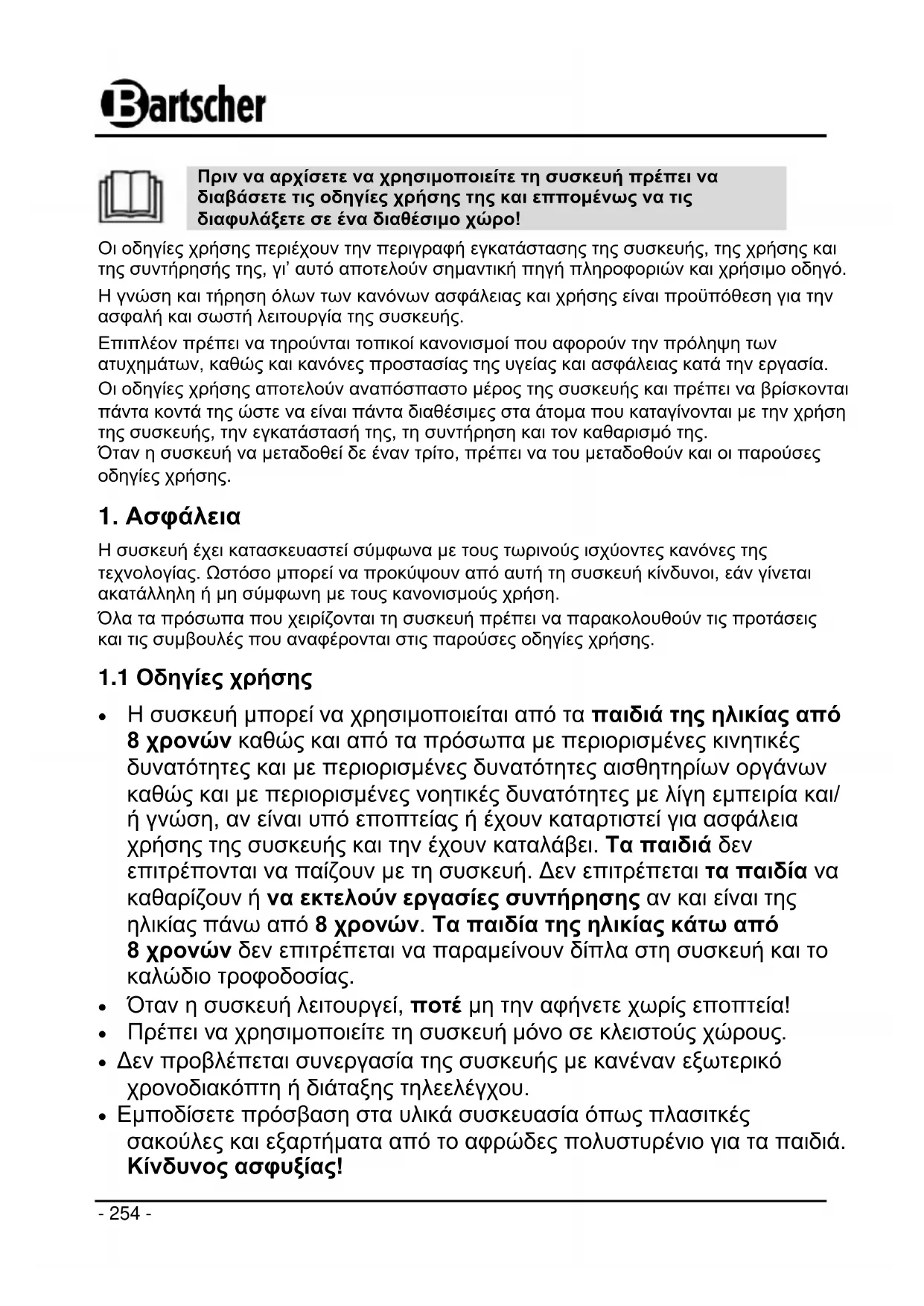Η συσκευή μπορεί να χρησιμοποιείται από τα παιδιά της ηλικίας από 8 χρονών καθώς και από τα πρόσωπα με περιορισμένες κινητικές δυνατότητες και με περιορισμένες δυνατότητες αισθητηρίων οργάνων καθώς και με περιορισμένες νοητικές δυνατότητες με λίγη εμπειρία και/ ή γνώση, αν είναι υπό εποπτείας ή έχουν καταρτιστεί για ασφάλεια χρήσης της συσκευής και την έχουν καταλάβει. Τα παιδιά δεν επιτρέπονται να παίζουν με τη συσκευή. Δεν επιτρέπεται τα παιδία να καθαρίζουν ή να εκτελούν εργασίες συντήρησης αν και είναι της ηλικίας πάνω από 8 χρονών. Τα παιδία της ηλικίας κάτω από 8 χρονών δεν επιτρέπεται να παραμείνουν δίπλα στη συσκευή και το καλώδιο τροφοδοσίας. Όταν η συσκευή λειτουργεί, ποτέ μη την αφήνετε χωρίς εποπτεία! Πρέπει να χρησιμοποιείτε τη συσκευή μόνο σε κλειστούς χώρους. Δεν προβλέπεται συνεργασία της συσκευής με κανέναν εξωτερικό χρονοδιακόπτη ή διάταξης τηλεελέγχου. Εμποδίσετε πρόσβαση στα υλικά συσκευασία όπως πλασιτκές σακούλες και εξαρτήματα από το αφρώδες πολυστυρένιο για τα παιδιά. Κίνδυνος ασφυξίας!- 255 -