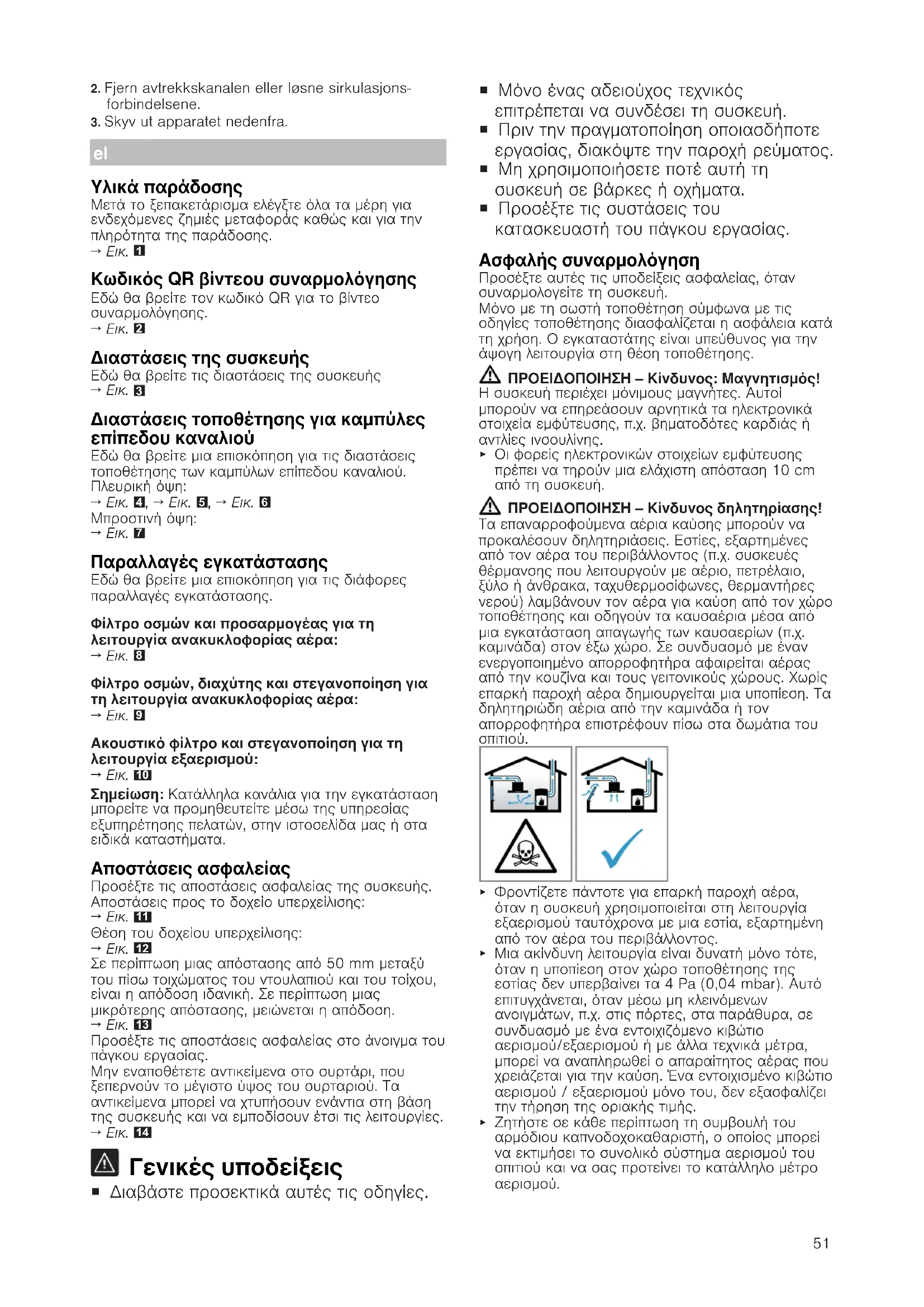 ▶ Φροντίζετε πάντοτε για επαρκή παροχή αέρα, όταν η συσκευή χρησιμοποιείται στη λειτουργία εξαερισμού ταυτόχρονα με μια εστία, εξαρτημένη από τον αέρα του περιβάλλοντος. ▶ Μια ακίνδυνη λειτουργία είναι δυνατή μόνο τότε, όταν η υποπίεση στον χώρο τοποθέτησης της εστίας δεν υπερβαίνει τα 4 Pa (0,04 mbar). Αυτό επιτυγχάνεται, όταν μέσω μη κλεινόμενων ανοιγμάτων, π.χ. στις πόρτες, στα παράθυρα, σε συνδυασμό με ένα εντοιχιζόμενο κιβώτιο αερισμού/εξαερισμού ή με άλλα τεχνικά μέτρα, μπορεί να αναπληρωθεί ο απαραίτητος αέρας που χρειάζεται για την καύση. Ένα εντοιχισμένο κιβώτιο αερισμού / εξαερισμού μόνο του, δεν εξασφαλίζει την τήρηση της οριακής τιμής. ▶ Ζητήστε σε κάθε περίπτωση τη συμβουλή του αρμόδιου καπνοδοχοκαθαριστή, ο οποίος μπορεί να εκτιμήσει το συνολικό σύστημα αερισμού του σπιτιού και να σας προτείνει το κατάλληλο μέτρο αερισμού.52 ▶ Εάν η συσκευή χρησιμοποιείται αποκλειστικά στην λειτουργία ανακυκλοφορίας αέρα, τότε η λειτουργία είναι δυνατή χωρίς περιορισμό. ΠΡΟΕΙΔΟΠΟΙΗΣΗ‒Κίνδυνος πυρκαγιάς! Οι εναποθέσεις λίπους στο φίλτρο λίπους μπορούν να αναφλεγούν. ▶ Κοντά στη συσκευή μην εργάζεστε ποτέ με ανοιχτή φλόγα (π.χ. φλαμπέ). ▶ Τοποθετείτε τη συσκευή κοντά σε μια εστία στερεών υλικών καύσης (π.χ. ξύλο ή κάρβουνο) μόνο, όταν υπάρχει ένα κλειστό, μη αφαιρούμενο κάλυμμα. Δεν επιτρέπεται να δημιουργούνται καθόλου σπινθήρες. ΠΡΟΕΙΔΟΠΟΙΗΣΗ‒Κίνδυνος τραυματισμού! Αλλαγές στην ηλεκτρική ή μηχανική δομή είναι επικίνδυνες και μπορεί να οδηγήσουν σε εσφαλμένες λειτουργίες. ▶ Μην πραγματοποιήσετε καμία αλλαγή στην ηλεκτρική ή μηχανική δομή. Εξαρτήματα, τα οποία κατά τη διάρκεια της συναρμολόγησης είναι προσιτά, μπορεί να είναι κοφτερά και να οδηγήσουν σε τραυματισμούς. ▶ Φοράτε προστατευτικά γάντια Η συσκευή είναι βαριά. ▶ Για τη μετακίνηση της συσκευής είναι απαραίτητα 2άτομα. ▶ Χρησιμοποιείτε μόνο κατάλληλα βοηθητικά μέσα. ΠΡΟΕΙΔΟΠΟΙΗΣΗ‒Κίνδυνος ασφυξίας! Τα παιδιά μπορεί να περάσουν τα υλικά της συσκευασίας πάνω από το κεφάλι ή να τυλιχτούν σ’ αυτά και να πάθουν ασφυξία. ▶ Κρατάτε τα υλικά συσκευασίας μακριά από τα
