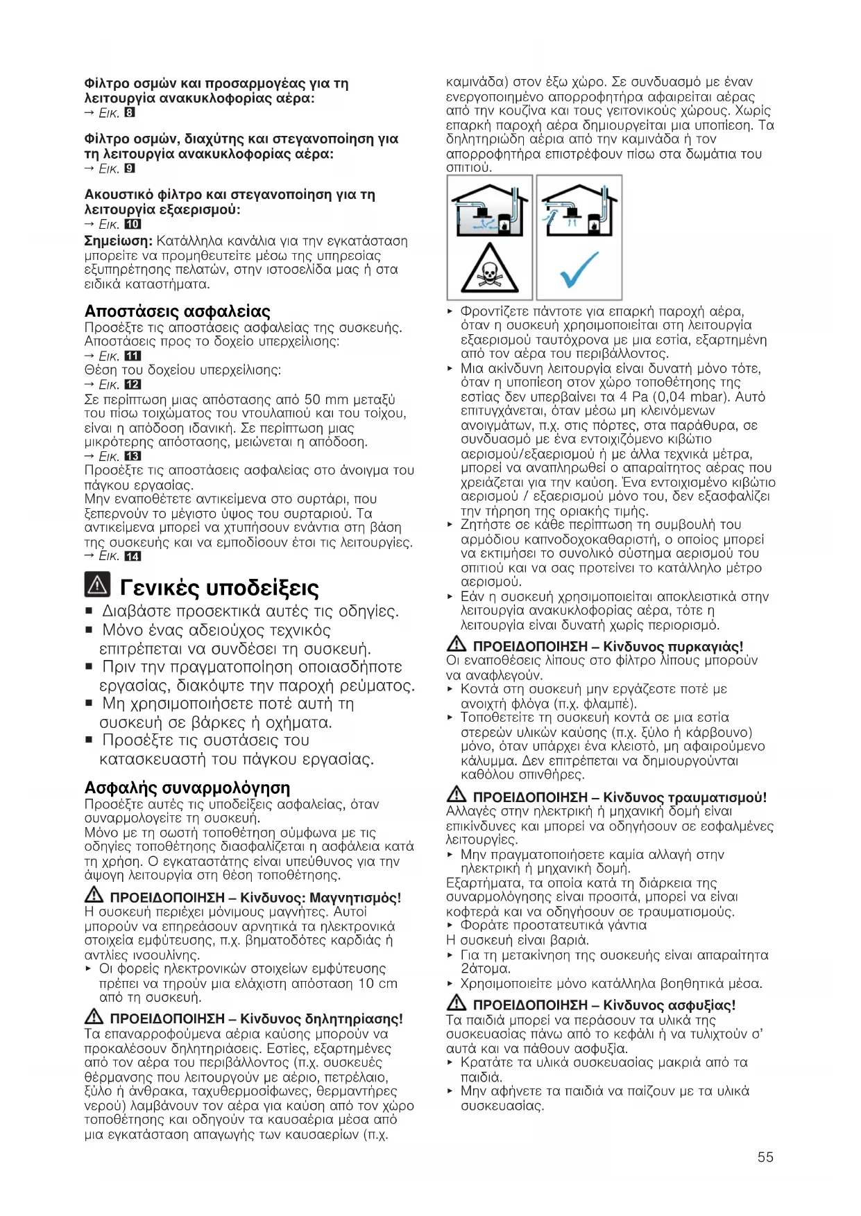 ▶ Εάν η συσκευή χρησιμοποιείται αποκλειστικά στην λειτουργία ανακυκλοφορίας αέρα, τότε η λειτουργία είναι δυνατή χωρίς περιορισμό. ΠΡΟΕΙΔΟΠΟΙΗΣΗ‒Κίνδυνος πυρκαγιάς! Οι εναποθέσεις λίπους στο φίλτρο λίπους μπορούν να αναφλεγούν. ▶ Κοντά στη συσκευή μην εργάζεστε ποτέ με ανοιχτή φλόγα (π.χ. φλαμπέ). ▶ Τοποθετείτε τη συσκευή κοντά σε μια εστία στερεών υλικών καύσης (π.χ. ξύλο ή κάρβουνο) μόνο, όταν υπάρχει ένα κλειστό, μη αφαιρούμενο κάλυμμα. Δεν επιτρέπεται να δημιουργούνται καθόλου σπινθήρες. ΠΡΟΕΙΔΟΠΟΙΗΣΗ‒Κίνδυνος τραυματισμού! Αλλαγές στην ηλεκτρική ή μηχανική δομή είναι επικίνδυνες και μπορεί να οδηγήσουν σε εσφαλμένες λειτουργίες. ▶ Μην πραγματοποιήσετε καμία αλλαγή στην ηλεκτρική ή μηχανική δομή. Εξαρτήματα, τα οποία κατά τη διάρκεια της συναρμολόγησης είναι προσιτά, μπορεί να είναι κοφτερά και να οδηγήσουν σε τραυματισμούς. ▶ Φοράτε προστατευτικά γάντια Η συσκευή είναι βαριά. ▶ Για τη μετακίνηση της συσκευής είναι απαραίτητα 2άτομα. ▶ Χρησιμοποιείτε μόνο κατάλληλα βοηθητικά μέσα. ΠΡΟΕΙΔΟΠΟΙΗΣΗ‒Κίνδυνος ασφυξίας! Τα παιδιά μπορεί να περάσουν τα υλικά της συσκευασίας πάνω από το κεφάλι ή να τυλιχτούν σ’ αυτά και να πάθουν ασφυξία. ▶ Κρατάτε τα υλικά συσκευασίας μακριά από τα