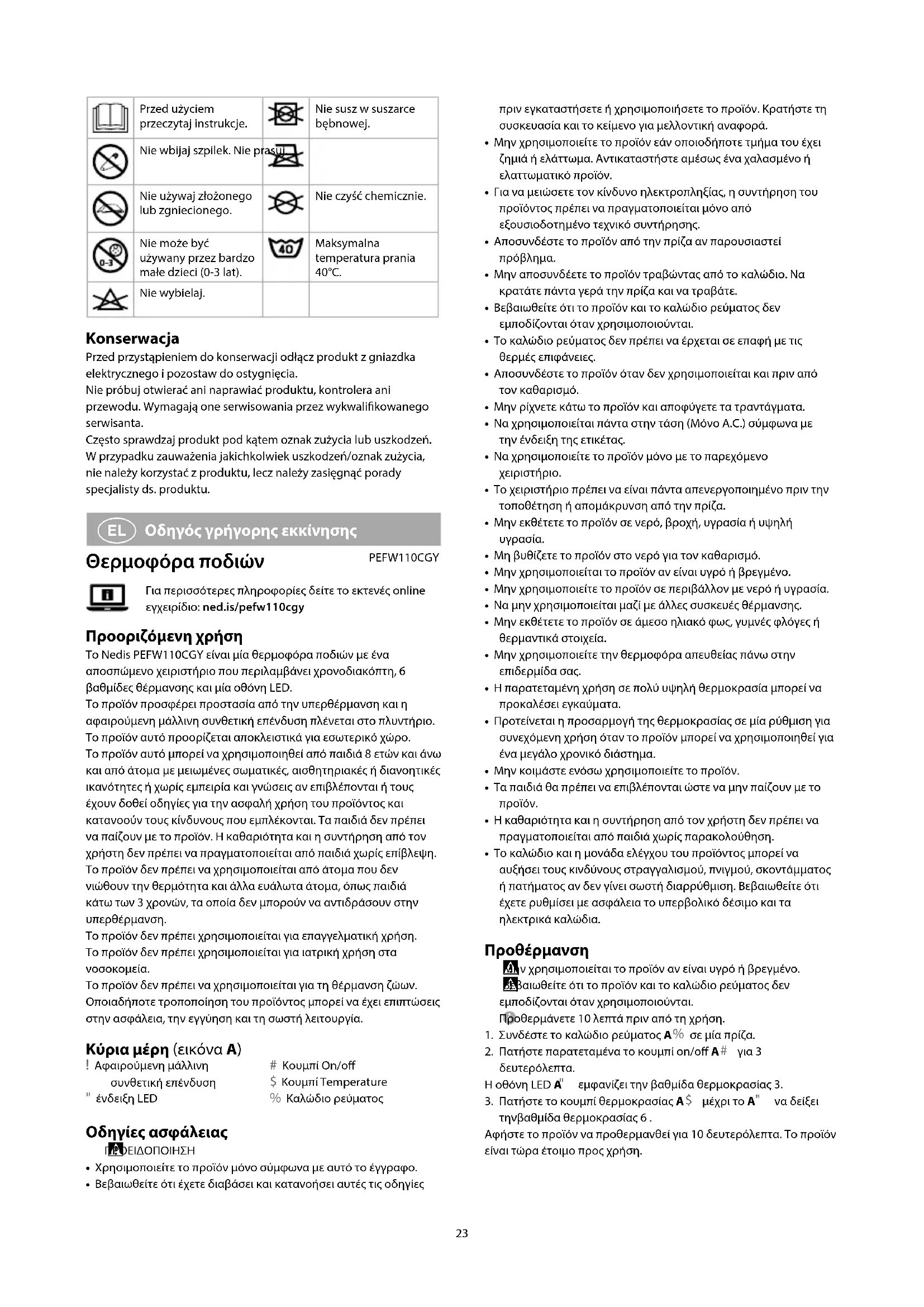 Rýchly návod Ohrievač nôh PEFW110CGYViac informácií nájdete v rozšírenom návode online:ned.is/pefw110cgy Určené použitie Nedis PEFW110CGY je ohrievač nôh s oddeliteľným ovládačom, ktorý zahŕňa časovač, 6 úrovní tepla a LED displej.Výrobok ponúka ochranu proti prehriatiu a odnímateľnú vložku zo syntetickej vlny je možné prať v práčke.Výrobok je určený len na použitie vo vnútri.Tento výrobok môžu používať deti od 8 rokov a staršie a osoby so zníženými fyzickými, zmyslovými alebo mentálnymi schopnosťami alebo s nedostatkom skúseností a znalostí iba pod dozorom alebo pokiaľ sú poučení o používaní výrobku bezpečným spôsobom a chápu súvisiace riziká. Deti sa nesmú hrať s výrobkom. Čistenie a Χρήση το προϊόντος
