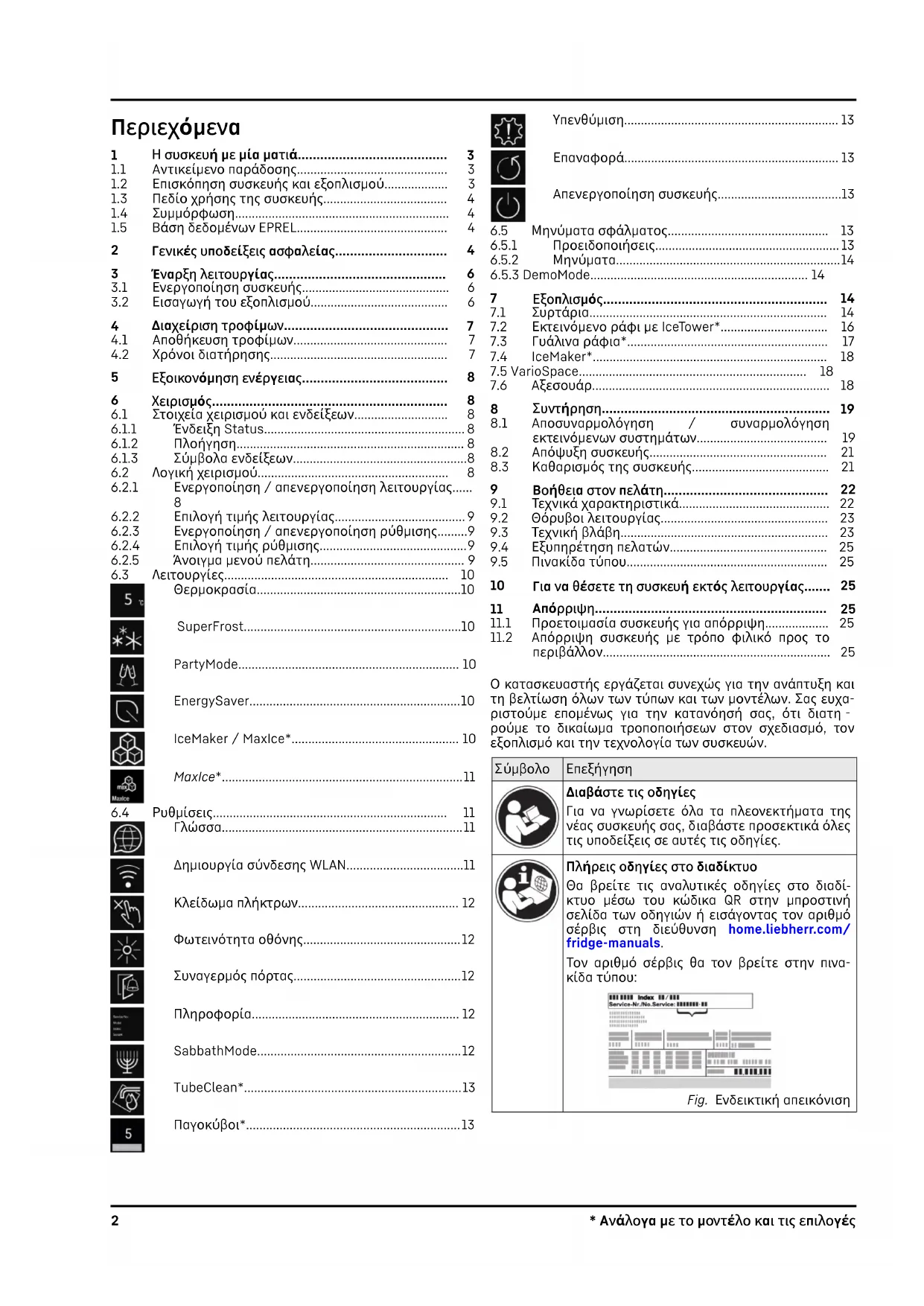 ύμβολο Επεξήγηση Διαβάστε τις οδηγίες Για να γνωρίσετε όλα τα πλεονεκτήματα της νέας συσκευής σας, διαβάστε προσεκτικά όλες τις υποδείξεις σε αυτές τις οδηγίες. Πλήρεις οδηγίες στο διαδίκτυο Θα βρείτε τις αναλυτικές οδηγίες στο διαδί- κτυο μέσω του κώδικα QR στην μπροστινή σελίδα των οδηγιών ή εισάγοντας τον αριθμό σέρβις στη διεύθυνση home.liebherr.com/ fridge-manuals. Τον αριθμό σέρβις θα τον βρείτε στην πινα‐ κίδα τύπου: Fig. Ενδεικτική απεικόνιση 2 * Ανάλογα με το μοντέλο και τις επιλογέςΣύμβολο Επεξήγηση Έλεγχος συσκευής Ελέγξτε όλα τα μέρη για ζημιές από τη μεταφορά. Σε περίπτωση παραπόνων απευ‐ θυνθείτε στον έμπορο ή στην εξυπηρέτηση πελατών.Αποκλίσεις Οι οδηγίες ισχύουν για περισσότερα μοντέλα, ενδέχεται να υπάρχουν αποκλίσεις. Οι ενότητες που αφορούν μόνο συγκεκριμένες συσκευές επισημαίνονται με αστερίσκο (*). Οδηγίες ενεργειών και αποτελέσματα ενερ‐ Οι οδηγίες ενεργειών επισημαίνονται με ένα